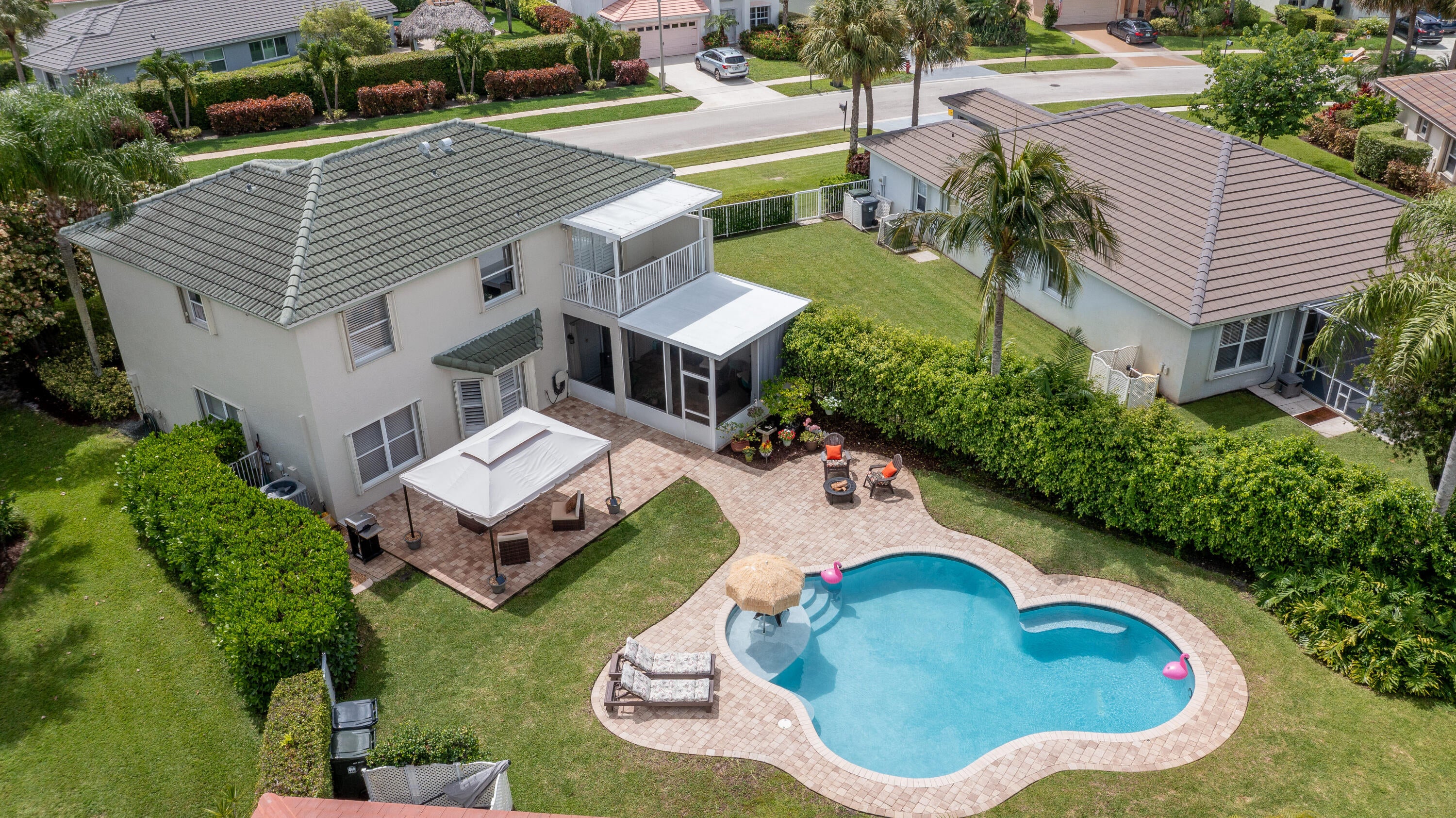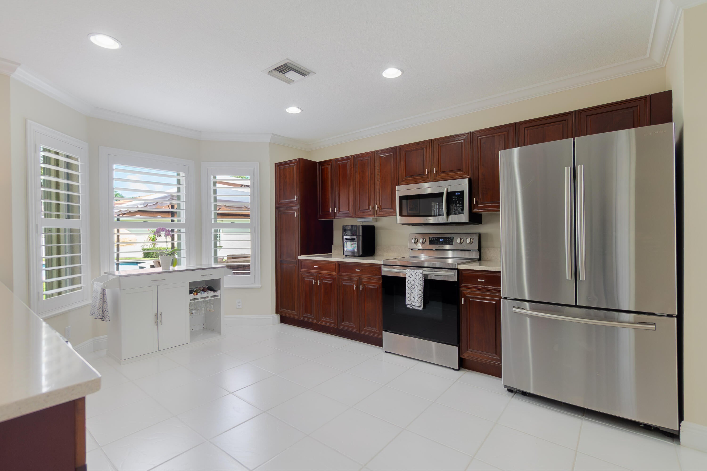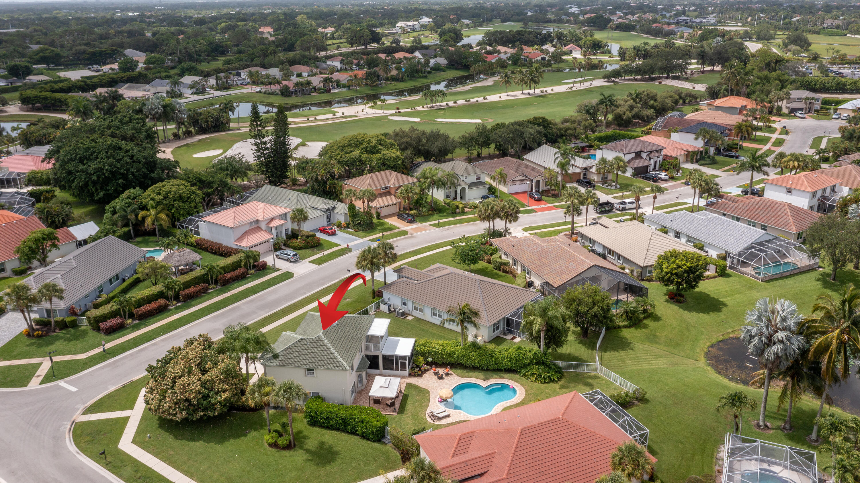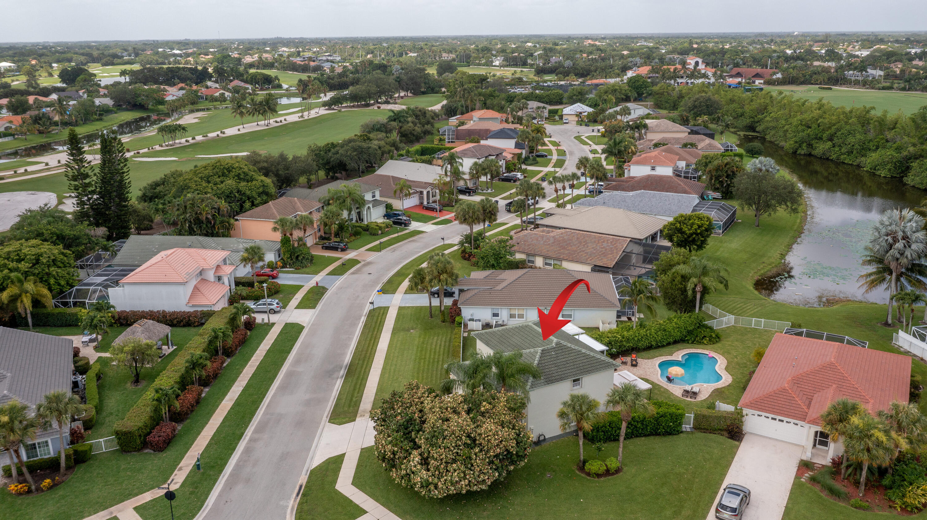 Welcome to this fantastic 4 bedroom 2.5 bathroom pool home situated on a premium corner lot with fantastic lake views! Well maintained large yard with beautiful pool, oversized pool deck, covered screened patio, lush landscaping and fenced for privacy. Property has new water heater, newer roof (2022), hurricane shutters for quick and easy storm protection, newer kitchen appliances and quartz countertop, newer paint inside and out, window and sliding door plantation shutters, tile and luxury vinyl flooring throughout, no carpet! Master bedroom has a covered balcony for extra outdoor space and beautiful view of the lake. Lakefield North is a well maintained gated community zoned for excellent schools and just a golf cart ride away to equestrian activities, polo and several golf courses