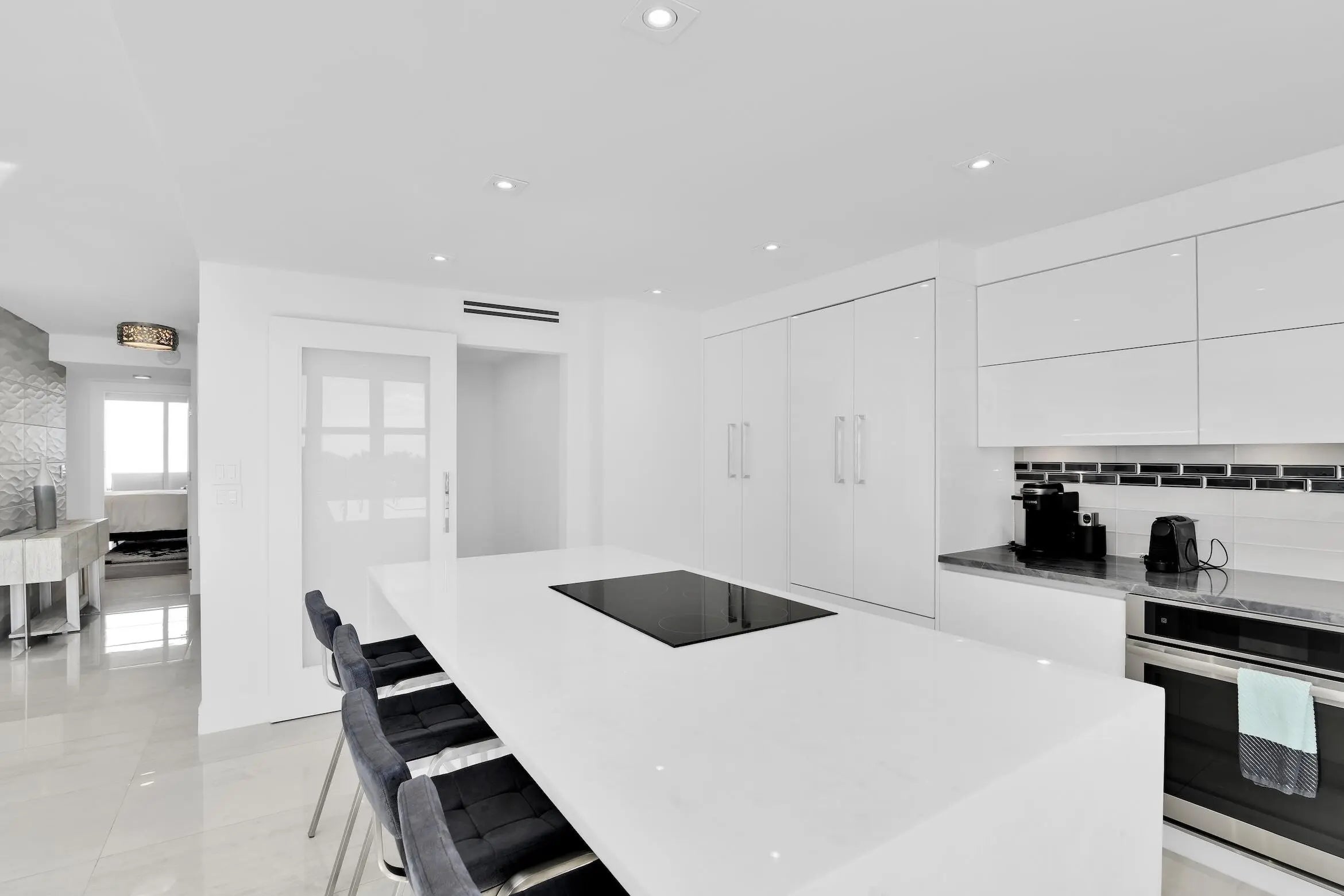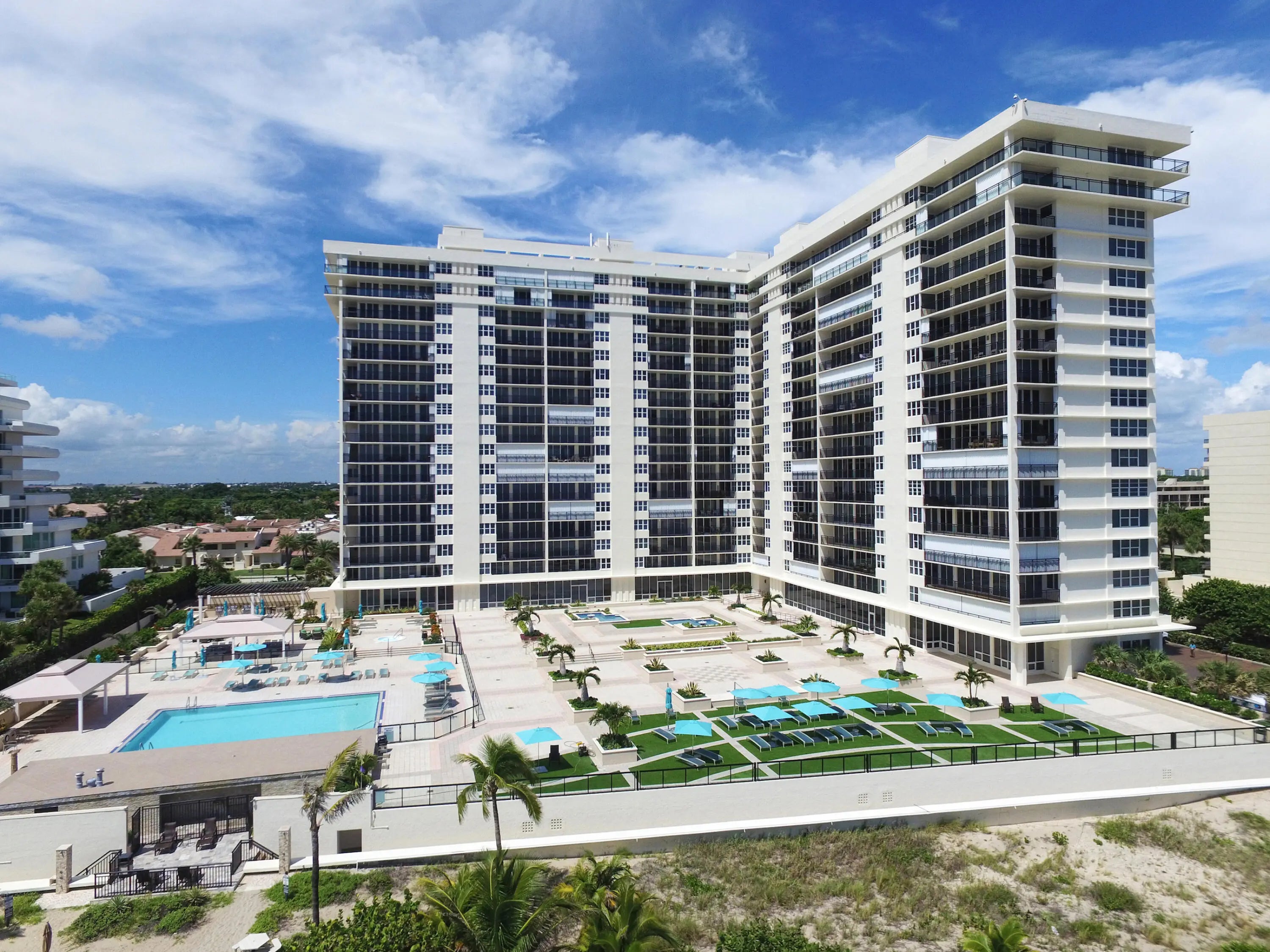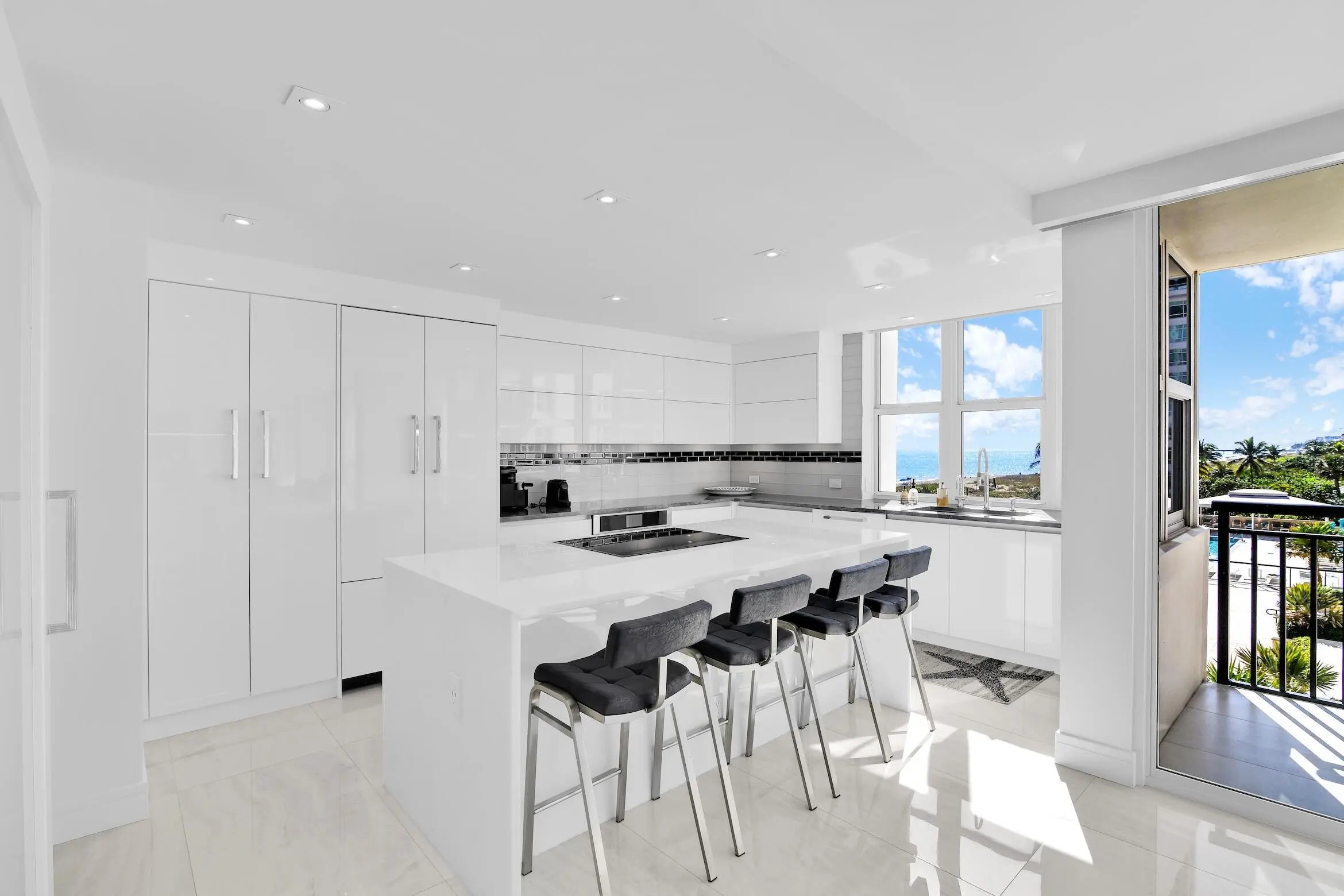This extraordinary oceanfront residence was completely renovated down to the studs in 2020/2021, reimagined with uncompromising attention to detail, superior craftsmanship, and the finest materials throughout. Offering 3 bedrooms and 2.5 bathrooms in a highly sought-after split-bedroom floor plan, this ultra-luxurious condo enjoys breathtaking ocean views from every room. A semi-private elevator lobby leads to a double-door private entry with remote WiFi access, setting the tone for the sophistication that awaits. Upon entering, you are immediately captivated by floor-to-ceiling glass sliders framing endless views of sun, surf, and sand, filling the residence with natural light and coastal elegance. The fully opened gourmet kitchen is a showpiece, featuring quartz countertops,