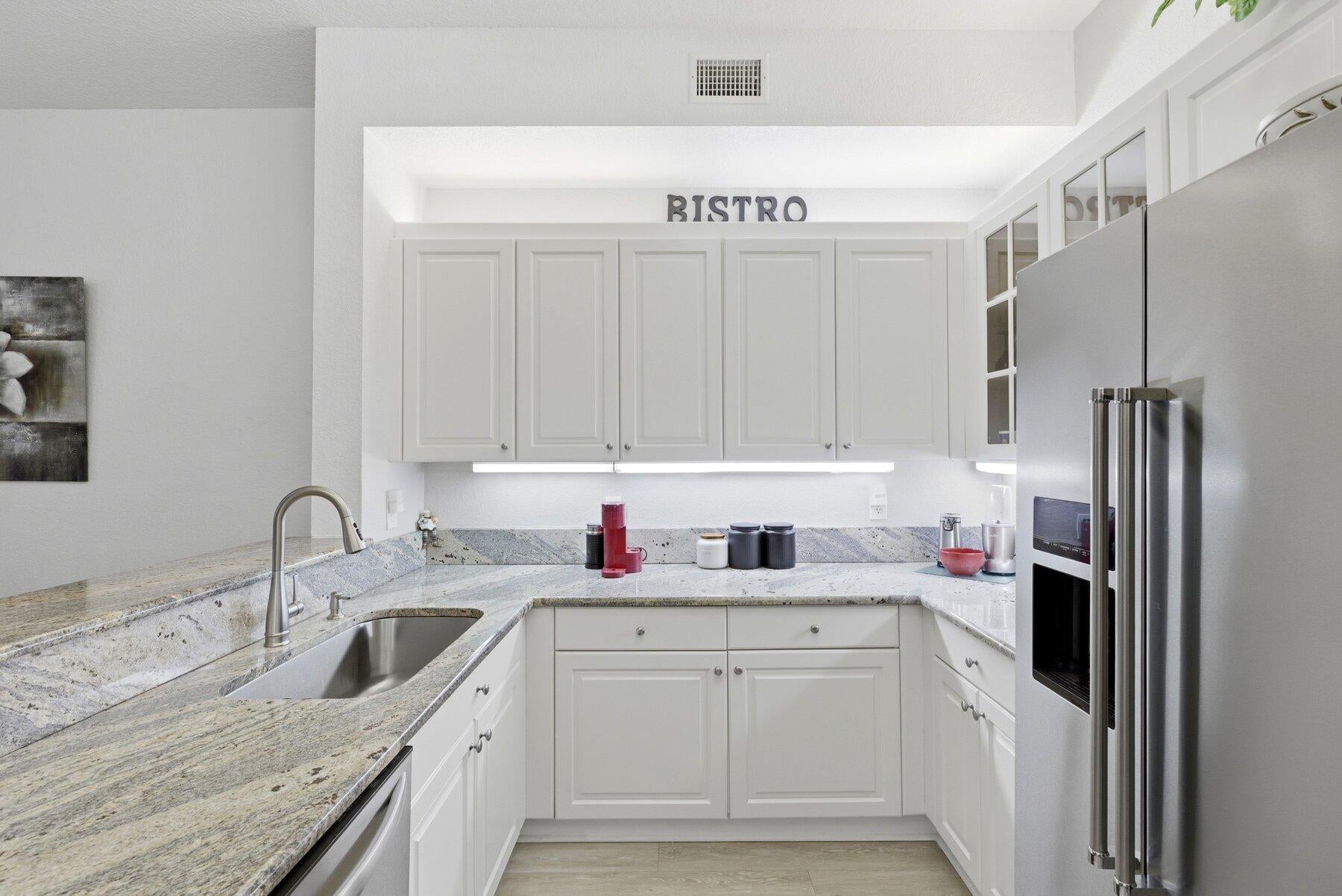 Experience the pinnacle of sophisticated living in this exquisitely updated 2-bedroom, 2-bathroom residence located in the prestigious Kings Point community. Meticulously redesigned for the modern homeowner, the interior showcases a stunning chef's kitchen complete with elegant granite countertops and premium stainless steel appliances. This culinary heart of the home flows seamlessly into a formal dining area, creating an inviting atmosphere perfect for both intimate dinners and lively entertaining. Both bathrooms have been thoughtfully transformed into spa-like retreats, balancing contemporary aesthetics with high-end finishes to ensure a peaceful daily experience.The living space extends naturally onto a private, sun-drenched patio, offering a serene vantage point to enjoy views of the manicured gardens and the nearby community pool. Practicality meets luxury with the inclusion of an attached one-car garage, a spacious driveway for guest parking, and clever storage solutions throughout the home. Beyond your front door, the Kings Point lifestyle awaits, centered around a grand clubhouse that hosts a vibrant array of social clubs, a state-of-the-art theater, professional-grade tennis courts, and multiple resort-style pools. Perfectly positioned near upscale shopping and fine dining, this move-in-ready condo offers an unparalleled opportunity to enjoy luxury, convenience, and a thriving community spirit.