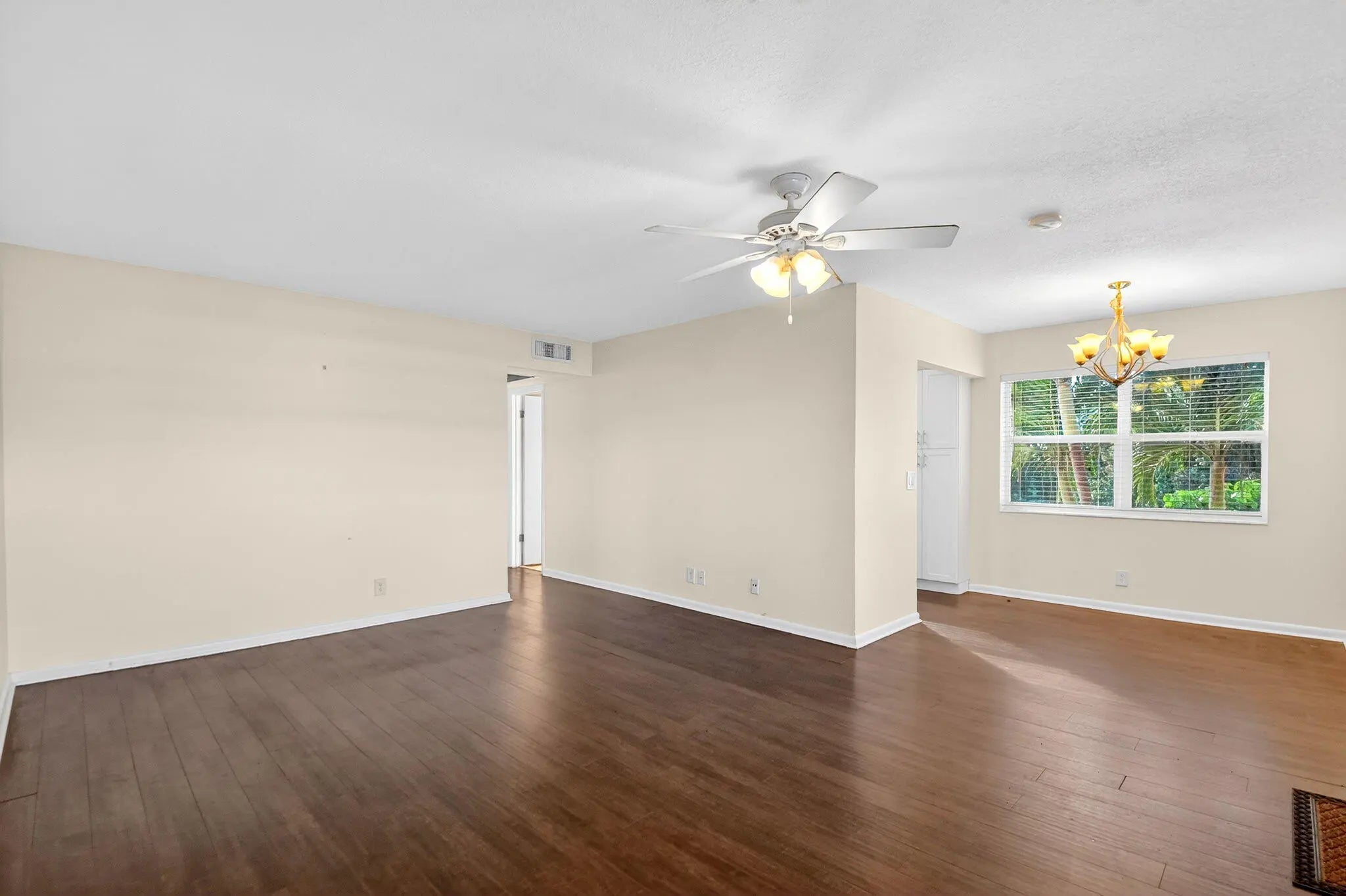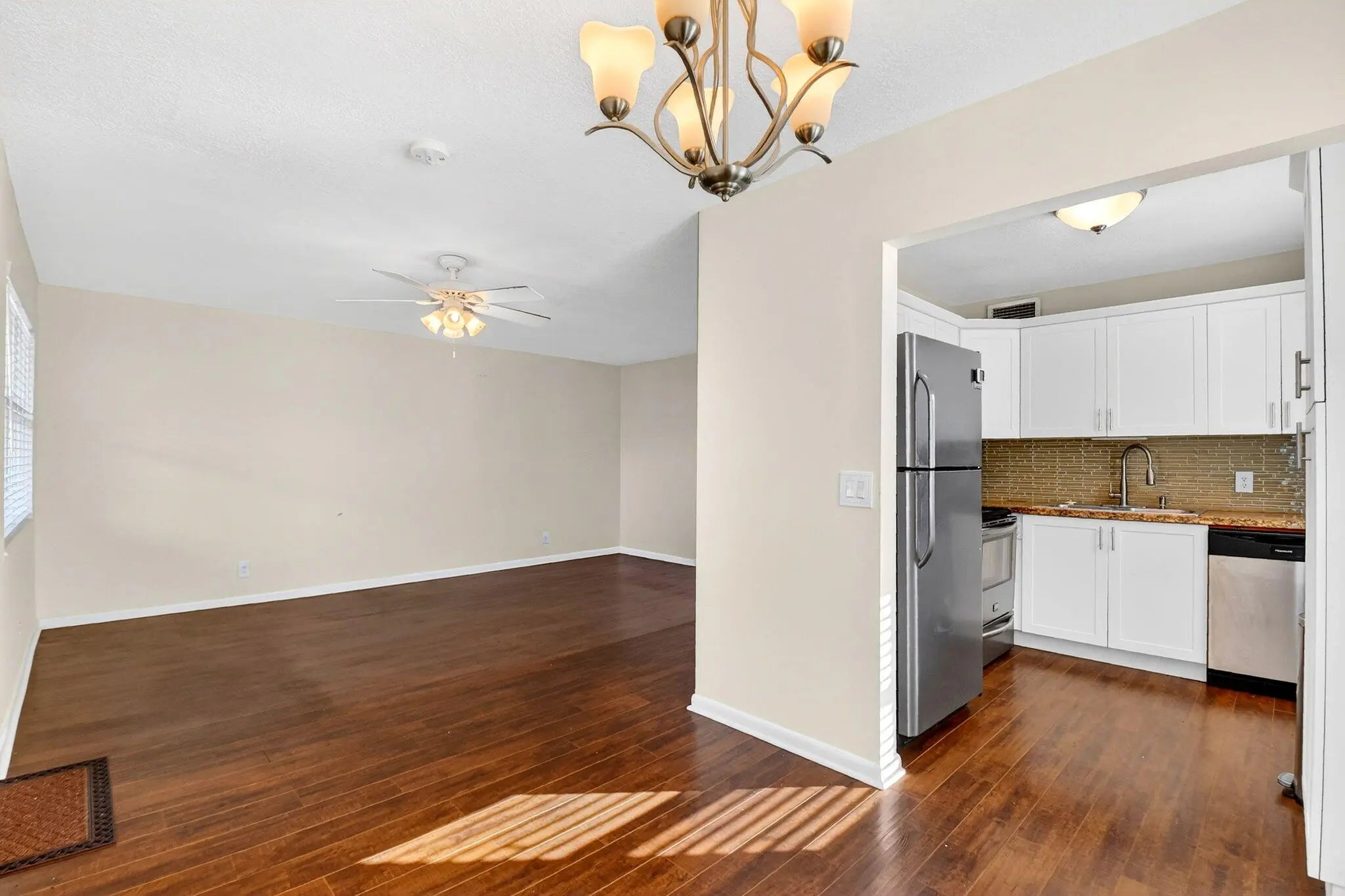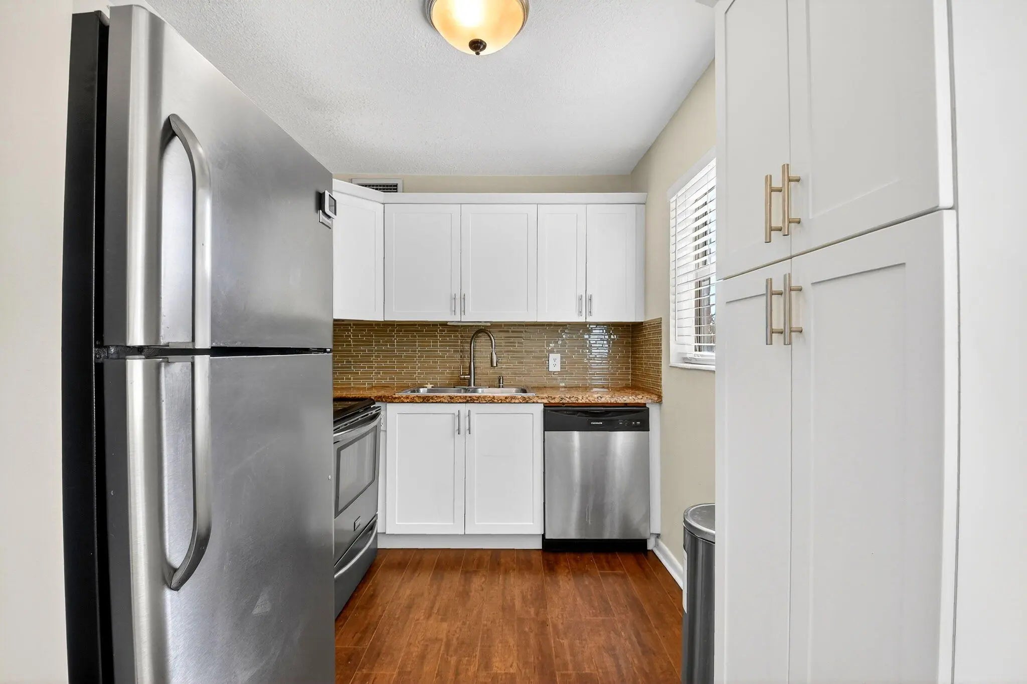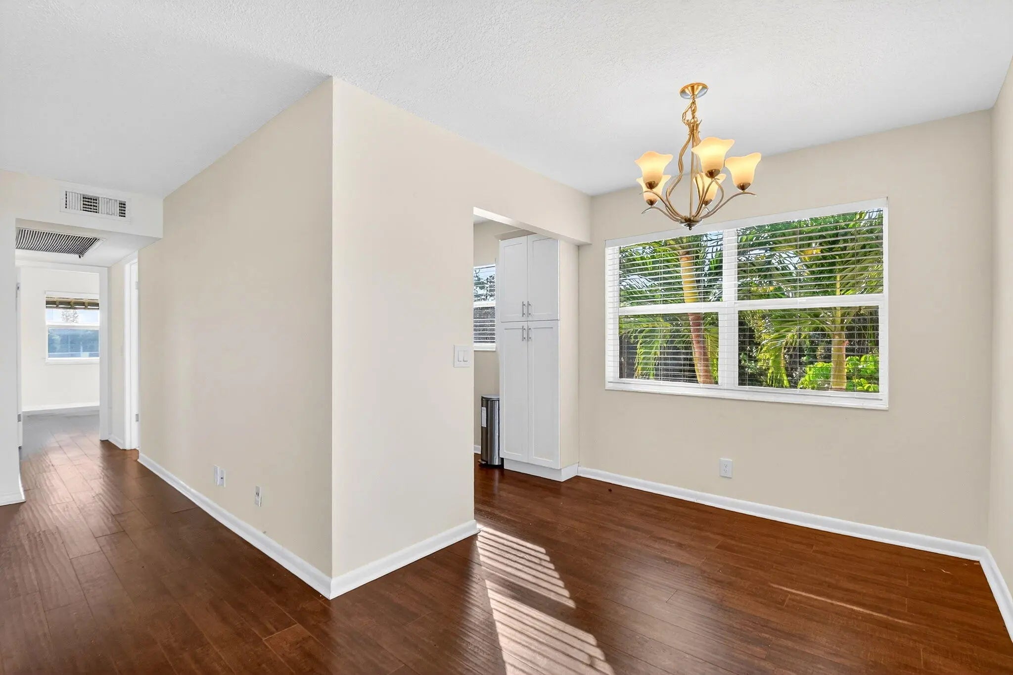 Beautifully updated corner residence with serene water views in Century Village in West Palm Beach. This spacious 2-bedroom, 1.5-bath corner unit offers a bright, refreshed kitchen with crisp white shaker style cabinetry, granite countertops, and stainless steel appliances. Rich, wood-style flooring extends throughout the home, adding warmth and continuity. Sliding glass doors lead out to a private, screened-in balcony with tranquil lake views. Hurricane-impact windows provide peace of mind. The well-kept building recently received a new roof in 2022. Century Village is an active, resort-inspired 55+ community ideally situated in central Palm Beach County. Residents enjoy an impressive array of amenities, including live entertainment, movie screenings, social clubs, multiple swimming