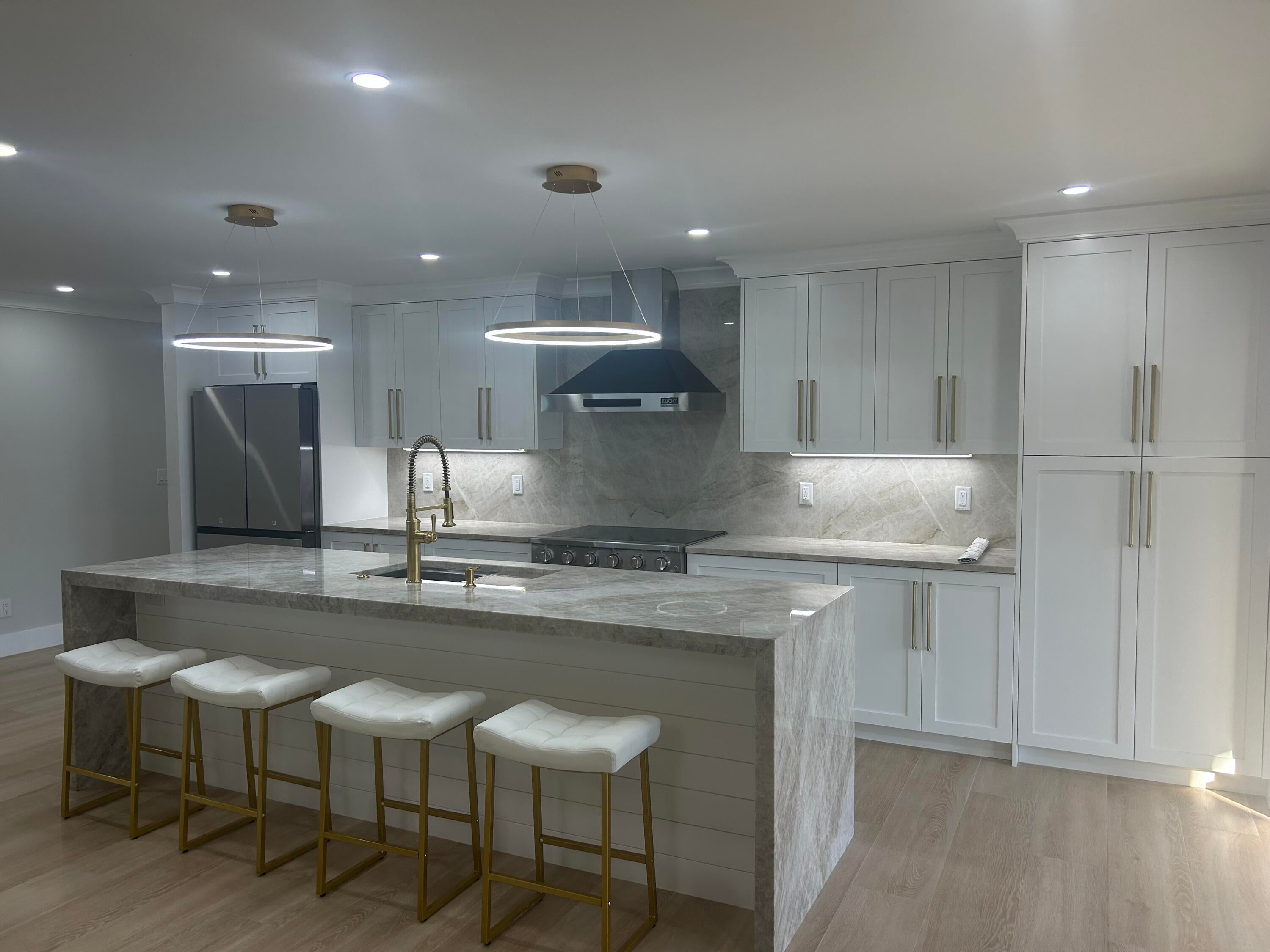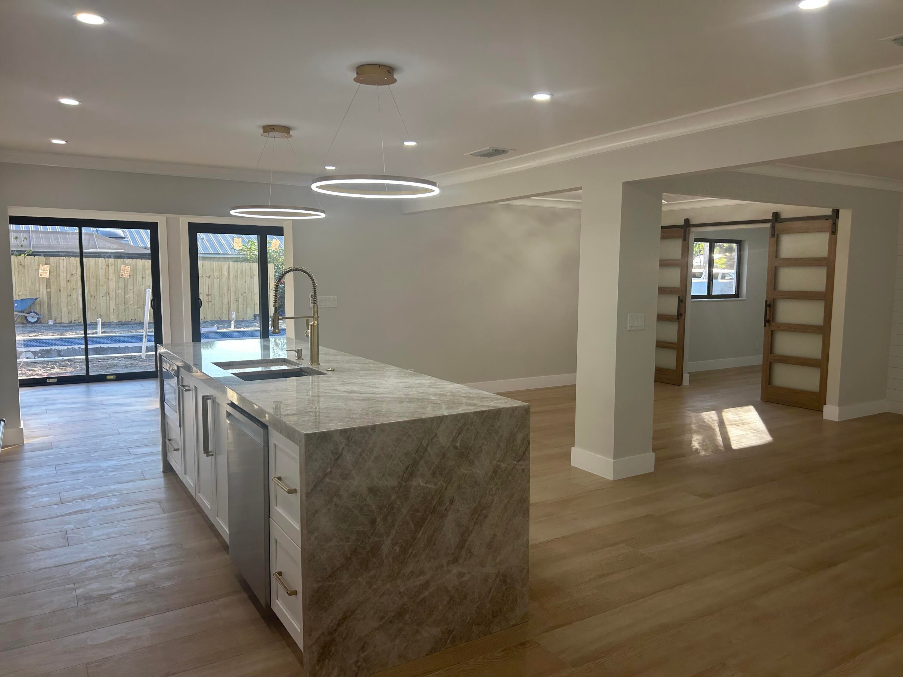 WALK TO BEACH! No expense spared in reinventing this exquisite true 3-bedroom home w/den. Major improvements completed in 2026 include a new roof, impact glass doors and sliders, full electrical rewire w/new panel, new plumbing and sewer lines, spray foam insulation, new ductwork, and new A/C unit and handler. The stunning brand-new pool with raised spa features a sundeck, pool heater, and saltwater system, creating a private resort-style oasis.The chef's kitchen showcases ALL-AMERICAN custom wood cabinetry, Taj Mahal quartzite countertops, full backsplash, and a grand waterfall island. Designer finishes abound throughout, including beach oak porcelain tile flooring, crown molding, upgraded baseboards, solid wood core doors, LED recessed lighting, and statement light fixtures and fansThe baths have been tastefully redesigned with new tile, vanities, and glass-enclosed shower/tub combinations. Additional highlights include an oversized laundry room with sink and upper and lower cabinetry, and a versatile denideal as a home office or gaming roomenclosed with a stylish barn door. The outdoor space impresses with a new fence, fresh landscaping, nearly 3,000 square feet of French-pattern marble decking, a putting green, and an outdoor shower. Modern conveniences include EV charging, epoxy garage floor, impact garage door, Ring doorbell, smart appliances, and a custom living room wall with electric fireplace. The primary suite is a true retreat, featuring a massive 8x14 custom closet and a spa-inspired 6x6 shower with bench, niche, six jets, double-door entry, rain head, standard head, and handheld feature. Natural light pours in from the moment you step off the brand-new driveway through the custom front door into the open, entertainer-friendly main living area.