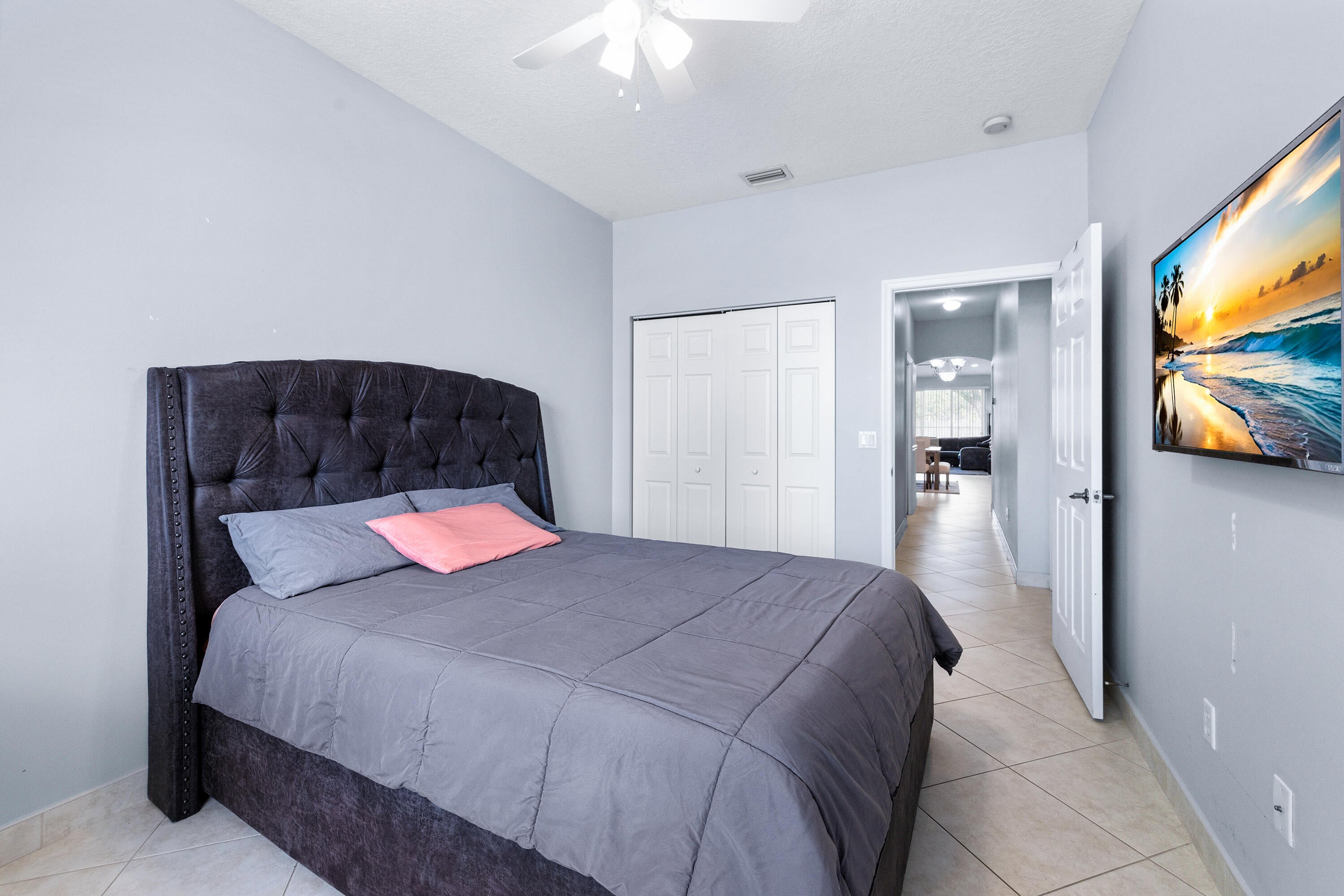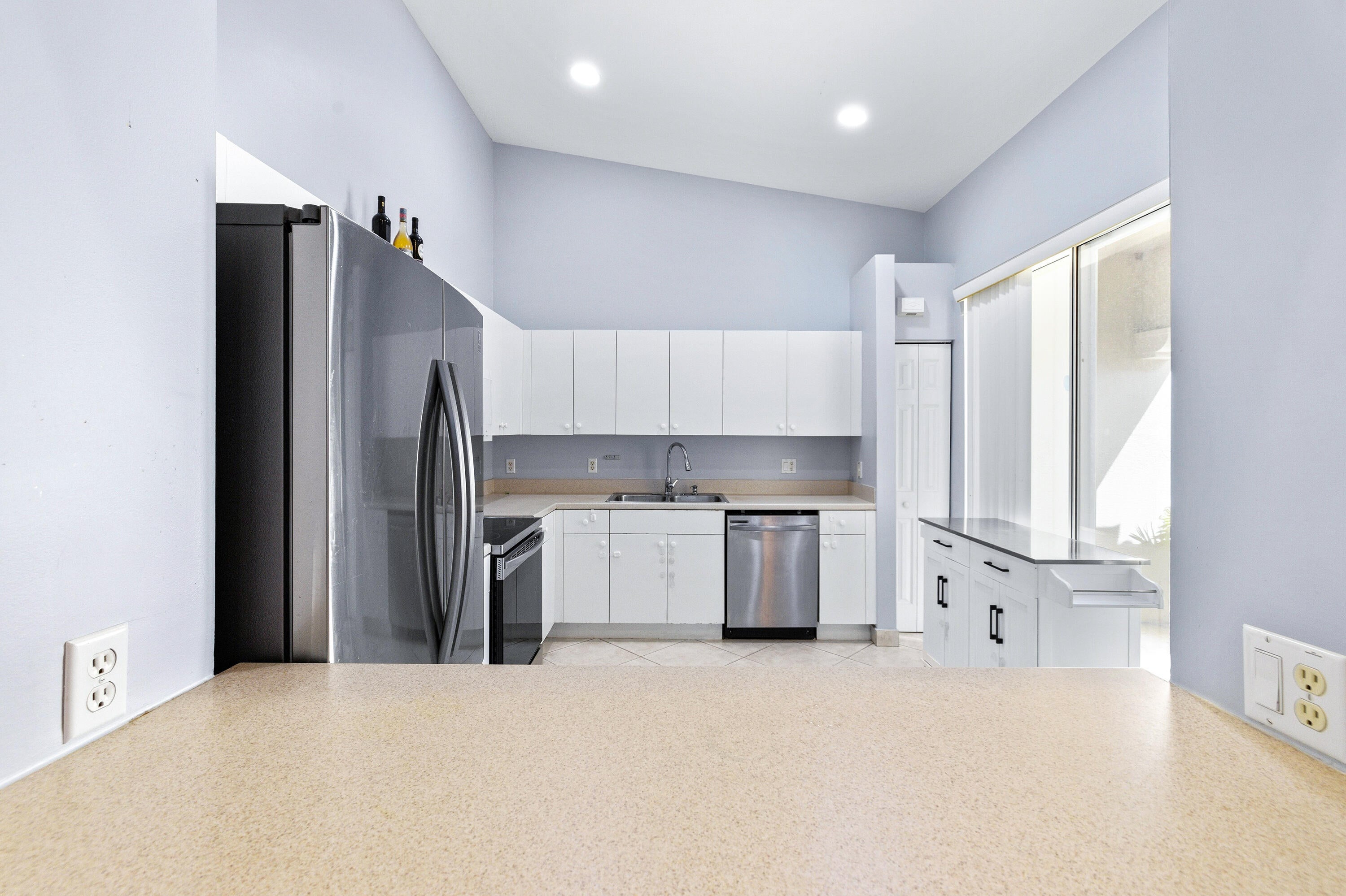 This spacious 3 bedroom, 2 bathroom, 1-car garage villa with a fenced in yard is a perfect opportunity to live in a great gated community with fantastic amenities! There is tile laid diagonally. Vaulted ceilings make the unit feel airy and open. The kitchen is equipped with stainless steel appliances (newer stove, refrigerator, and dish washer 2021), plenty of cabinets, and pantry. The primary bedroom features an elegant tray ceiling and a walk-in closet. The primary bathroom offers dual sinks, a jacuzzi tub and shower combo. The guest bathroom is completed with a tub and a glass enclosure. The third bedroom is a den that can be used as a bedroom. The laundry room offers a full size washer and dryer and a sink. Benefit from the HOA covering roof and driveway cleaning, exterior paint every5 years, plus cable, alarm system, and internet. The roof was replaced in 2013 and the water heater in 2025. Andros Isle is a fantastic, pet friendly community featuring two pools and Jacuzzi, sauna, clubhouse, six tennis courts, fitness center, playground, billiard and card rooms, bocce ball, basketball court, BBQ area and manned gate. The development is conveniently located to grocery stores and shopping plazas. Take a quick ride to I-95, PBI airport, Palm Beach Outlets, downtown West Palm Beach, turnpike Jog Road/Pike Road, and Rosemary Square featuring fantastic restaurants and shops. The beach and fabulous Palm Beach Island are 12 miles away. All measurements are approximate. Take a look at 3D virtual walkthrough.