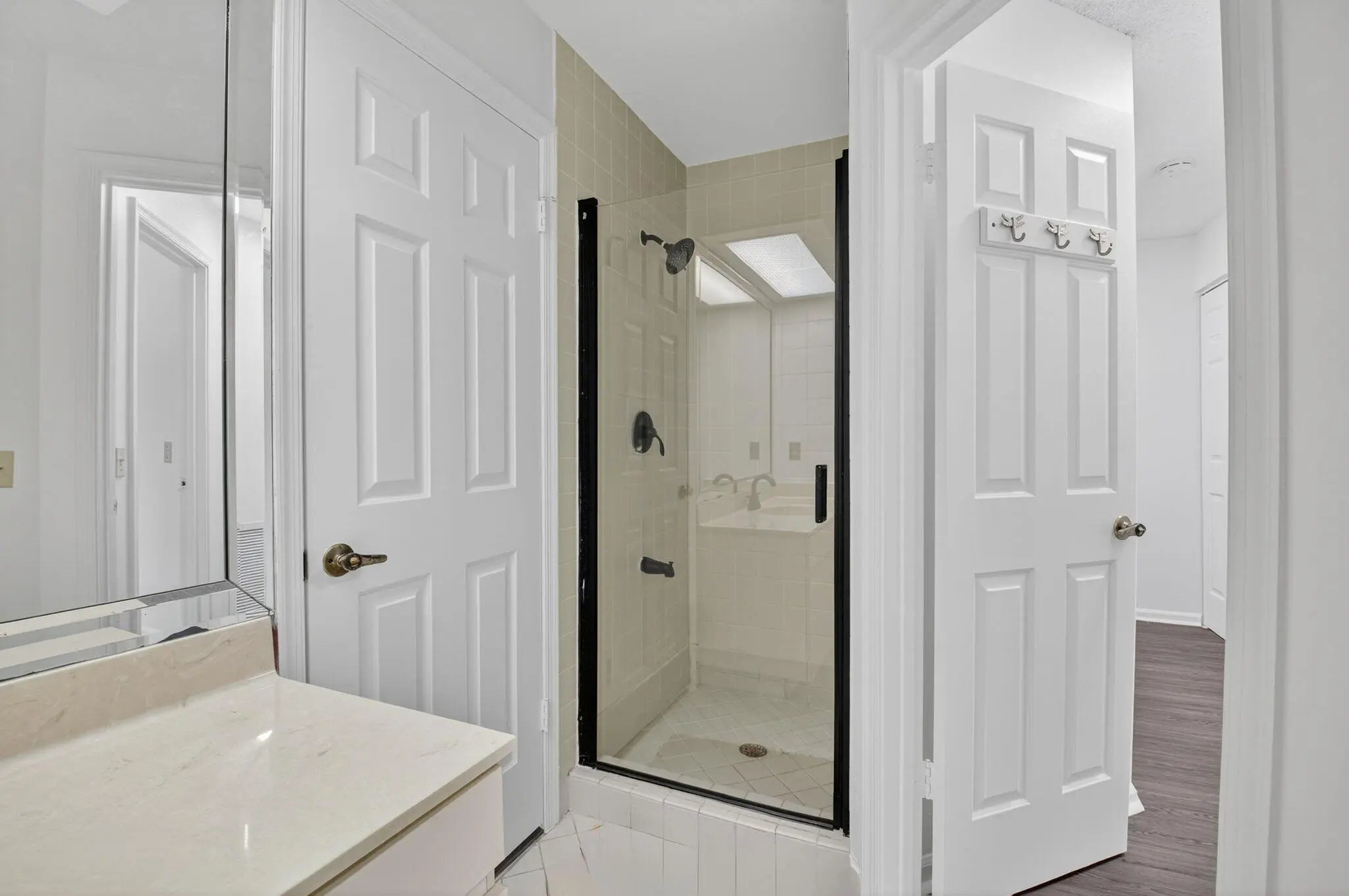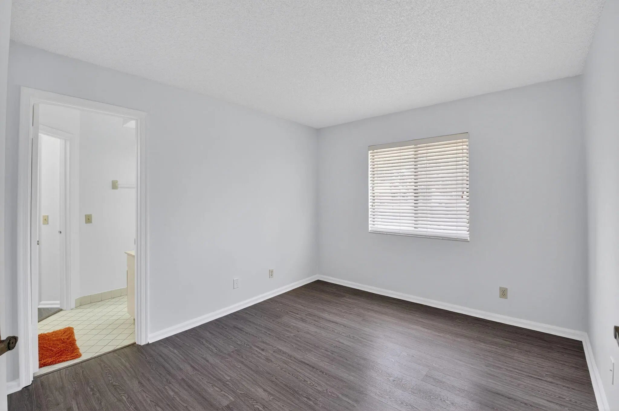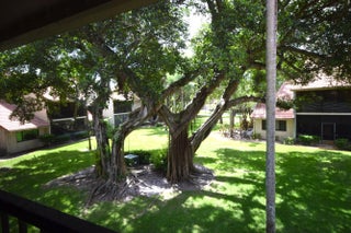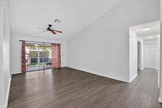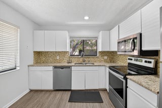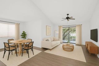 Tucked away on a quiet cul-de-sac in the all-ages Coach Houses of Town Place community, this spacious 3-bedroom, 2-bath home with a 1-car garage offers peace, privacy, and convenience. This is a highly desirable corner unit offering abundant natural light and a private front door entrance. The freshly painted interior features wood-look laminate flooring and vaulted ceilings, creating an open and airy feel throughout. Enjoy a large eat-in kitchen, separate dining area, and a comfortable living room - perfect for entertaining. Step out onto the expansive screened-in balcony and take in views of a lush green area shaded by a mature banyan tree. The stacked bedroom floor plan includes a primary suite with a walk-in closet and an ensuite bathroom featuring dual sinks and a sunken tub. Two