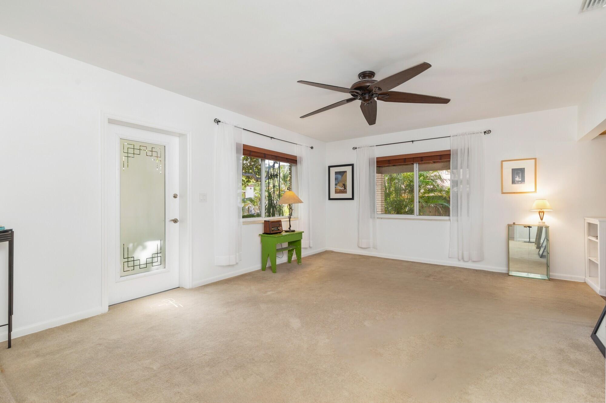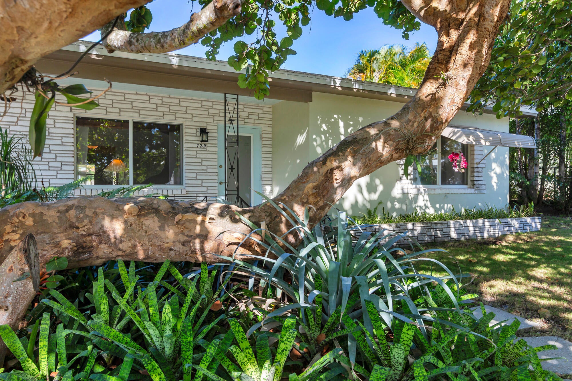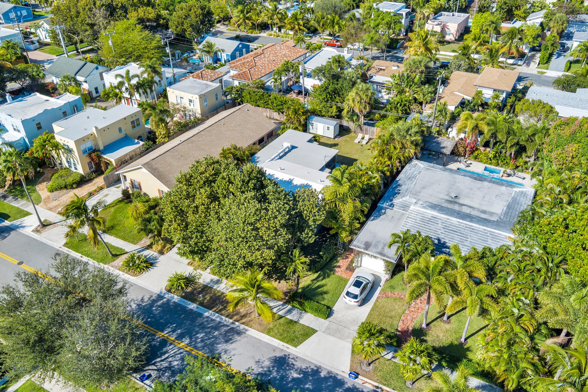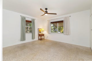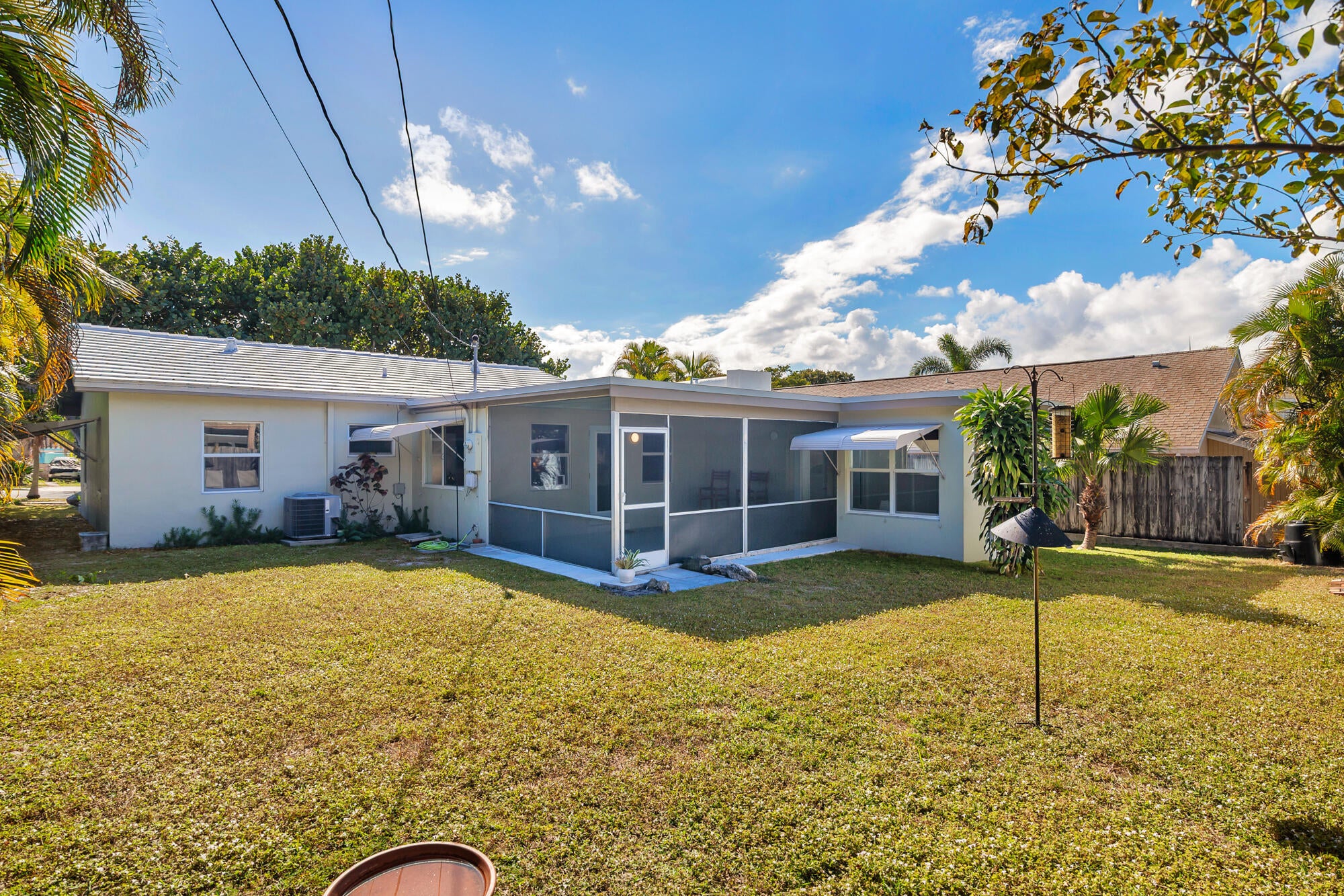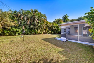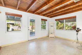 Splendid Mid-Century CBS home on the 'Hill Block' of Historic Flamingo Park! Two large mature Sea Grape trees frame the home and canopy the paved walkway leading up to the residence. Covered front porch greets guests. The home opens up to a bright & airy living room. The kitchen features stainless steel appliances and under cabinet lighting. Terrazzo floors and impact windows and doors throughout. Overlooking the backyard, the enclosed Florida room with exposed beams leads to the covered screened patio. The home has a split floor plan with 2BR/1BTH in the east wing and 1BR/1BTH in the north wing. The private backyard has a large detached shed and has room for a patio and a pool. Property features 2024 roof. Close proximity to Palm Beach Island, CityPlace, Antique Row, and PBIA.