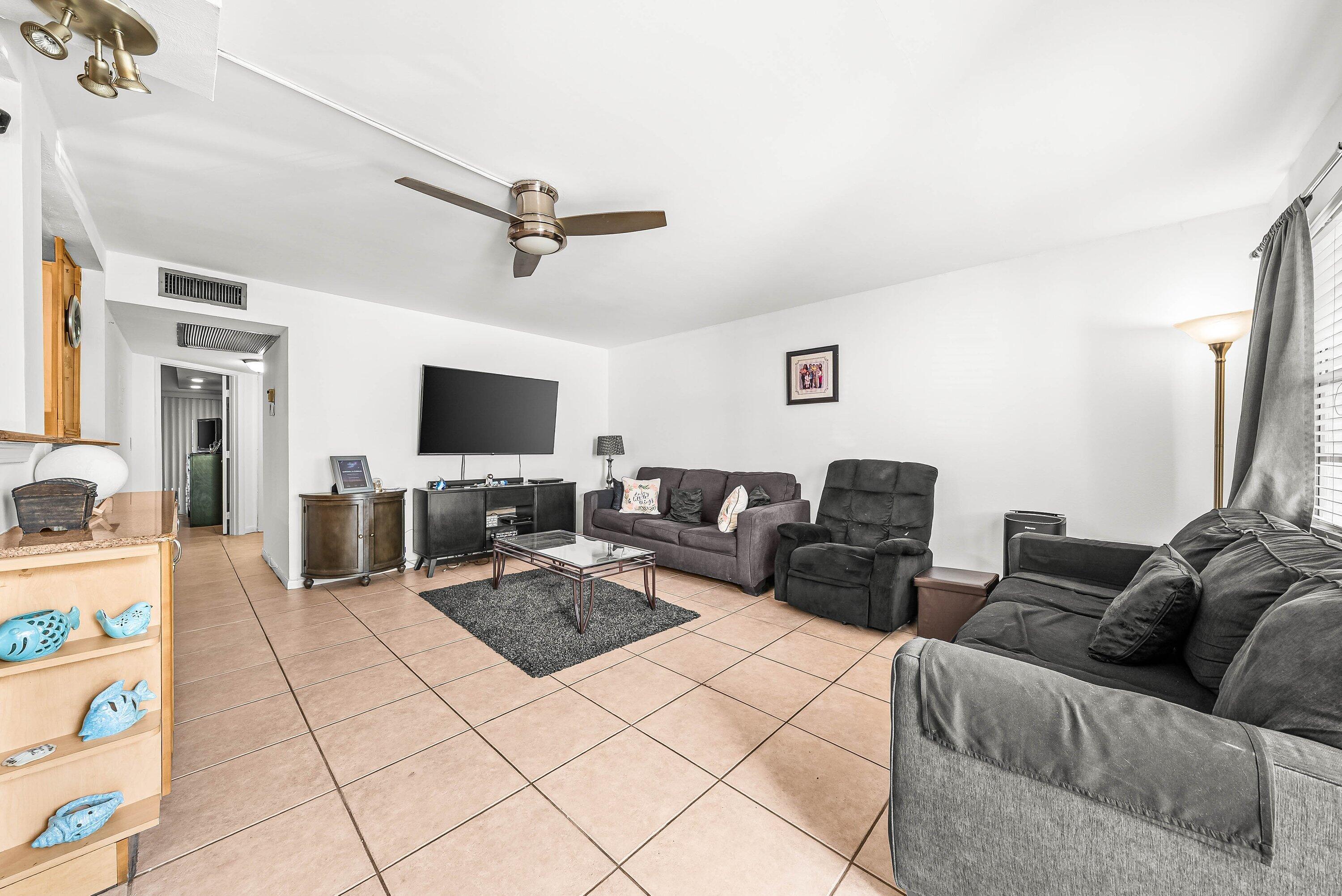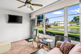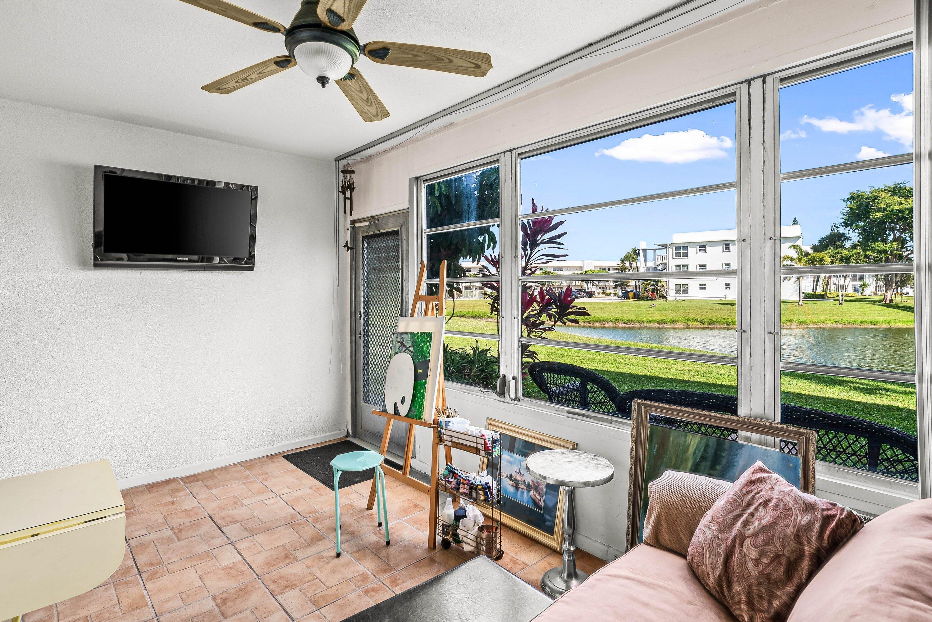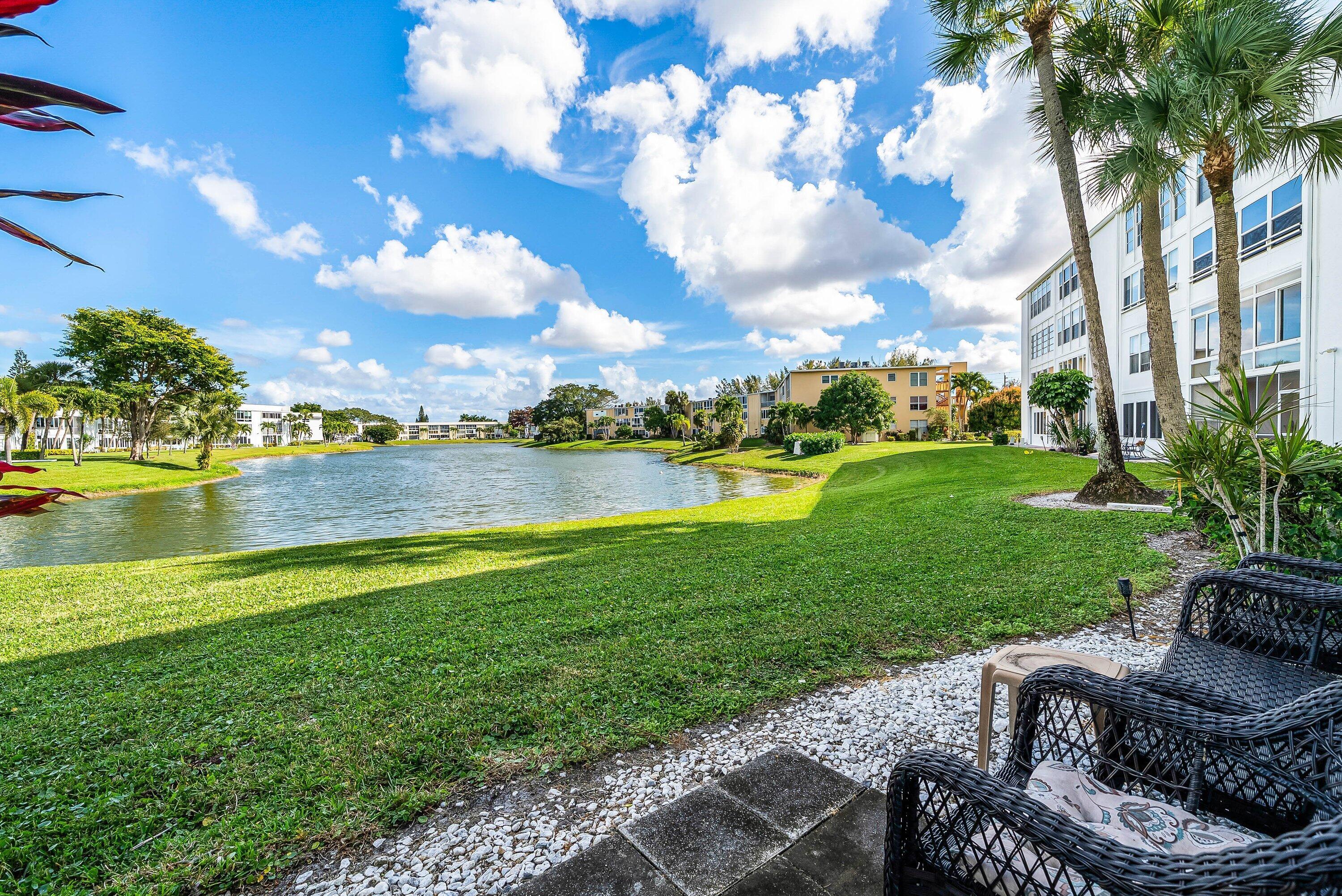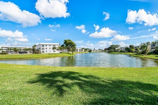 Rare! Park near your front door! Large 2-bedroom, 2-bath unit with breathtaking lake views from inside and outside your home! Enclosed patio with air-conditioning and adjacent outdoor patio area facing lake. Updated open kitchen and updated bathrooms. Tile throughout. Large walk-in closet and large closet in 2nd bedroom. Stainless-steel appliances. Wider doorways for easy access. Unit comes with extra storage locker. Resort-Style Amenities: theater with shows/movies, clubs, transportation service. CLubhouse features theater, indoor pool, two outdoor pools, card room, community/party room, billiard room, shuffleboard, tennis, pickleball, and bocce. Several heated outdoor pools throughout community, resistance pool. Guard gated entry and 24hr security patrol.