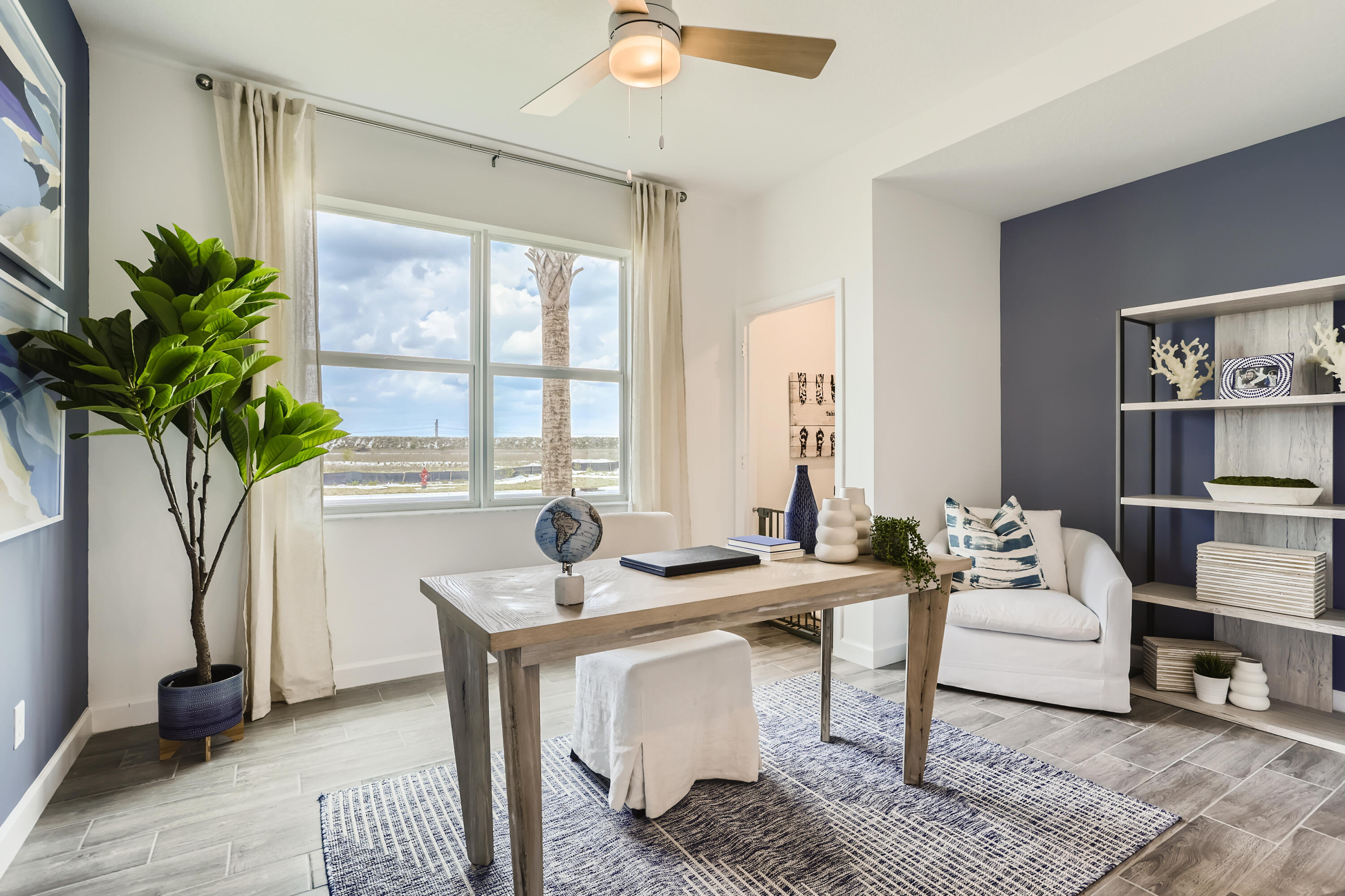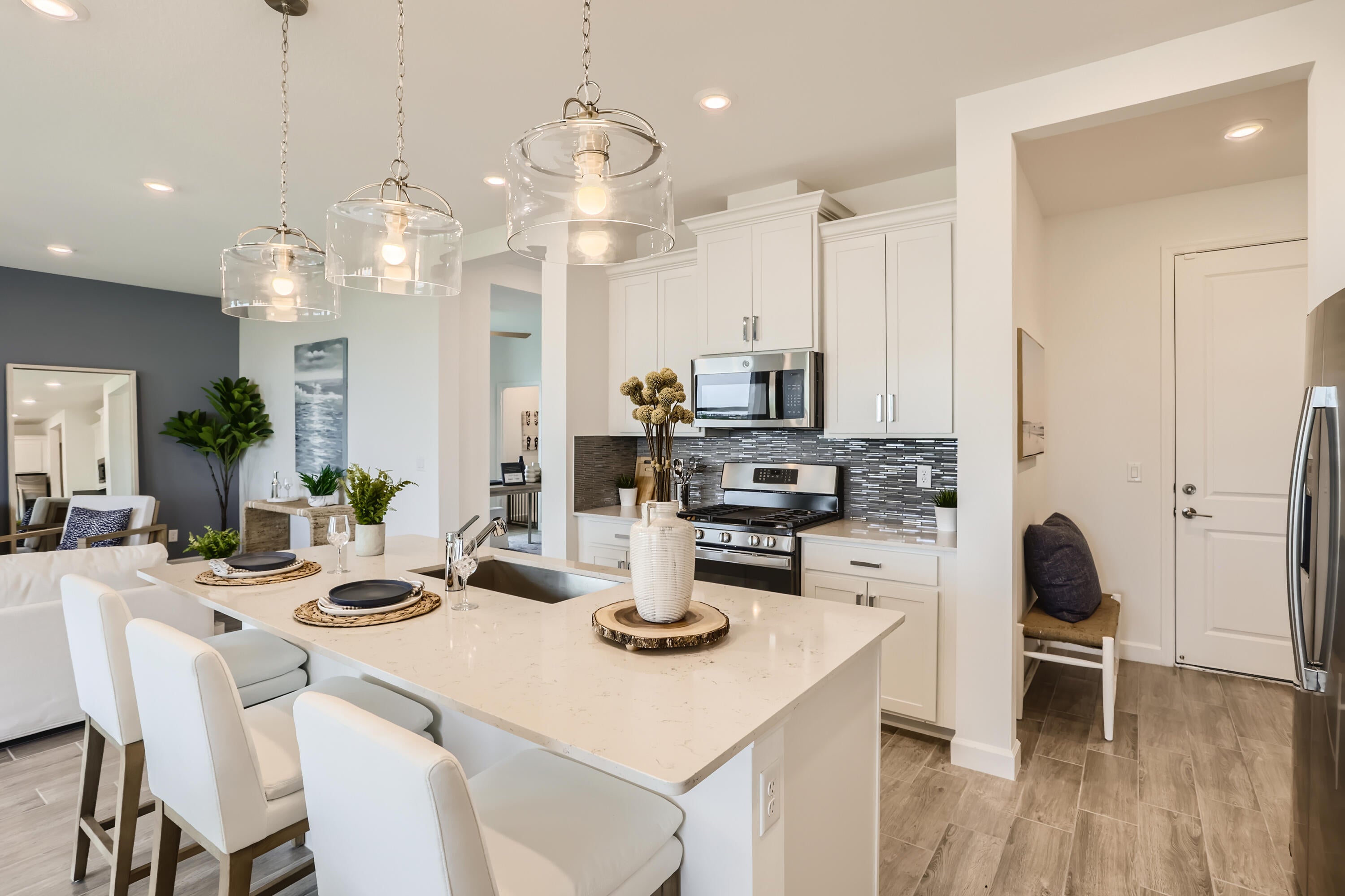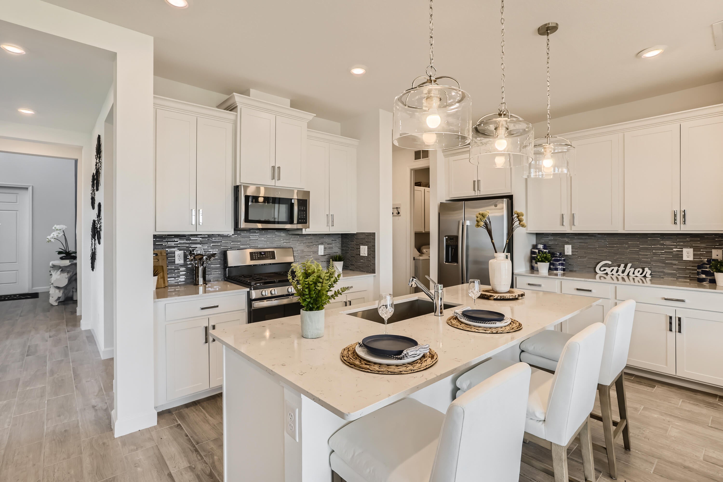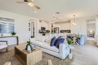 The collections largest design includes two stories and five bedrooms, with the lavish owners suite located near the open space on the lower level. The kitchen with center island, dining and Great Room spaces combine for a modern open layout, while the covered terrace offers natural light. Upstairs are additional bedrooms and a large loft space. Providence is a collection of new single-family homes for sale at the Arden masterplan in Loxahatchee, FL. It offers resort-style amenities including a pool with upper and lower decks, a tennis court, 20 miles of walking trails and several lakes. Nearby are a wildlife preserve, an equestrian center and waterways for kayaking. Palm Beach International Airport is 12 miles away. Photos are for illustrative purposes only.