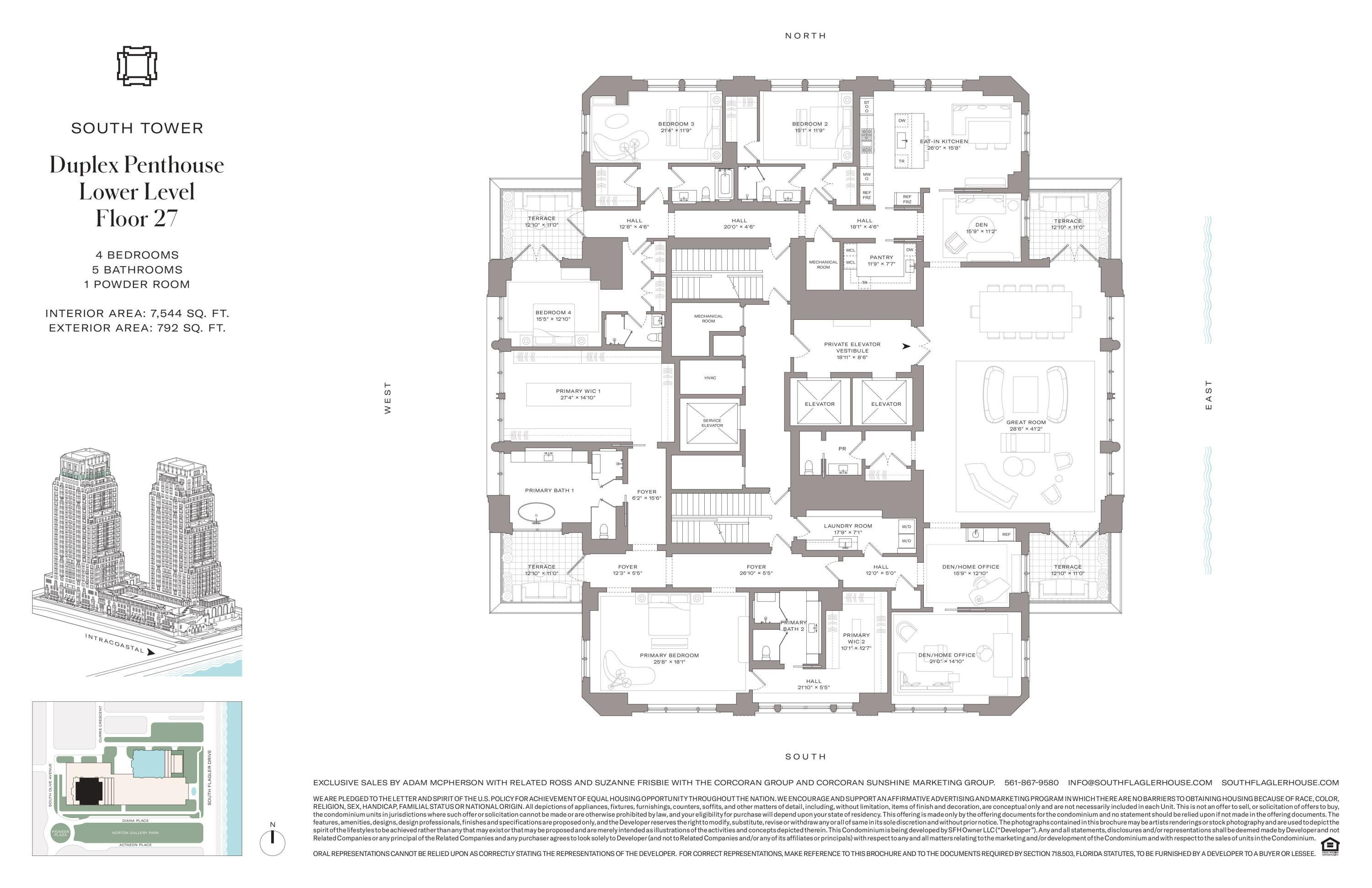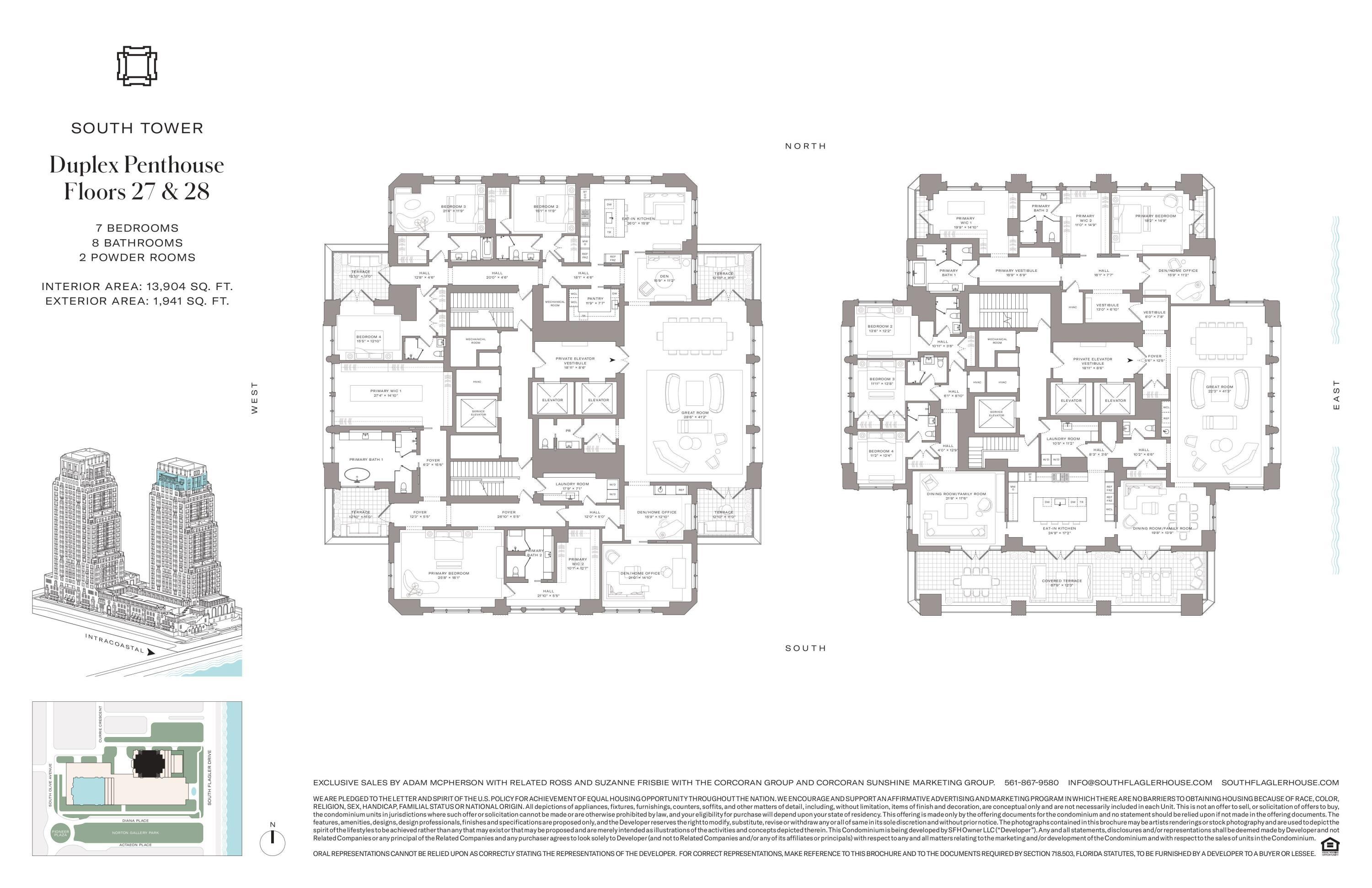 Exceptional, 1 of 2, South Flagler House Duplex PH. This PH set atop the South Tower, is 1 of 1 as each Duplex PH is unique in its design. The south duplex spans the 27th & 28th floors with sweeping views of the Intracoastal, Palm Beach, & the Atlantic Ocean. Offering 7 BRs, 8 full BAs, & 2 powder rooms, this panoramic residence features 13,904 sq ft of interior space & an additional 1,941 sq ft of covered outdoor entertaining space. A private elevator vestibule opens to a grand foyer & into living/entertaining spaces across each floor with exceptional water views. Myriad spaces including KT, DR, family/media rooms, offices, as well as a private interior elevator & interior gracious stair complete the home. SFH includes the most luxurious & robust amenity offerings in WPB & PB.South Flagler House, presented by Related Ross, combines the timeless style of Robert A.M. Stern Architects & the luxurious aesthetic of Pembrooke & Ives, resulting in soulful spaces designed for an enhanced lifestyle. Primely positioned on 3.4 acres along the Intracoastal Waterway at 1355 S Flagler Dr. South Flagler House features two 28-story structures with 105 beautifully appointed 2-to-5-bedroom homes. Representing the single largest amenity offering per residence in all of Palm Beach County. Residents will have access to lifestyle amenities of unprecedented range & quality, with on-site concierge services surpassing those of the most exclusive private members' clubs.