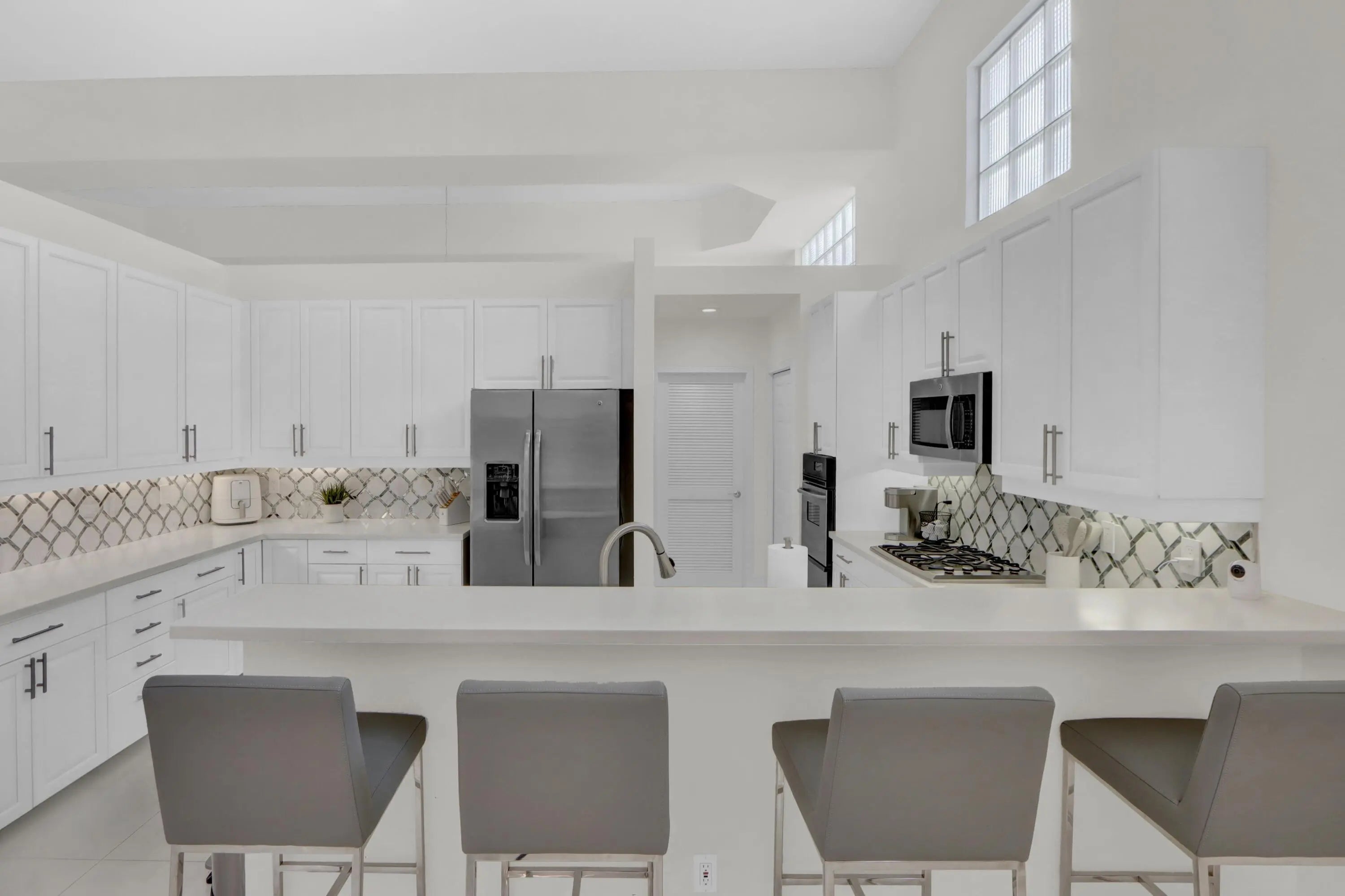 This cheery & tastefully remodeled one-story home of 3 bedrooms plus an office & 2 1/2 baths is located on a private interior lot. This lovely home is spacious with an open floor plan & plenty of sunlight. Features include volume ceilings; white porcelain tile & carpeting; an inviting Living Room wet bar; and a spacious kitchen with white 42'' shaker cabinetry, quartz countertops, elegant tile backsplash & stainless steel appliances. All of the bathrooms have been beautifully remodeled with contemporary flair with the primary featuring porcelain tile on the floors & walls,vanities of tigerwood finish & a free-standing tub. Sliding glass doors open out to a totally private tropically landscaped patio which features a covered lanai and an open patio with a freeform pool.