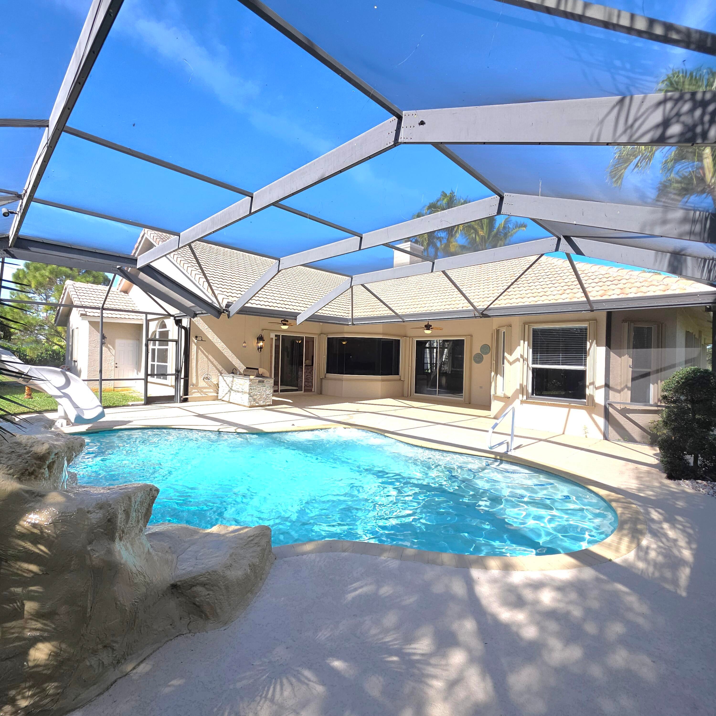 Presenting a rare opportunity to own a secluded estate that blends upscale living with open space and natural surroundings. Situated on an expansive 1.4-acre homesite, this impressive split-bedroom residence offers three bedrooms, three bathrooms, and a private office. The grand entrance opens to dramatic volume ceilings reaching 14-16 feet, abundant natural light through oversized windows, and a stunning coral stone fireplace shared between living spaces. Designed with both function and style in mind, the home includes a welcoming foyer wet bar, decorative stained-glass elements, recessed illumination, two independent A/C systems, access to both well water (for irrigation ) & city water, few month new 85 gallon water heater, and beautifully refreshed updated bathrooms featuring granite surfaces and custom cabinetry. The spacious kitchen serves as the heart of the home, complete with granite counters, soft-close storage, and a newly installed cooktop ideal for hosting or everyday enjoyment. Step outside to your own backyard escape featuring a resort-inspired pool and spa with waterfall and slide, mature landscaping, a peaceful stream with fish, and an abundance of tropical fruit trees including mango, avocado, banana, fig, and coconut. With plenty of room for boats, RVs, or future structures, the property also offers an outdoor grilling area with wet bar perfect for entertaining. Completing the estate are a three-car garage, oversized circular drive, full security system with cameras and lighting, accordion shutters, a durable 50-year Monier tile roof, and high-efficiency dual-zone air conditioning. This extraordinary property offers privacy, comfort, and sophistication in a setting that is truly one of a kind. Living in the Acreage in Florida offers a unique blend of space, privacy, and a relaxed rural lifestyle while still remaining close to modern conveniences. Known for its large lots and open surroundings, the community provides homeowners with room to store boats or RVs, keep animals, or simply enjoy a quieter pace of life away from crowded neighborhoods. Residents appreciate the natural setting, scenic skies, and peaceful environment. Despite its tranquil feel, the Acreage is conveniently located near shopping, dining, schools, and major roadways, making it easy to reach nearby cities, beaches, and airports. This balance of privacy, flexibility, and accessibility makes living in the Acreage especially appealing for those seeking space without sacrificing everyday comfort.