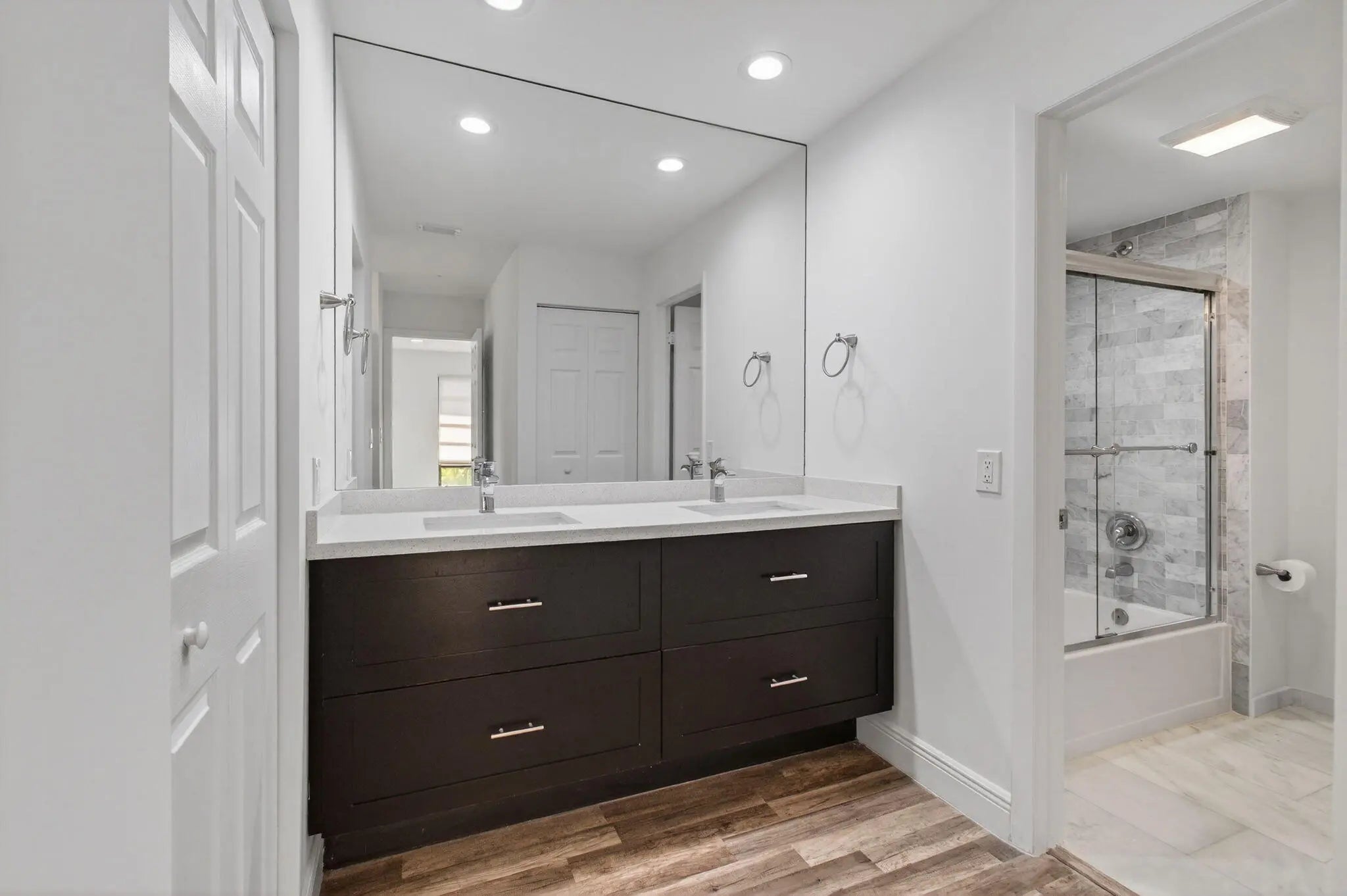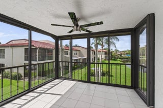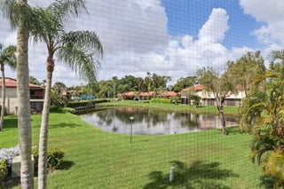 Gorgeously updated 2BR/2BA corner unit with private entrance in the highly desirable 55+ gated community of Fairways of Boca Lago. This bright, open-concept home features Calacatta quartz countertops, custom cabinetry, and luxury finishes throughout. The spacious primary suite offers three oversized closets and a spa-inspired bath with marble floors, dual vanities, and designer tile. The guest bathroom includes a walk-in glass shower with modern stone accents. Additional upgrades include new flooring, oversized baseboards, and fresh paint. Enjoy 180-degree waterfront views from the enclosed balcony with floor-to-ceiling windows that open to screens for a light-filled, breezy feel. In-unit washer/dryer for added convenience. New roof (2025), AC and water heater (2018). Community features