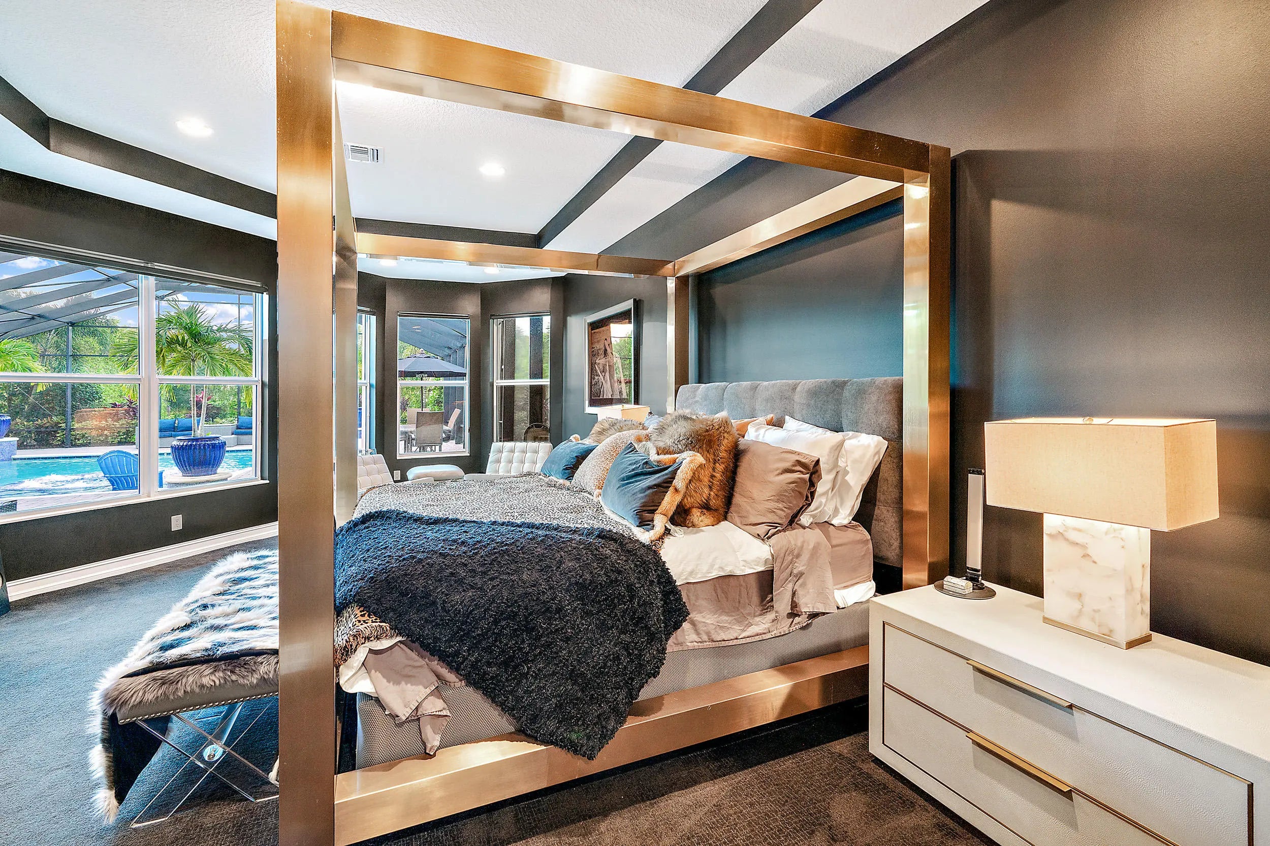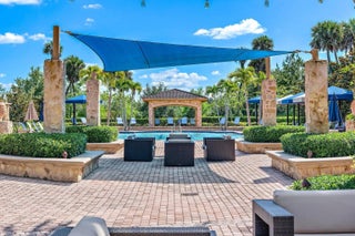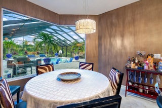 Exquisite 3 bedroom, 3 full bathroom plus office single-family pool home located on a massive .43 acre lot in Jupiter Country Club, including a FULL GOLF Membership with NO waitlist. Built by the esteemed Toll Brothers, this Salerno model is an exceptionally designed, single-story residence offering over 2,600 square feet of refined living space with a desirable split floor plan and complete privacy. From the moment you enter, you are greeted by a luxurious ambiance featuring soaring ceilings, porcelain tile throughout the main living areas, spectacular wood trim work, tray ceilings, high-end designer paint, Capitol Lighting fixtures, and stunning Swarovski crystal chandeliers. The home office showcases a custom built-in desk by Schrapper's of Jupiter, while the two guest bedrooms feature