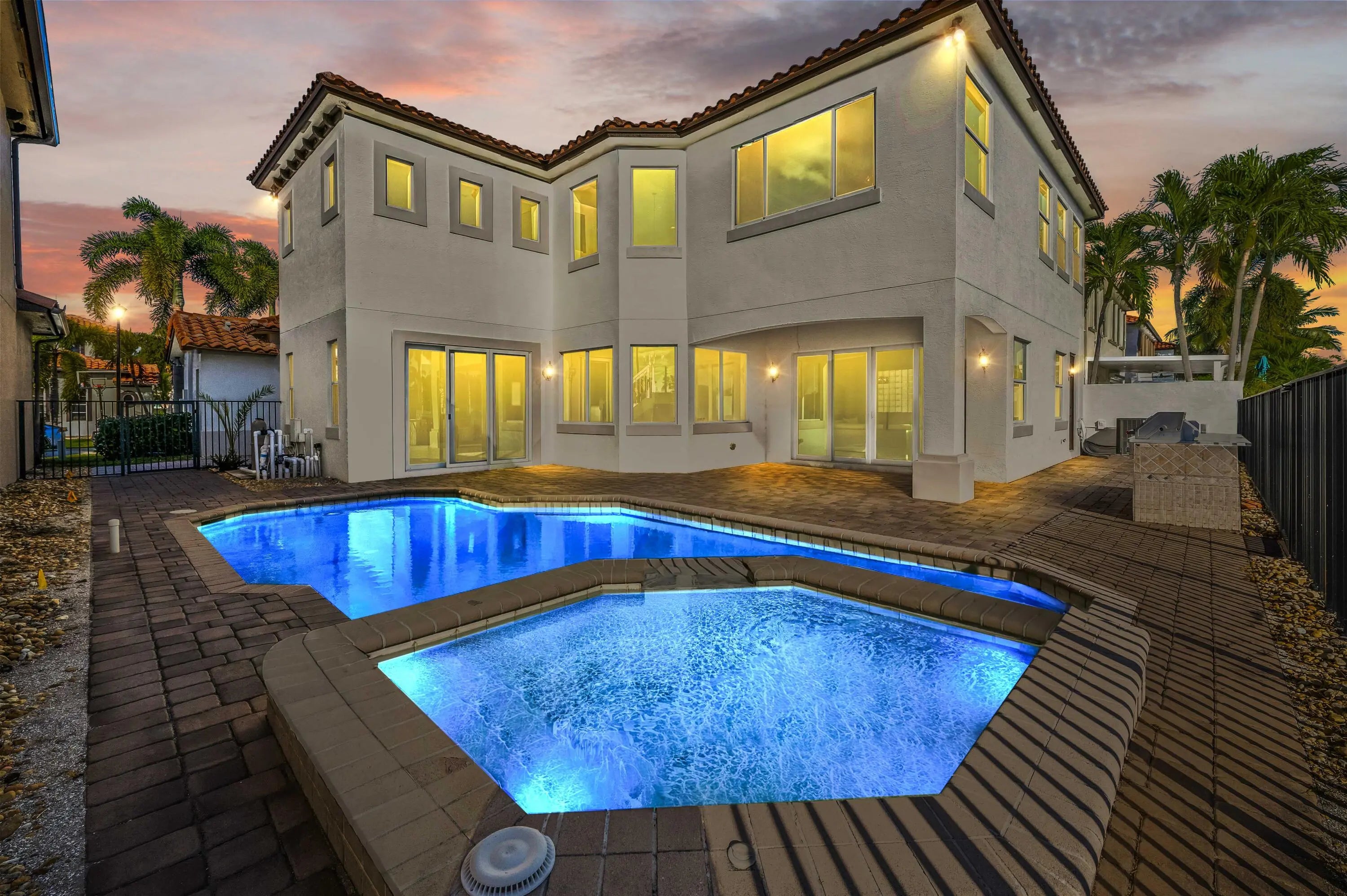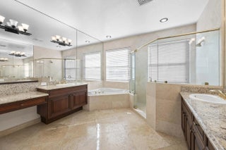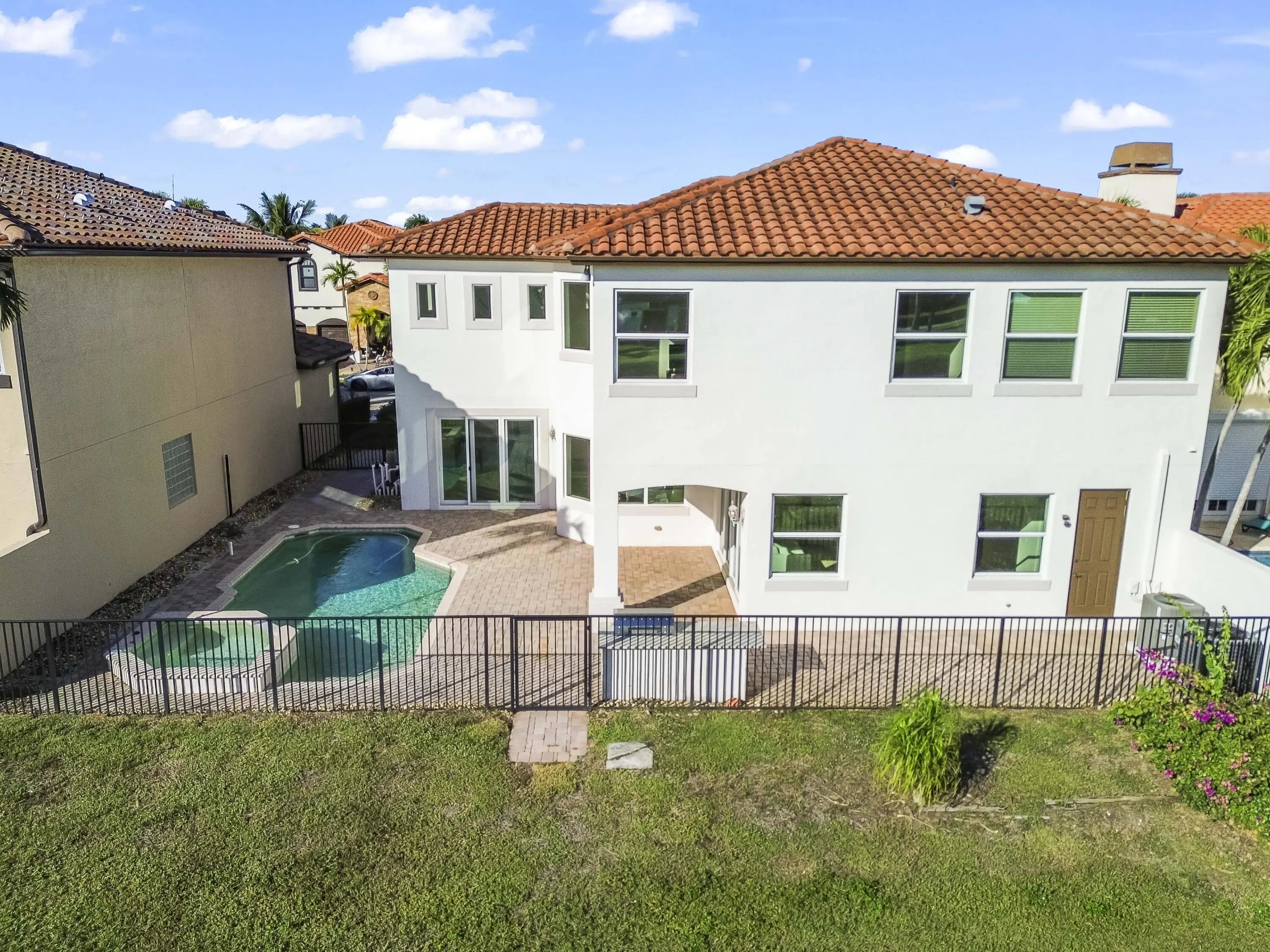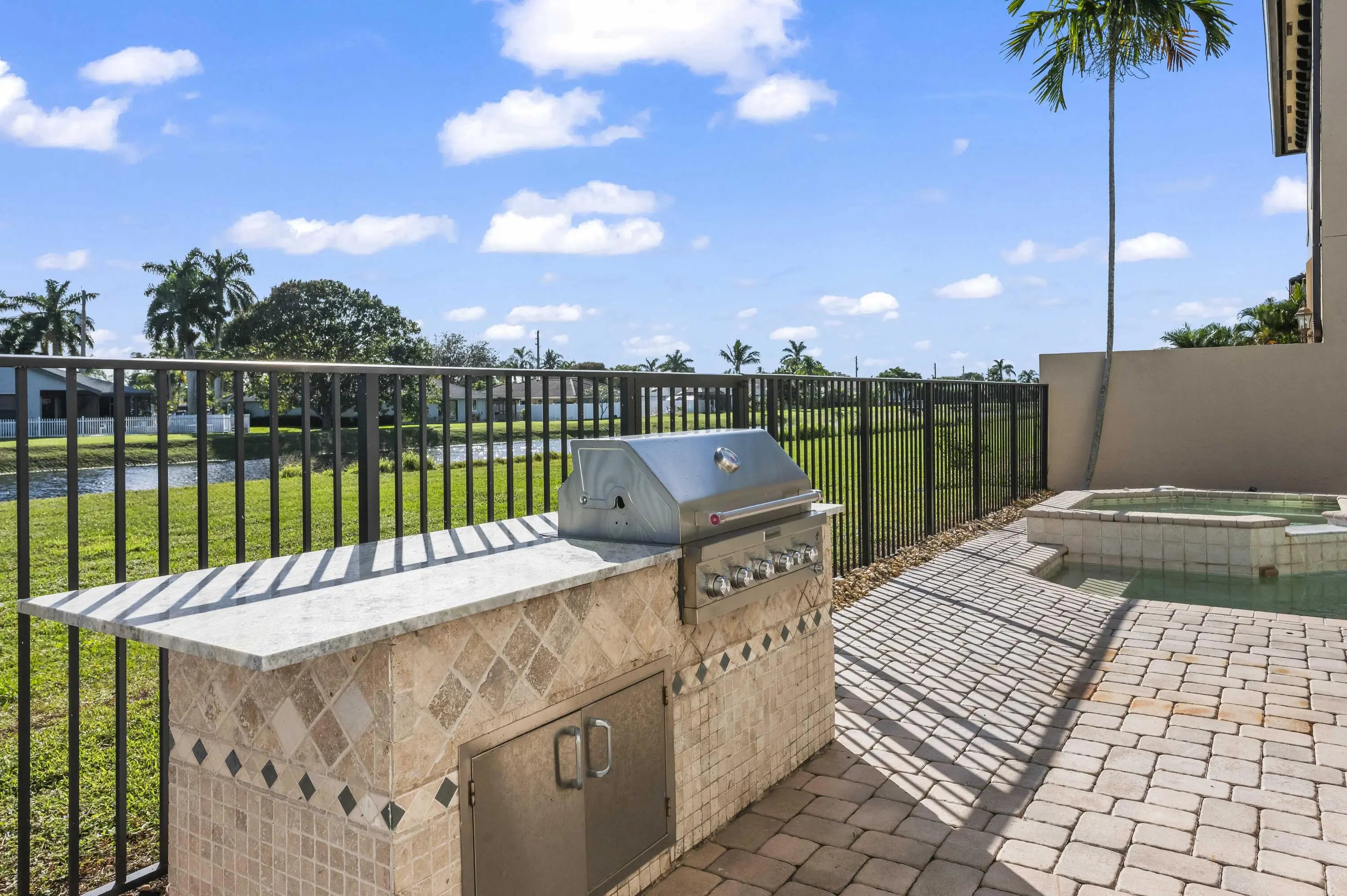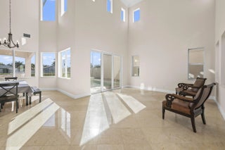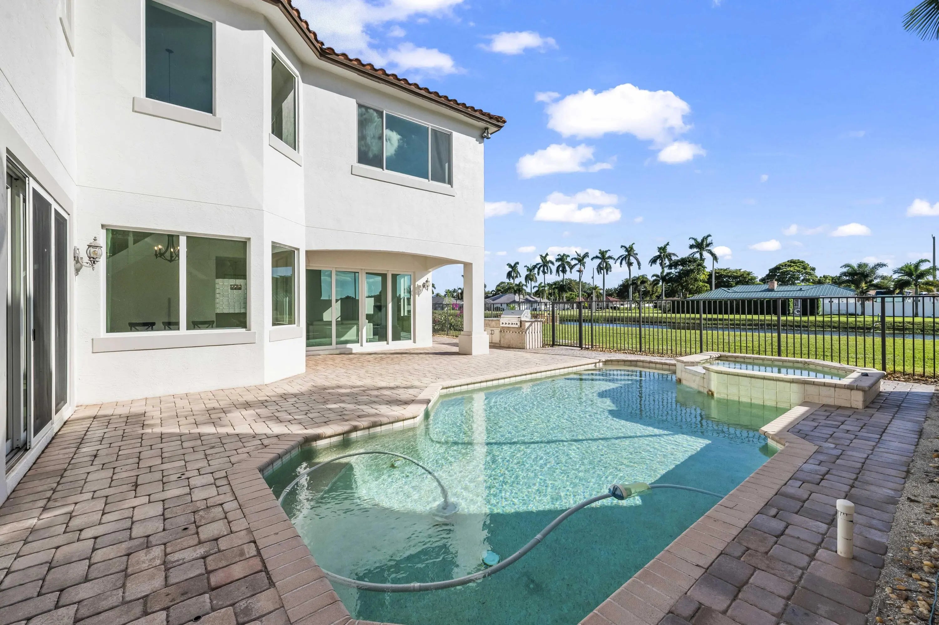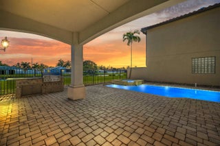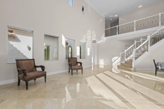Welcome to your own private Mediterranean-inspired paradise, where grand architecture meets modern luxury on a serene waterfront lot. Separate 1-bedroom, 1-bathroom guest house. A paved courtyard entrance sets the stage for this magnificent residence, which welcomes you with a dramatic two-story foyer, a sweeping staircase, and soaring ceilings that bathe the open-concept living spaces in natural light. The heart of the home is the gourmet kitchen, boasting rich dark wood cabinetry, a massive granite center island, double wall ovens, a electric cooktop, and a new refrigerator. Whether hosting in the formal dining room or relaxing in the great room, the home is designed for both elegant entertaining and everyday comfort.