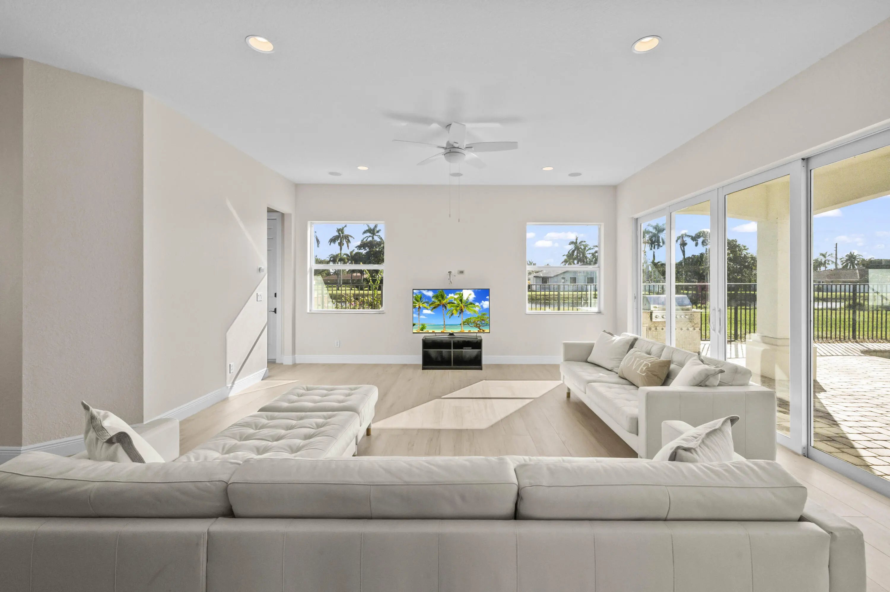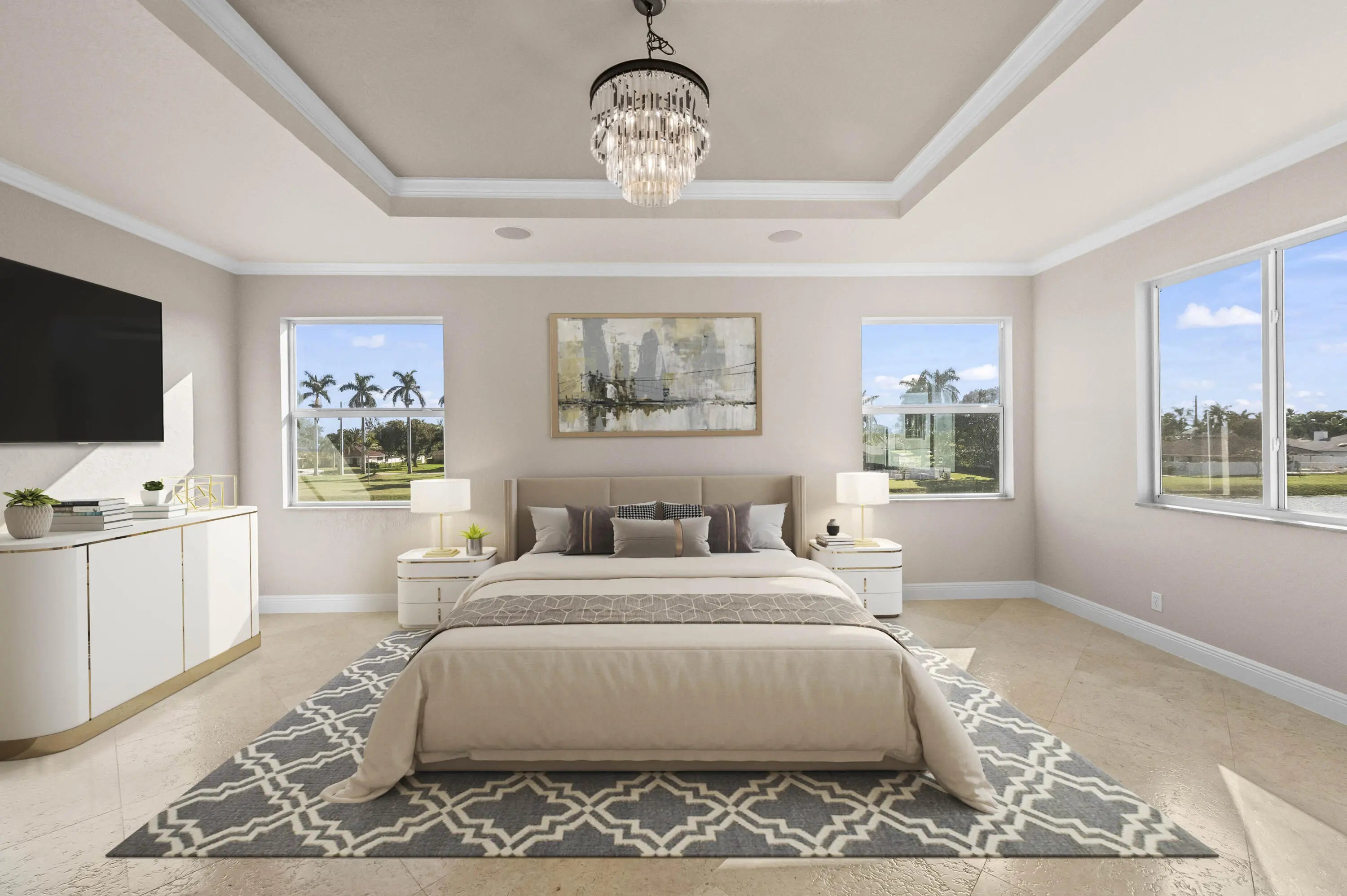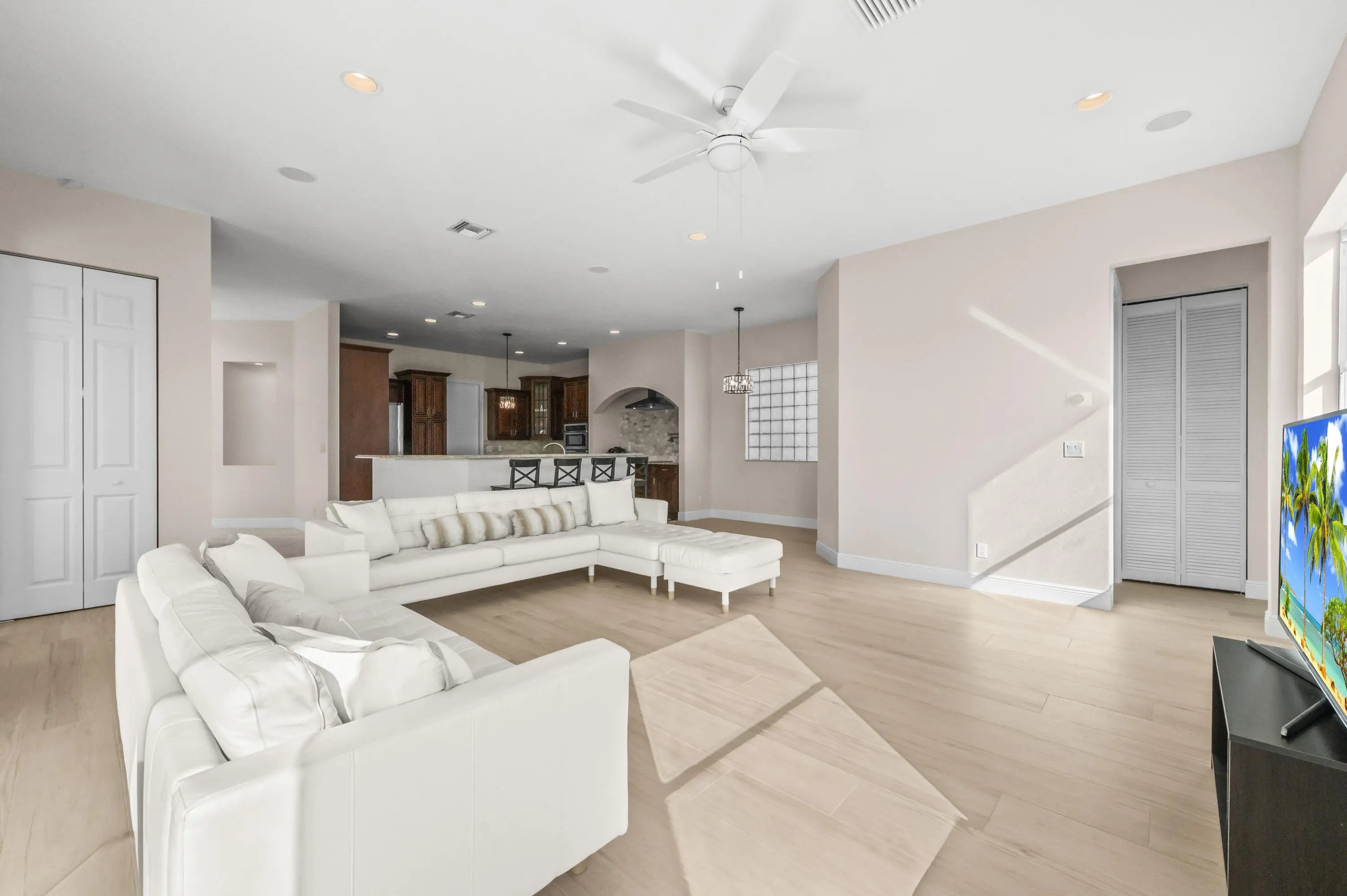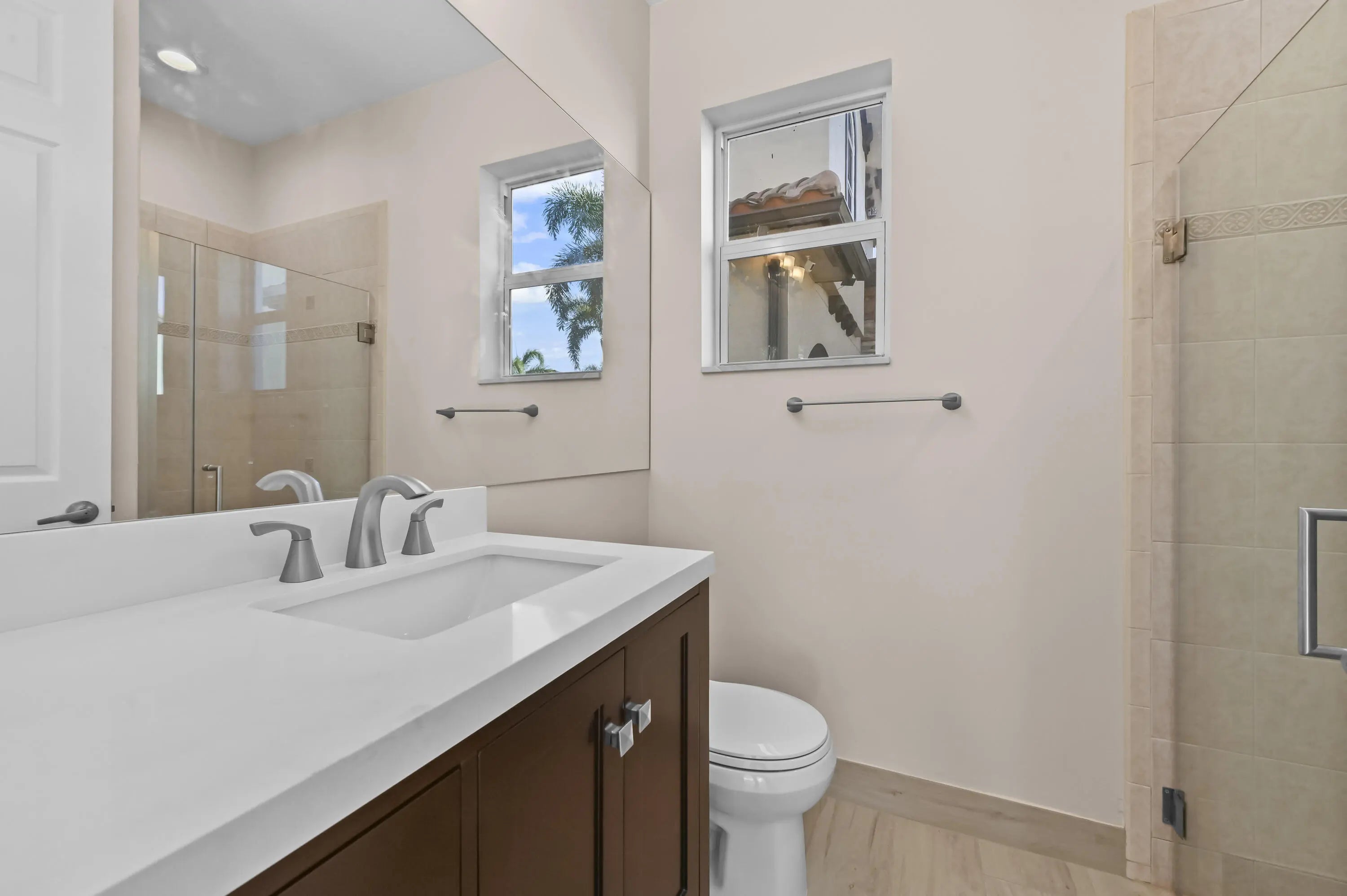 Welcome to your own private Mediterranean-inspired paradise, where grand architecture meets modern luxury on a serene waterfront lot. Separate 1-bedroom, 1-bathroom guest house. A paved courtyard entrance sets the stage for this magnificent residence, which welcomes you with a dramatic two-story foyer, a sweeping staircase, and soaring ceilings that bathe the open-concept living spaces in natural light. The heart of the home is the gourmet kitchen, boasting rich dark wood cabinetry, a massive granite center island, double wall ovens, a electric cooktop, and a new refrigerator. Whether hosting in the formal dining room or relaxing in the great room, the home is designed for both elegant entertaining and everyday comfort.