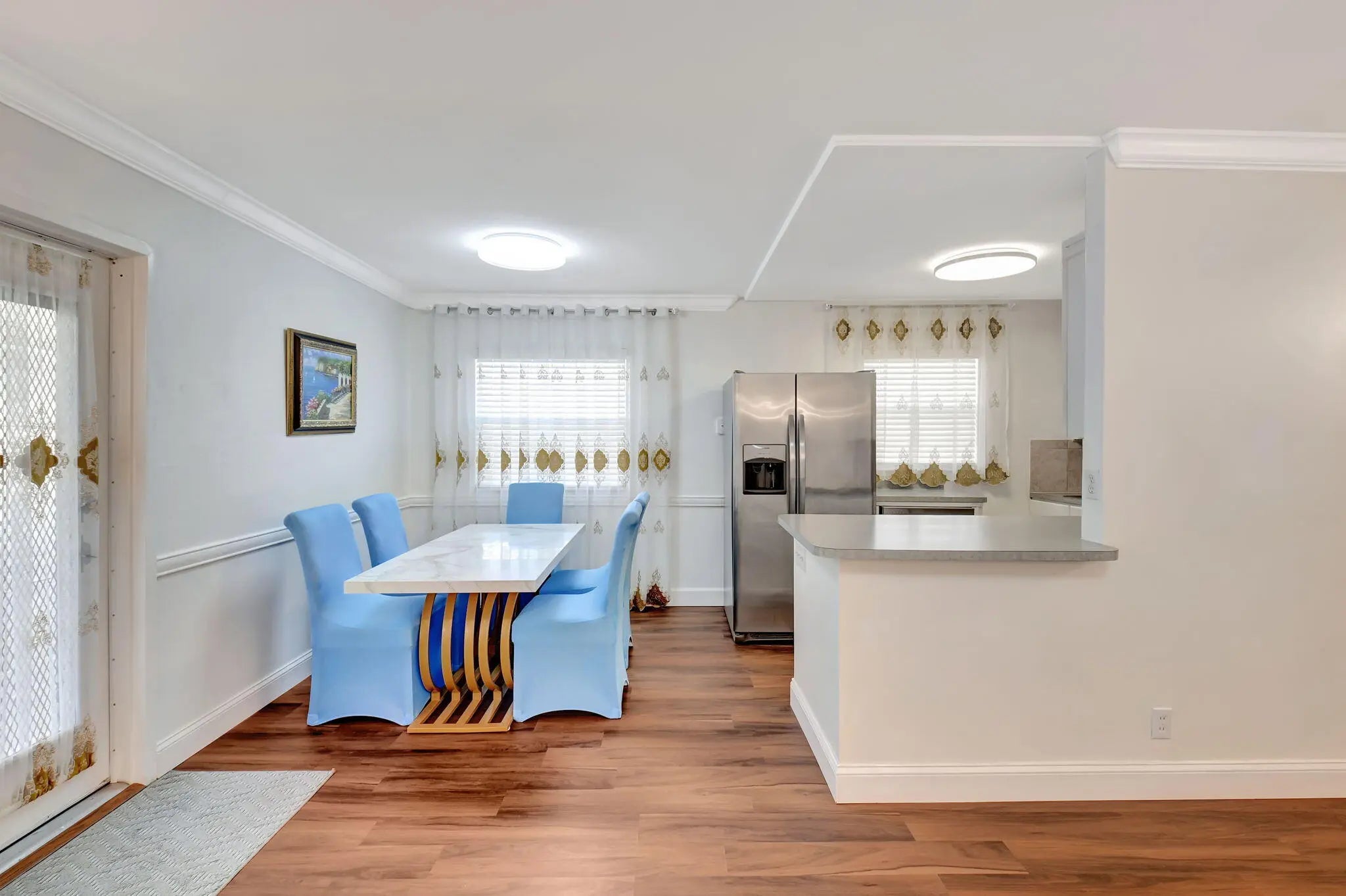 Welcome to 704 Saxony O, a beautifully renovated 2nd-floor condo in the highly sought-after Kings Point 55+ Golf & Country Club. This move-in-ready home offers 2 bedrooms and 2 bathrooms, complete with a 2021 A/C and 2017 hot water heater for peace of mind. Freshly painted from top to bottom, this condo features elegant crown molding, smooth flat ceilings (no popcorn), chair rail molding in the kitchen, and dimmable crystal sconces in the living room for a sophisticated touch. The open-concept kitchen boasts stainless steel appliances, a stylish tiled backsplash, and ample storage, while the enclosed, tiled A/C patio with floor-to-ceiling sliders provides the perfect space to relax year-round. French doors in the den open to a washer and dryer area, adding convenience to everyday living.