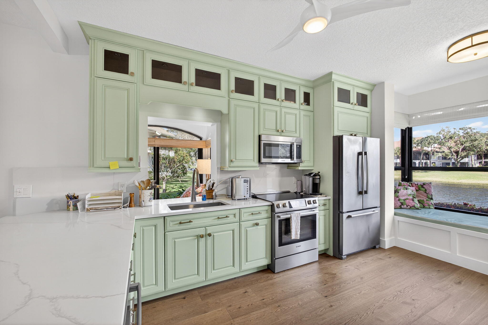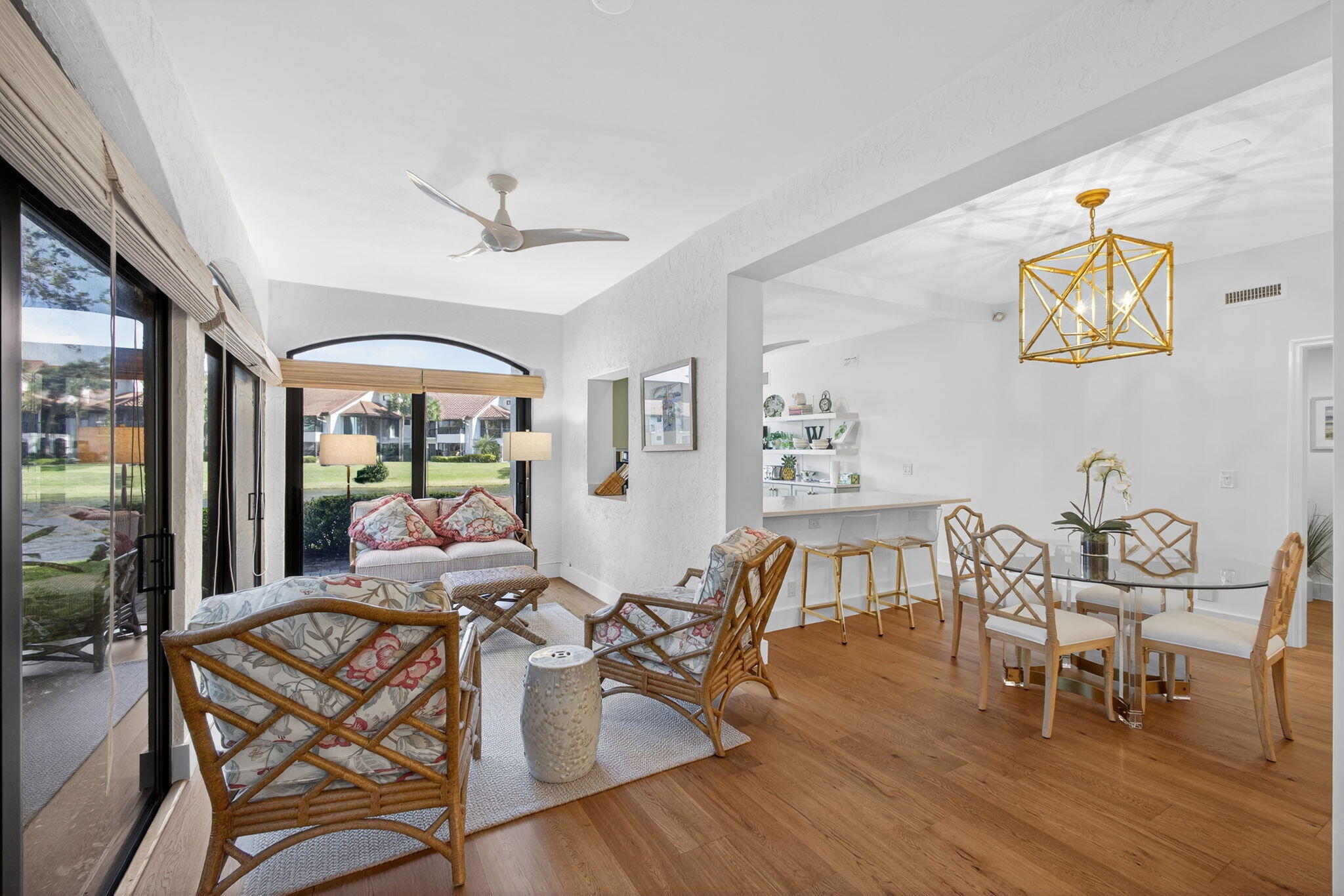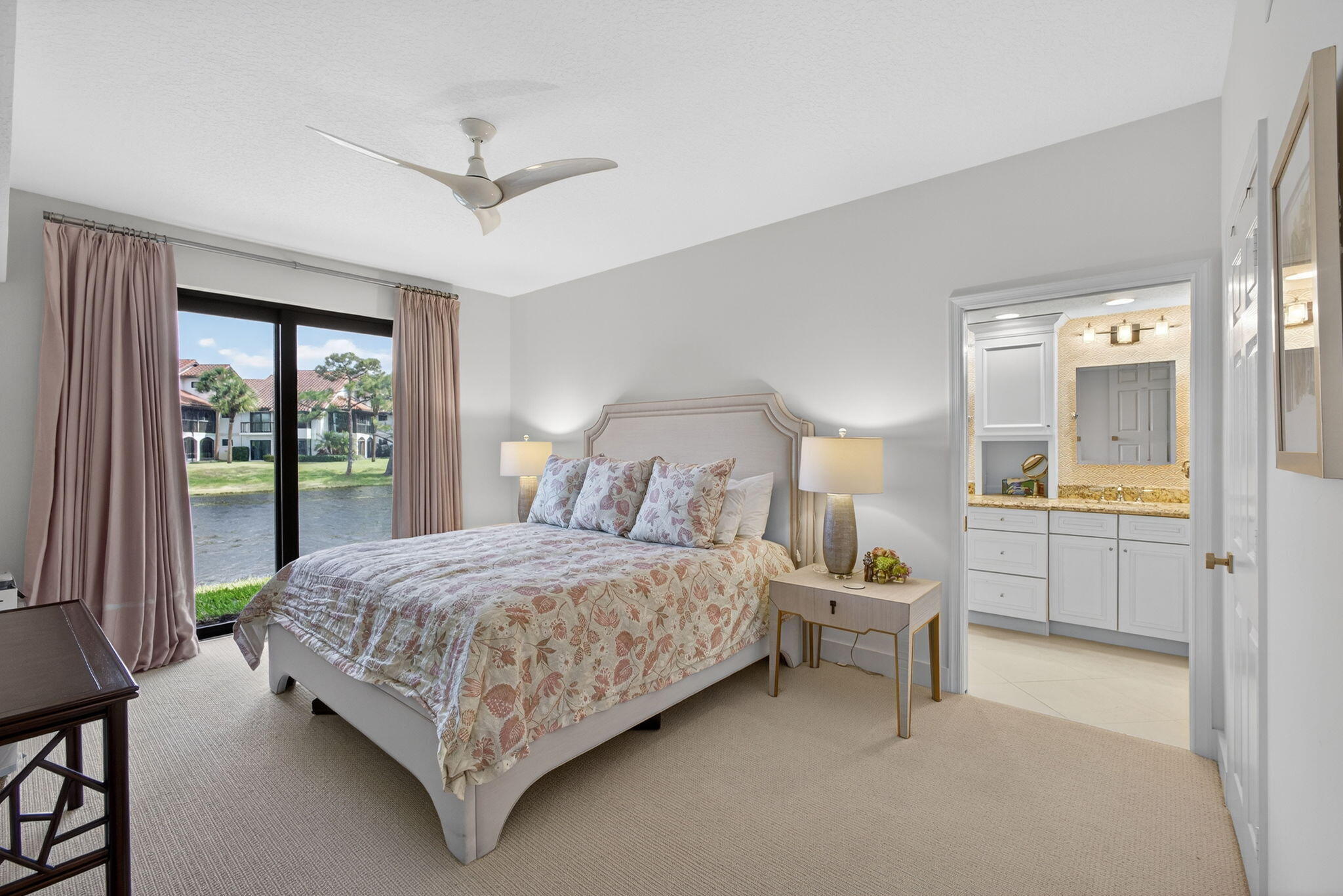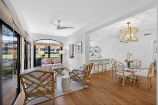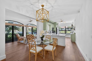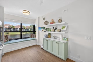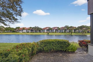 Welcome to Jonathan's Landing, where this stunning lakefront condo is ideally located in the highly sought-after West Bay community. Rarely available, this **first-floor two-bedroom residence with a den--easily converted to a third bedroom--**offers breathtaking lake views and effortless one-level living.This beautifully appointed home features two bedrooms, a den, and two full baths, with hardwood floors throughout and a freshly painted interior. The renovated kitchen is a standout, complete with elegant finishes and a custom-built window seat overlooking serene lake views.Tastefully decorated with refined details, the den provides flexible use as a third bedroom, home office, or bonus room. Additional upgrades include complete impact windows and a new AC unit. (SEE MORE) The screened porch has been enclosed, creating seamless flooring throughout the living space and adding valuable square footageperfect for relaxing or entertaining while enjoying the lakefront setting. A golf cart garage completes this exceptional offering.