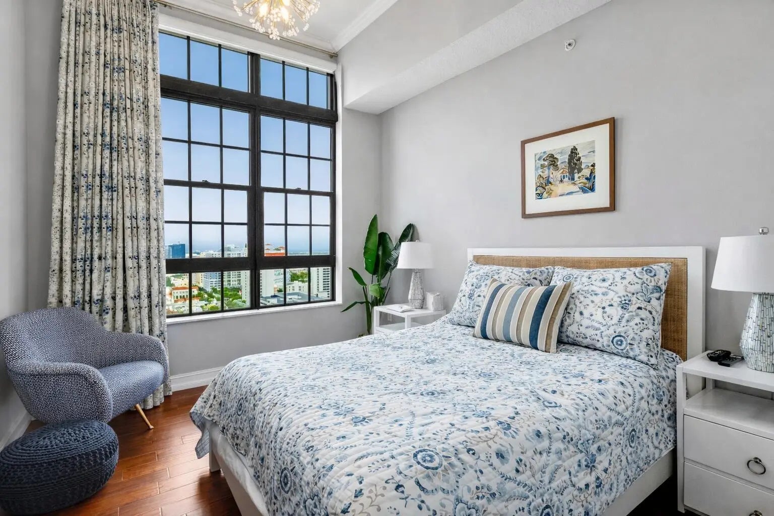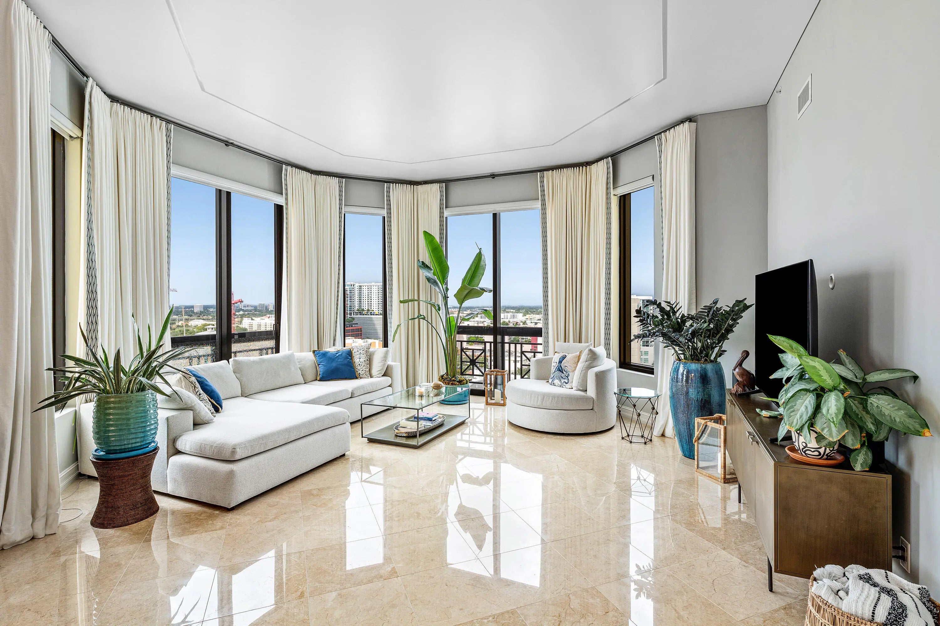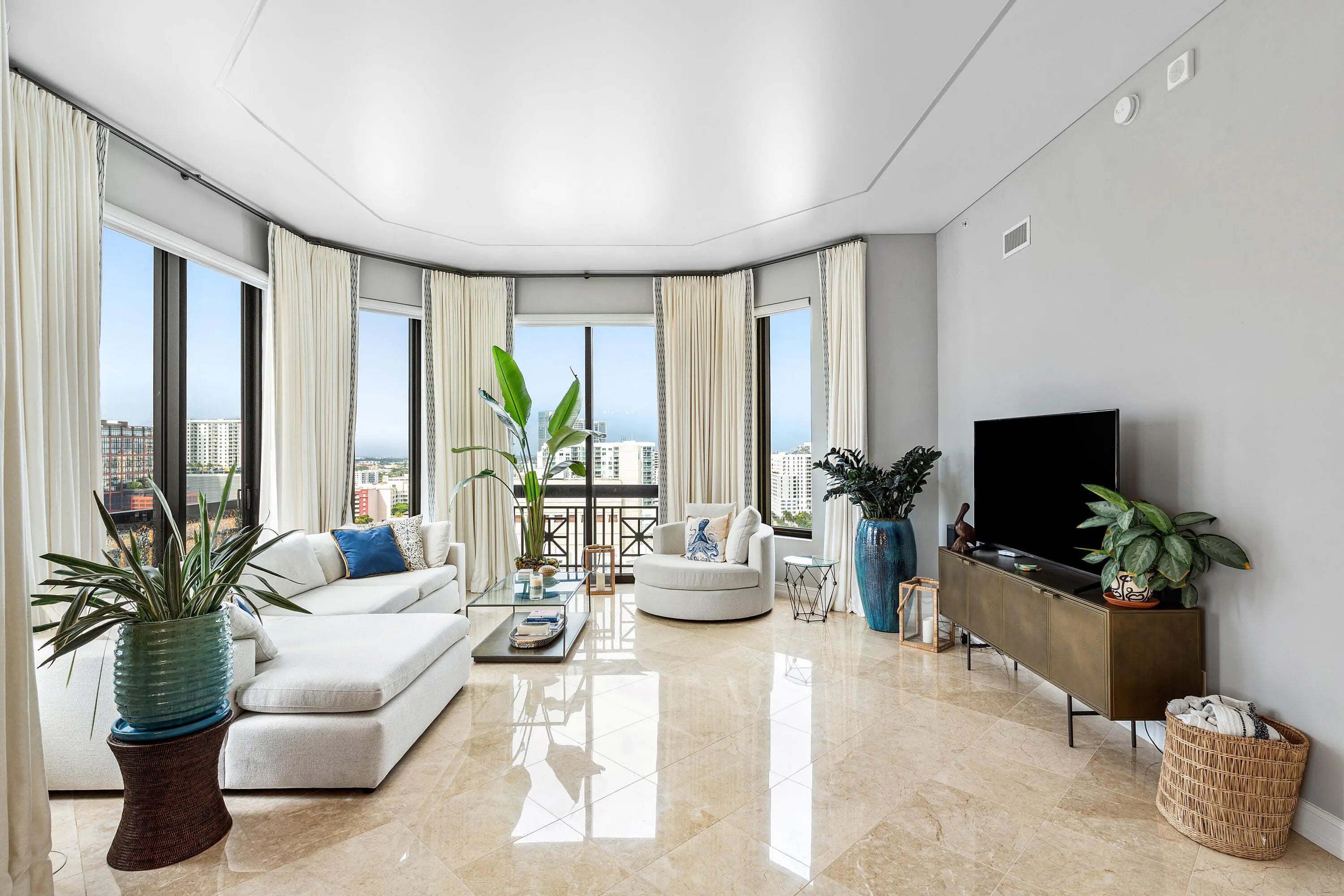 This spectacular furnished residence is a home in the sky with breathtaking panoramic city skyline sunset views and north corner ocean and intracoastal views. Highlighted by 12' ceilings, all marble and hardwood flooring throughout. Floor to ceiling glass and sliders that wrap around corner of the residence. Boasting 2,156sqft, this one-of-a-kind residence welcomes you with a light and airy spacious feel. This 2-bedroom, 2.5 bathroom plus den with built-in murphy bed and desk. An expanded balcony with Clear Lake and city skyline sunset views. The kitchen has a modern feel, large open space w/ kitchen table and opens to the large balcony. The spacious master-suite features a luxurious all marble spa-like bathroom, signature large soaking tub, oversized walk-in fitted closet. 2nd bedroom..