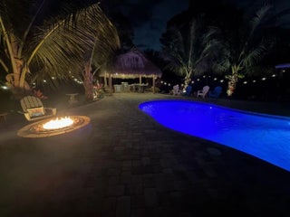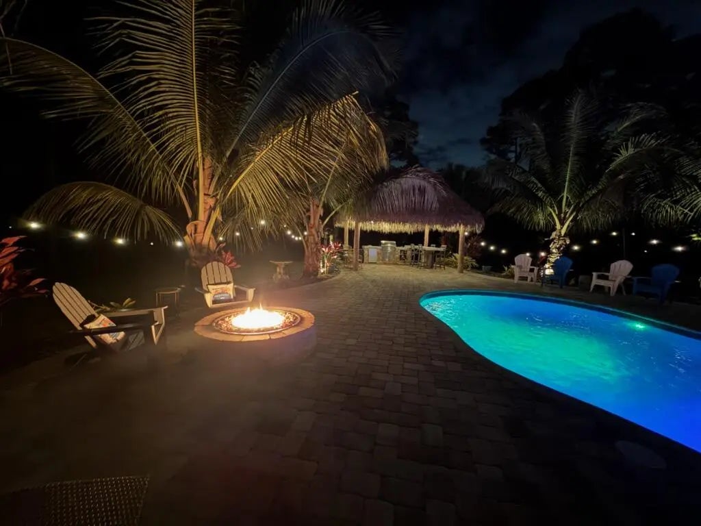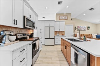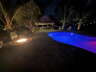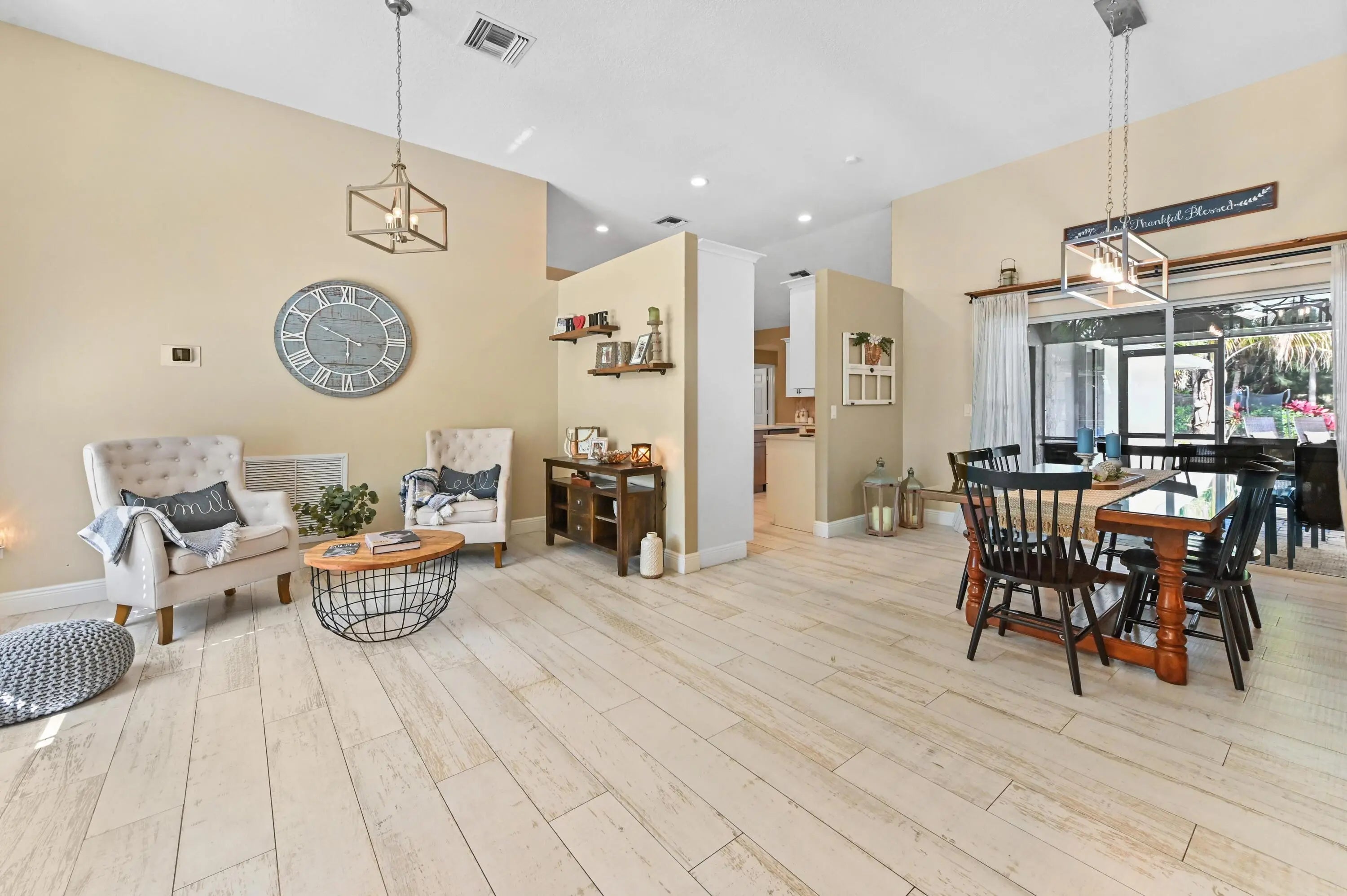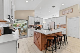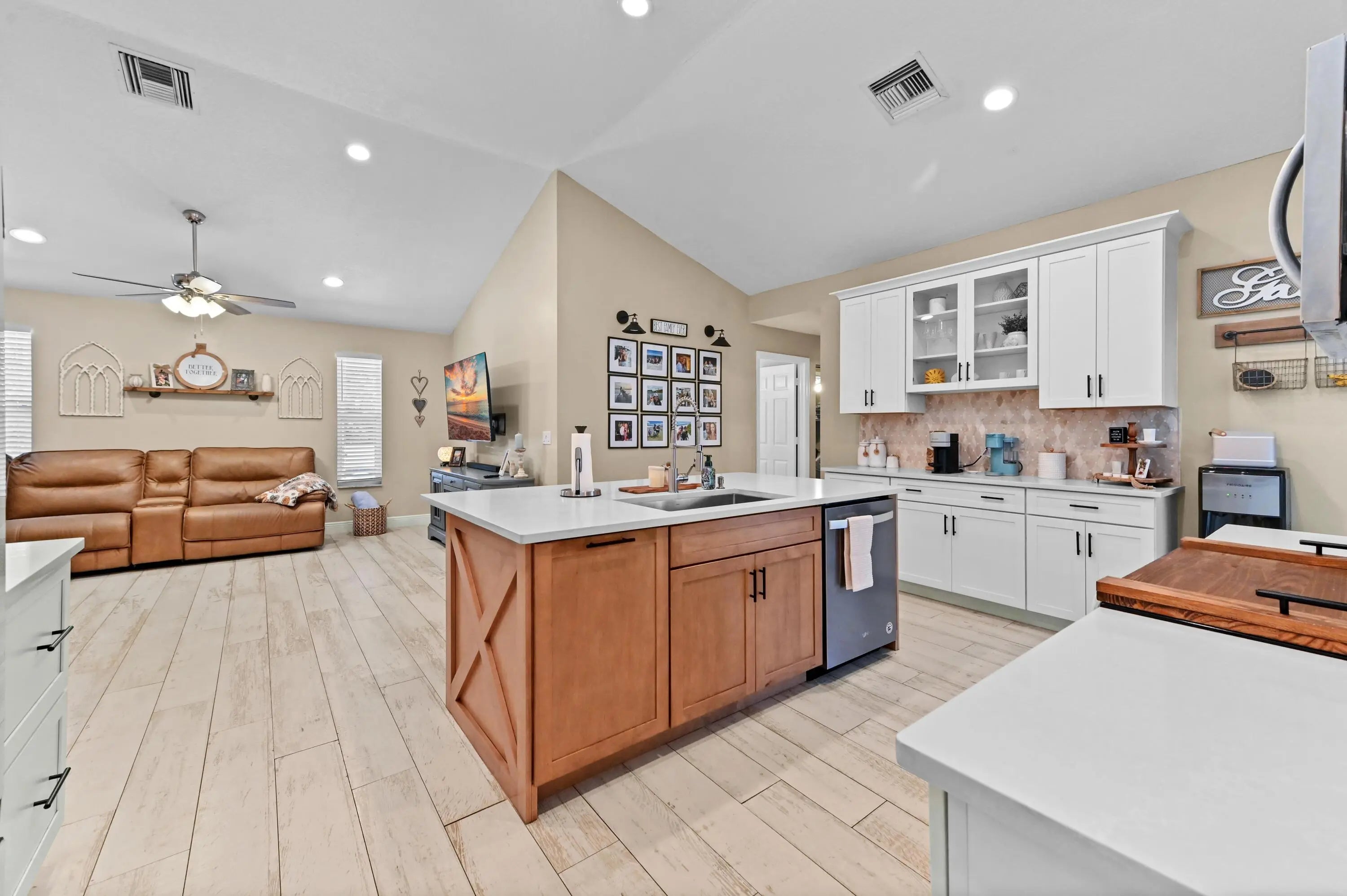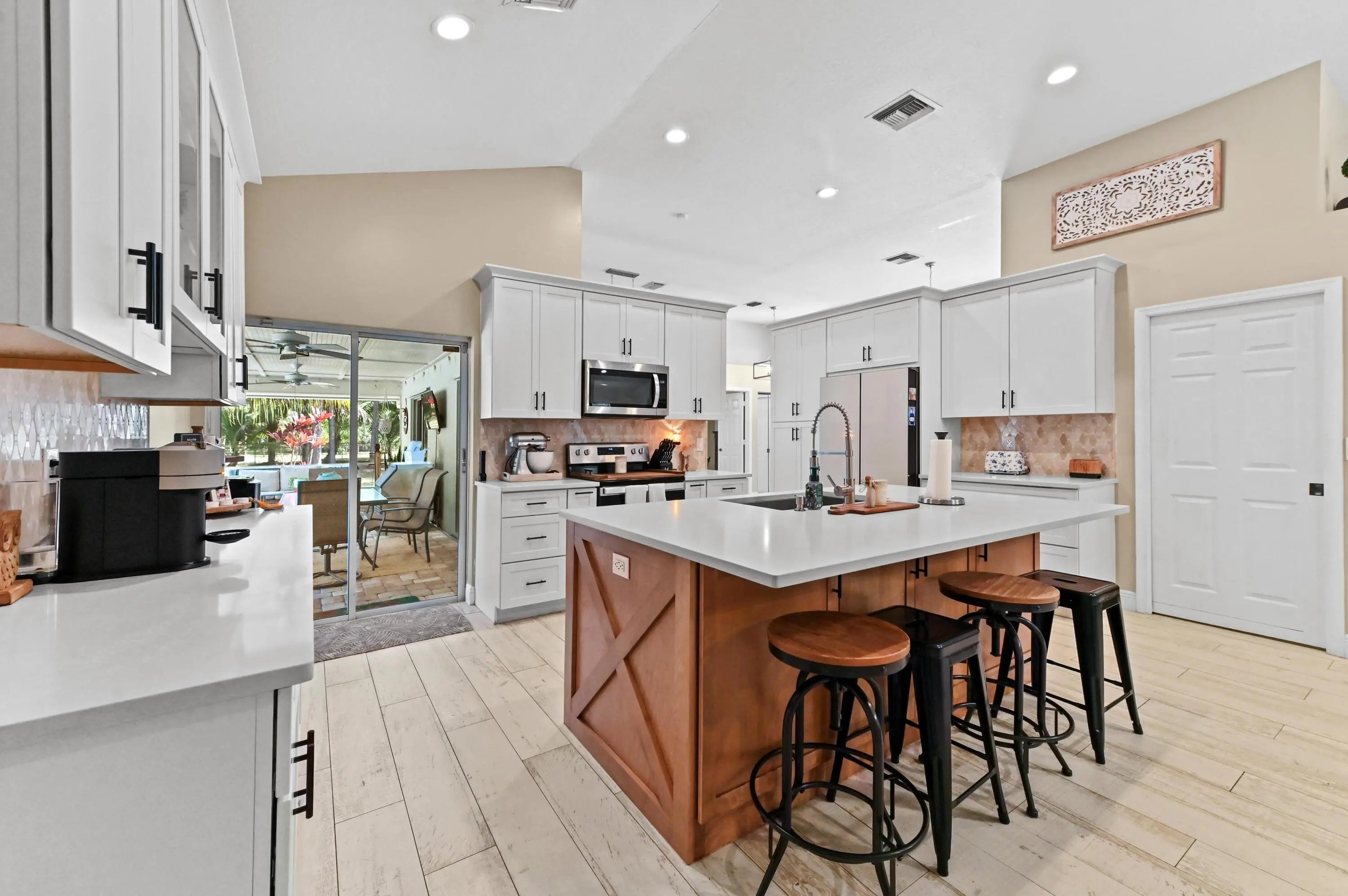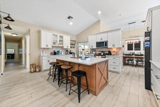 Escape to your own private resort on this sprawling 1.48-acre estate, where modern luxury meets the ultimate outdoor lifestyle. The driveway leads to the double-door entry, welcoming you into an expansive open-concept interior defined by soaring vaulted ceilings and elegant wood-look flooring. The heart of the home is the show-stopping gourmet kitchen, featuring crisp white shaker cabinetry, a massive center island with wood accents and bar seating, a farmhouse sink, and a dedicated bar area. This culinary space flows effortlessly into the family room and dining area, where a sliding glass door frames views of the backyard oasis.