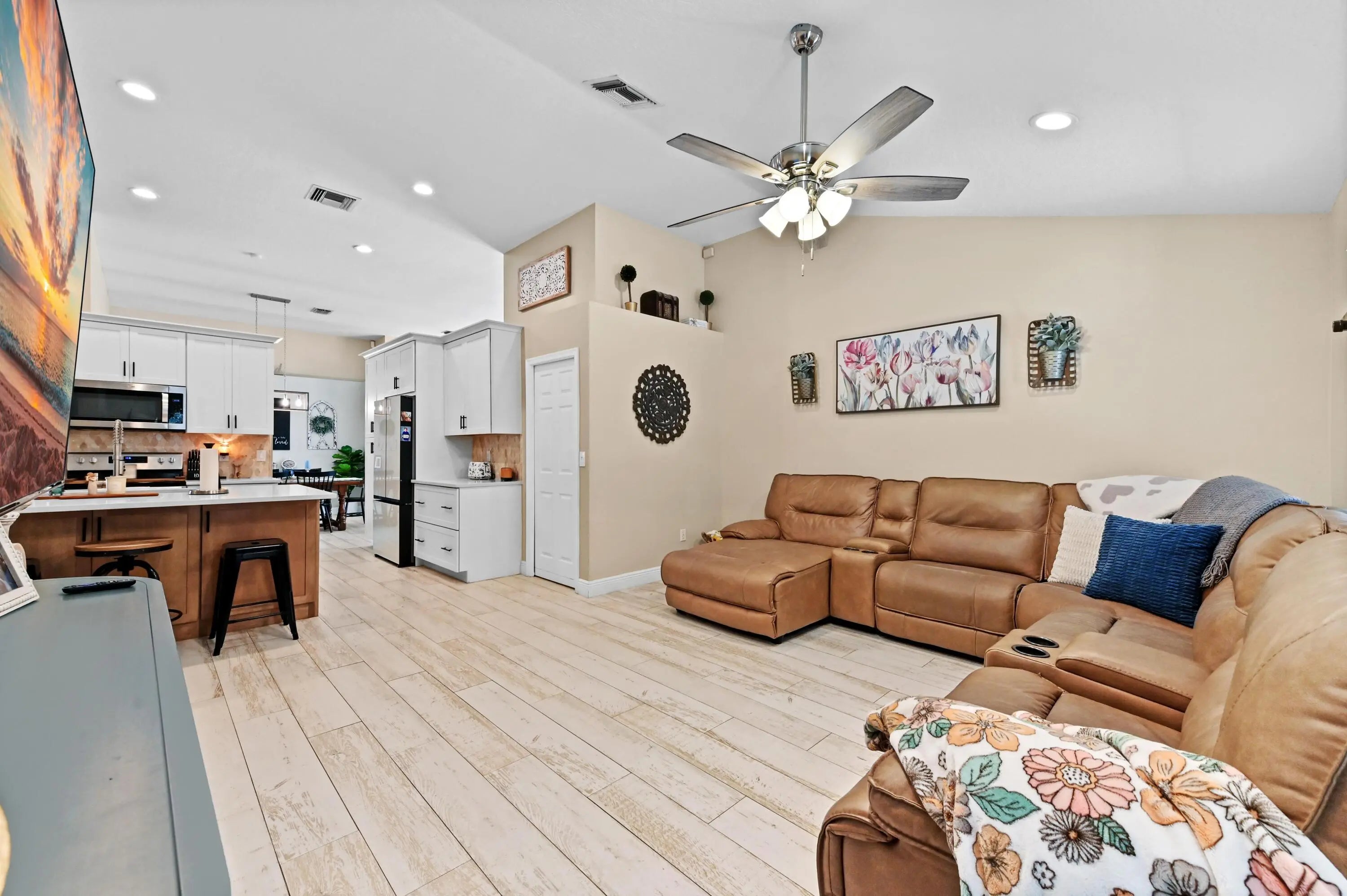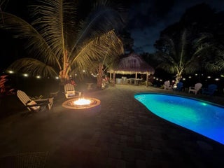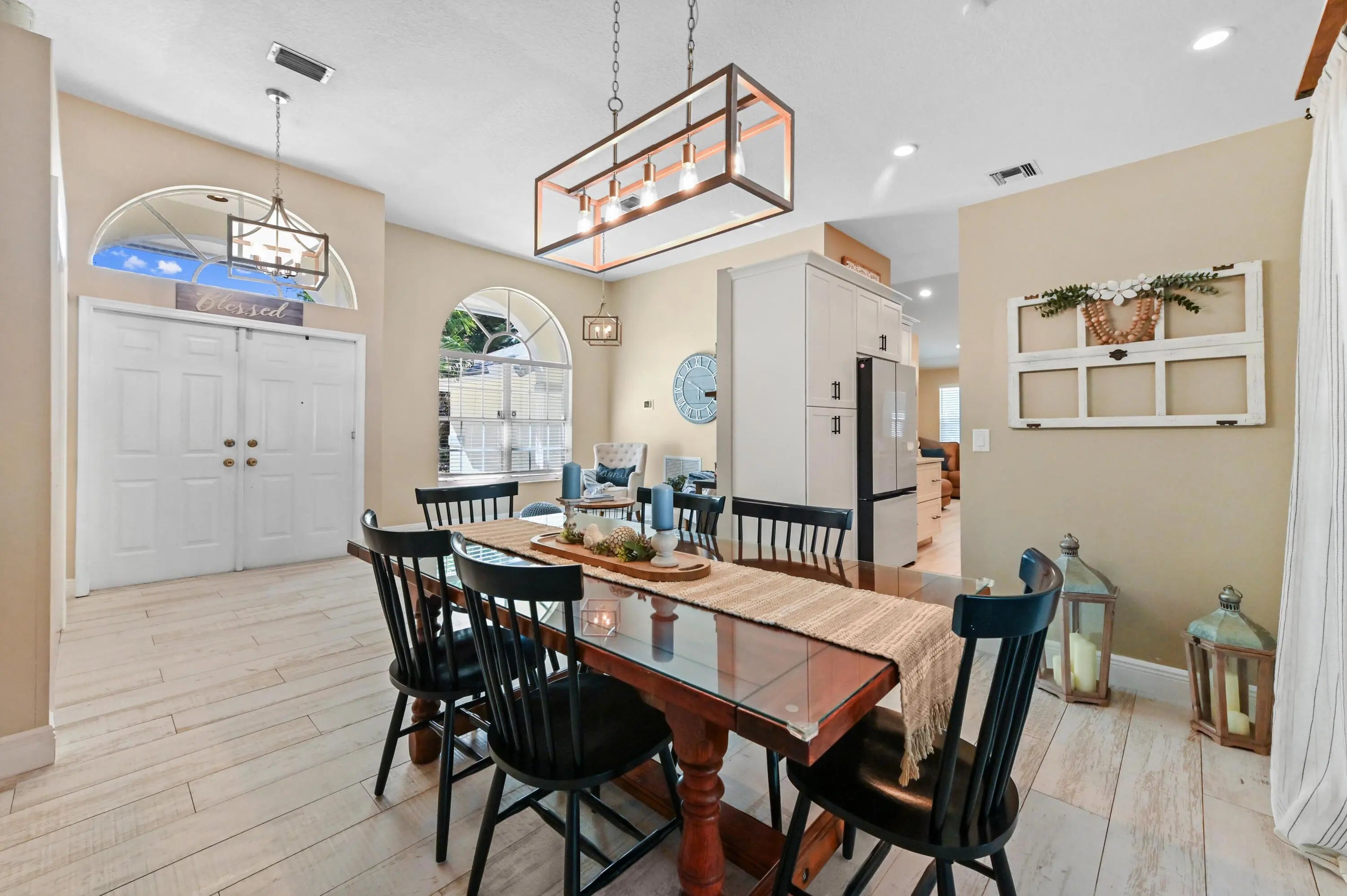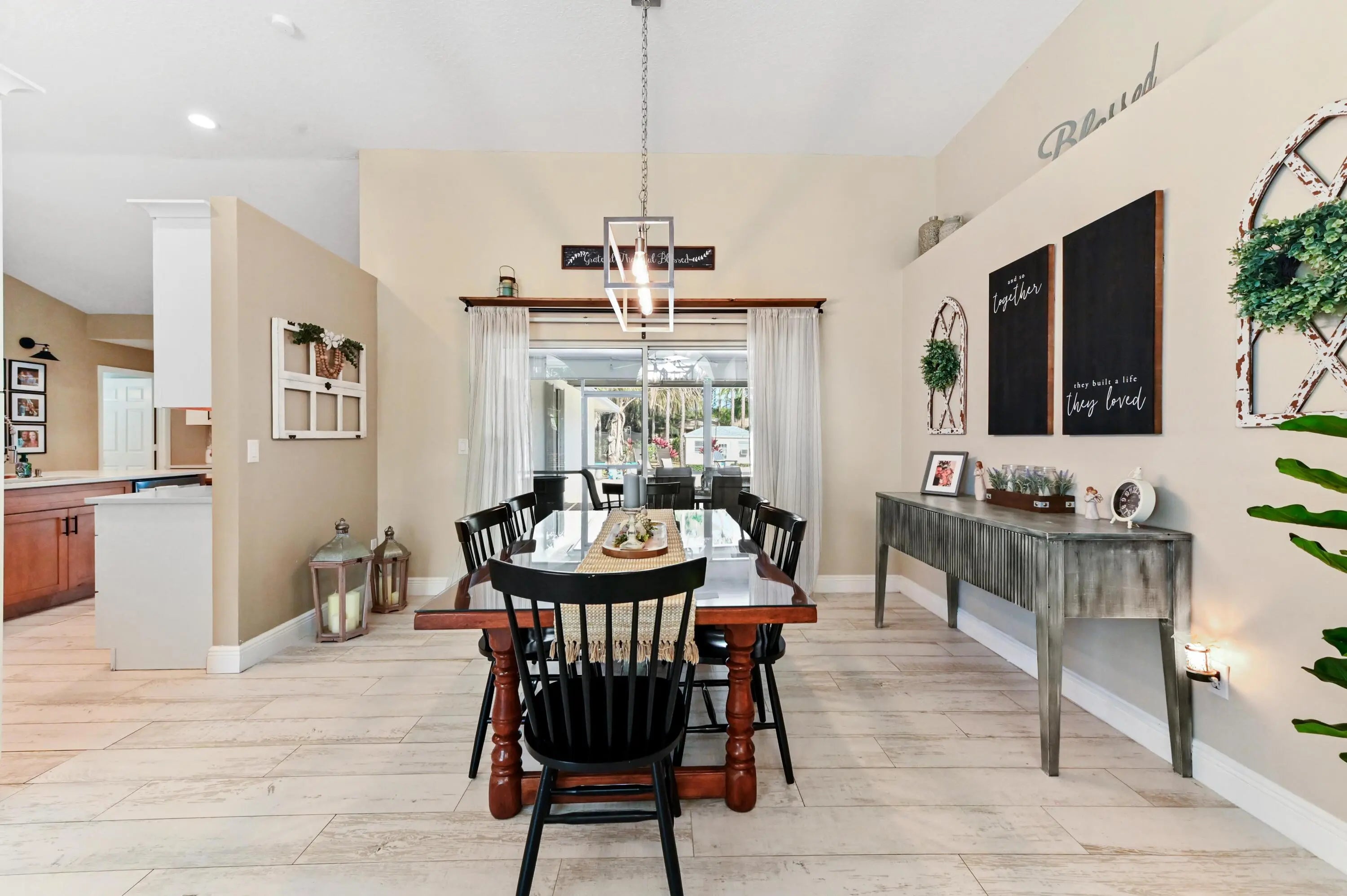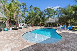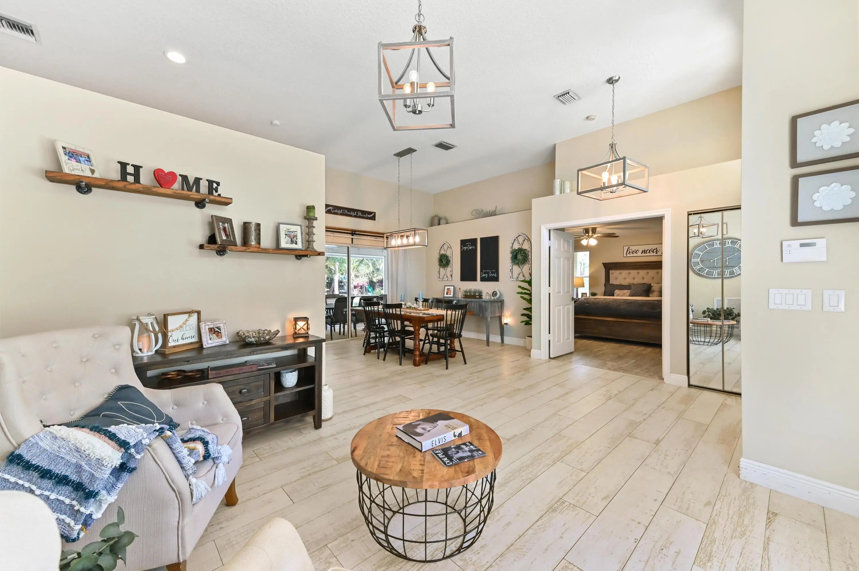 Escape to your own private resort on this sprawling 1.48-acre estate, where modern luxury meets the ultimate outdoor lifestyle. The driveway leads to the double-door entry, welcoming you into an expansive open-concept interior defined by soaring vaulted ceilings and elegant wood-look flooring. The heart of the home is the show-stopping gourmet kitchen, featuring crisp white shaker cabinetry, a massive center island with wood accents and bar seating, a farmhouse sink, and a dedicated bar area. This culinary space flows effortlessly into the family room and dining area, where a sliding glass door frames views of the backyard oasis.