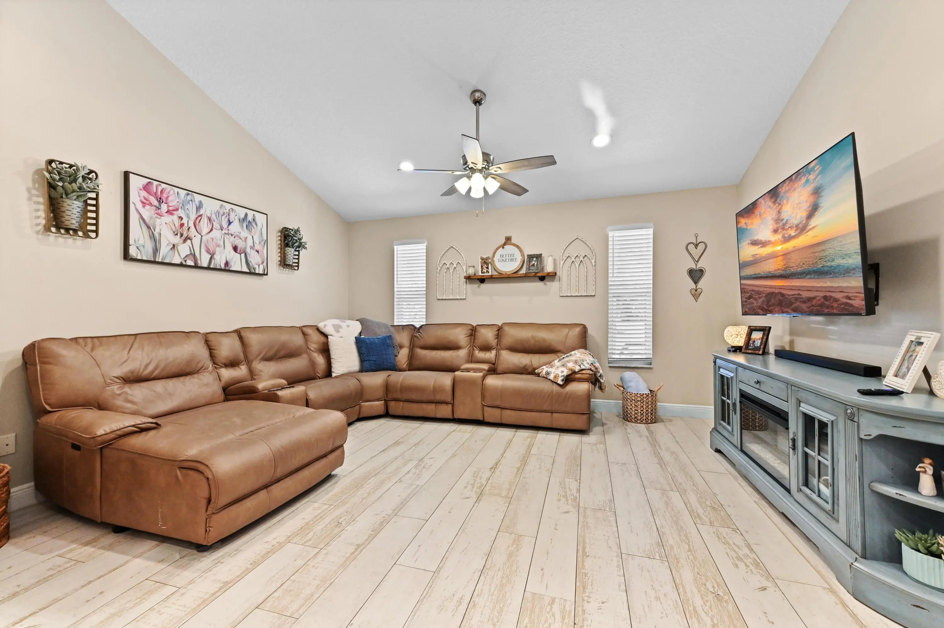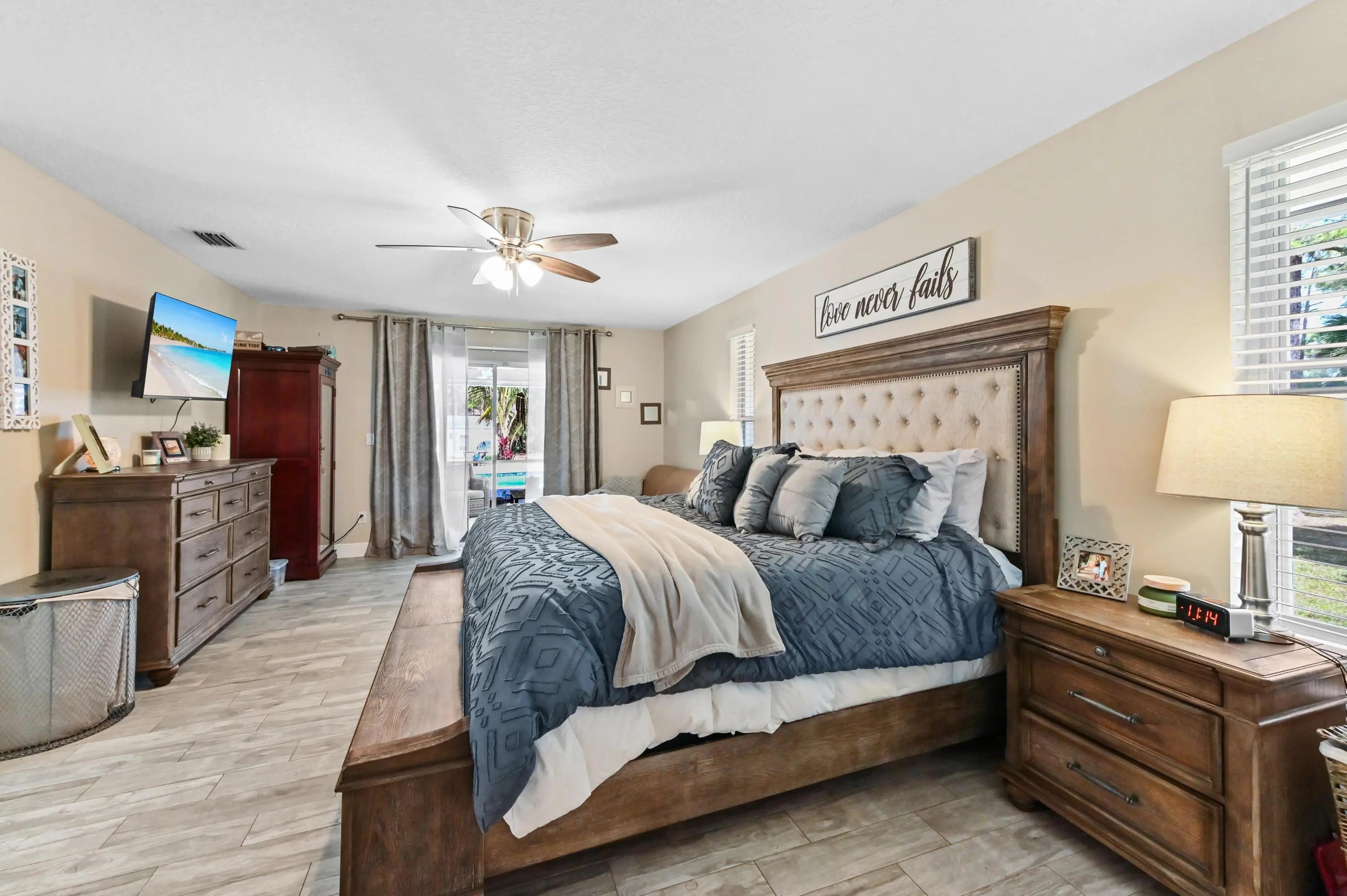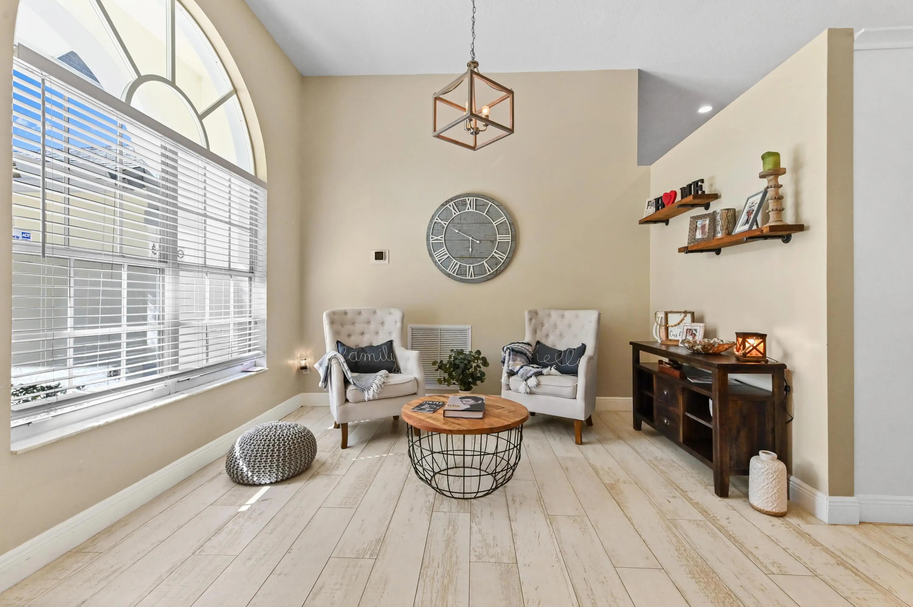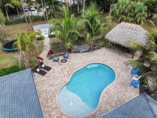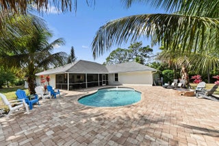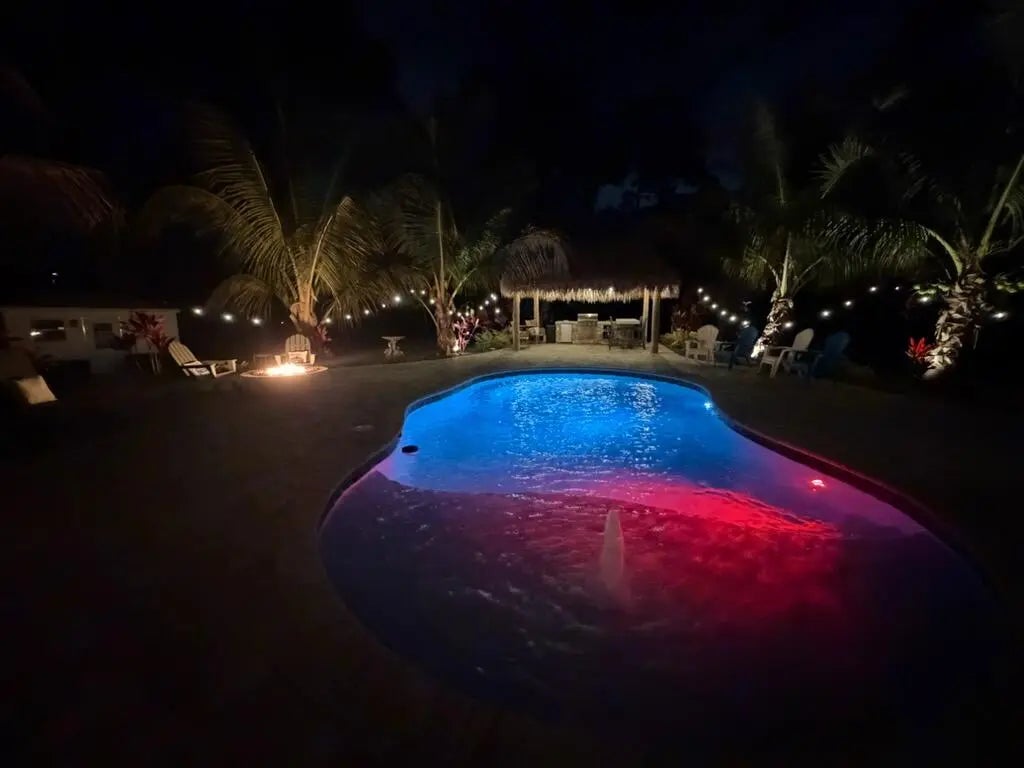 Escape to your own private resort on this sprawling 1.48-acre estate, where modern luxury meets the ultimate outdoor lifestyle. The driveway leads to the double-door entry, welcoming you into an expansive open-concept interior defined by soaring vaulted ceilings and elegant wood-look flooring. The heart of the home is the show-stopping gourmet kitchen, featuring crisp white shaker cabinetry, a massive center island with wood accents and bar seating, a farmhouse sink, and a dedicated bar area. This culinary space flows effortlessly into the family room and dining area, where a sliding glass door frames views of the backyard oasis.