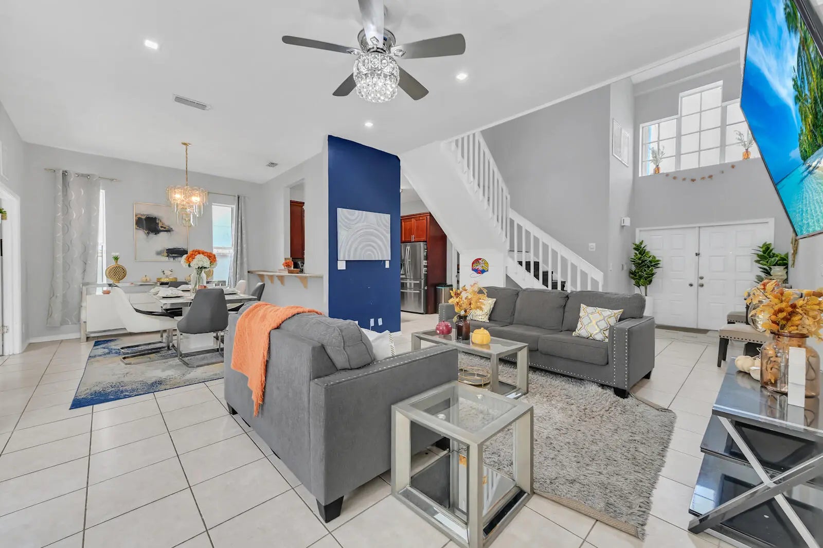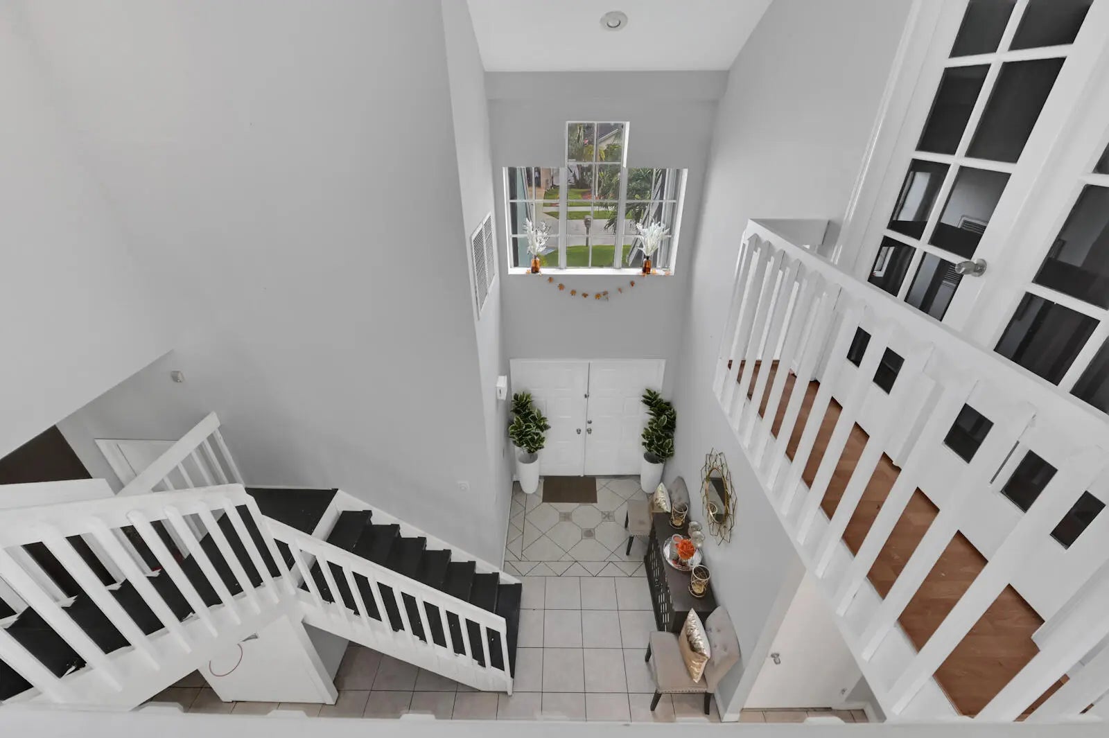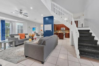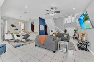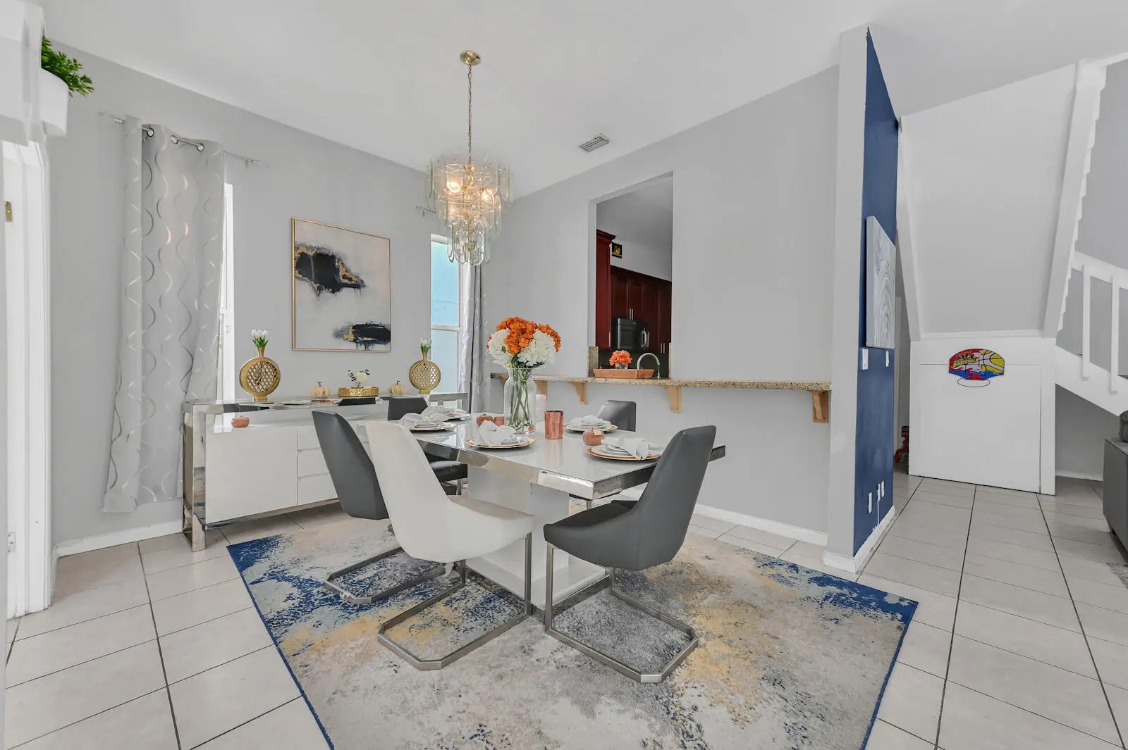 Welcome to this two-story home in the sought-after Foxhall community of West Palm Beach, with 3 bedrooms and 3.1 bathrooms.. The residence makes a dramatic first impression with its two-story foyer and a chic, open-concept main floor defined by polished tile flooring and contemporary gray walls. The spacious living and dining areas are illuminated by recessed lighting and a stylish chandelier, providing the perfect setting for entertaining. The kitchen offers a warm, inviting contrast with its rich, dark wood cabinetry, center island, and granite countertops, seamlessly blending traditional warmth with modern convenience.