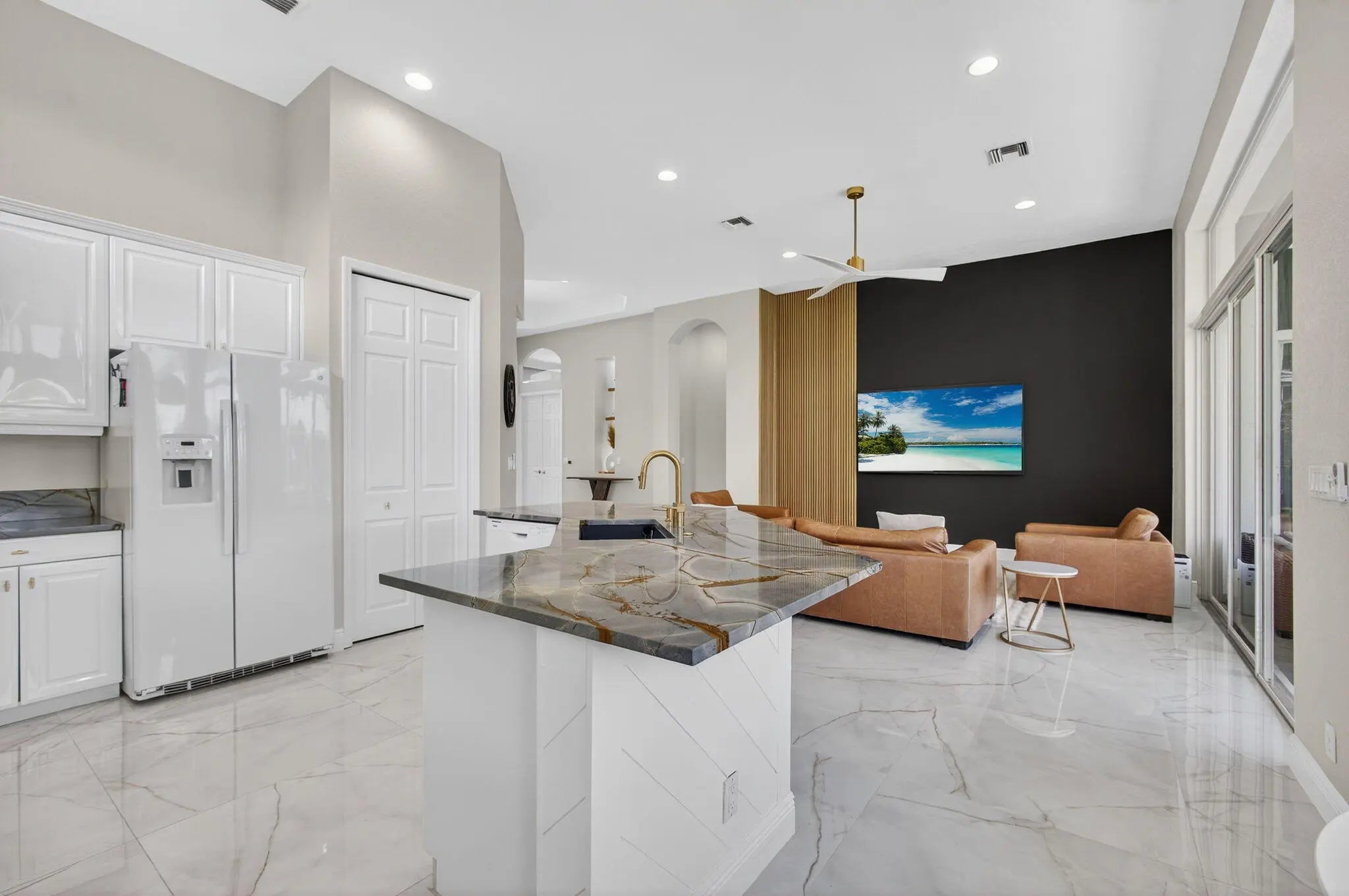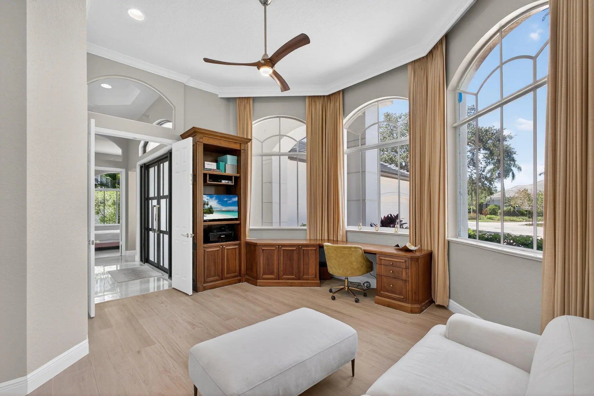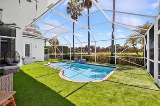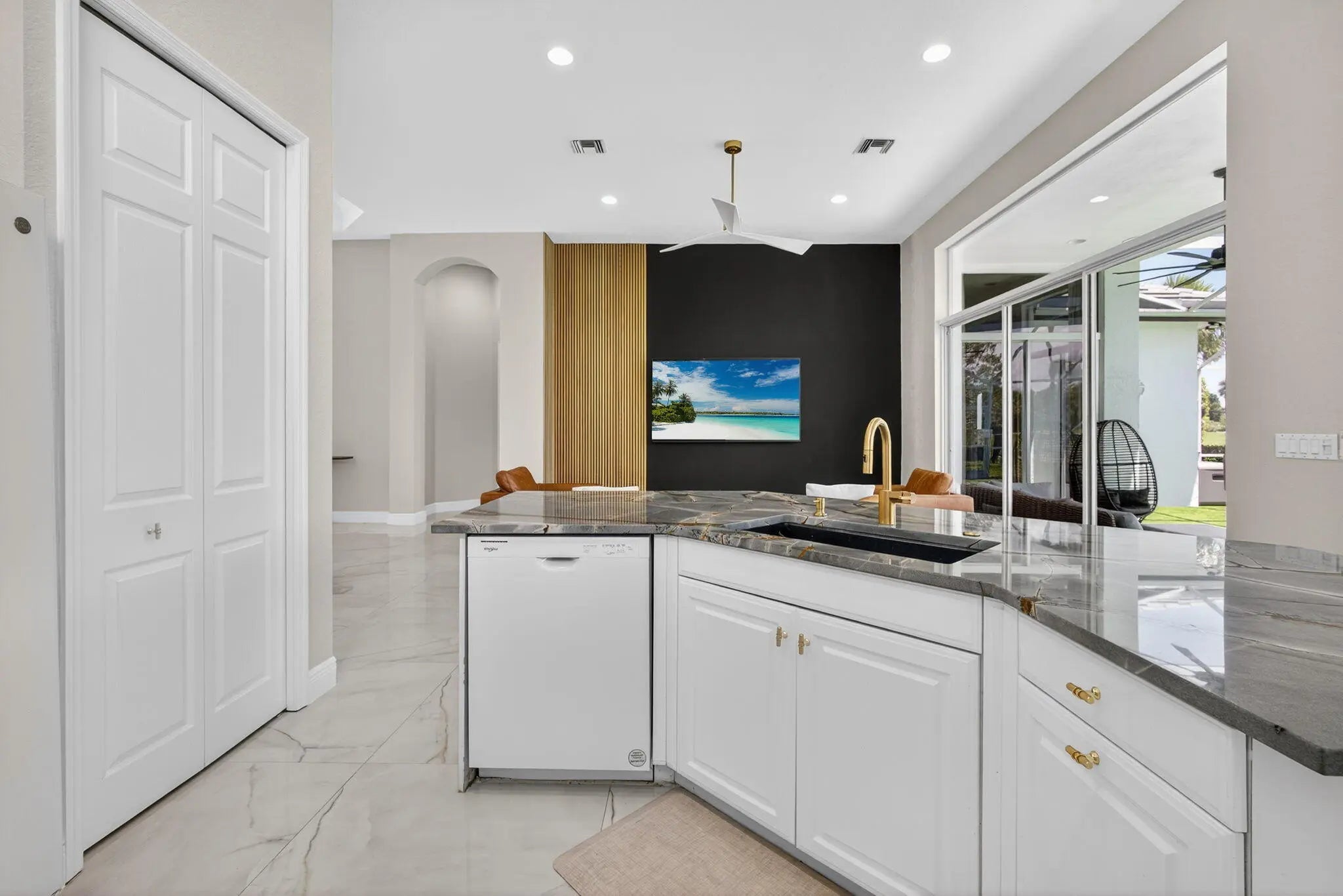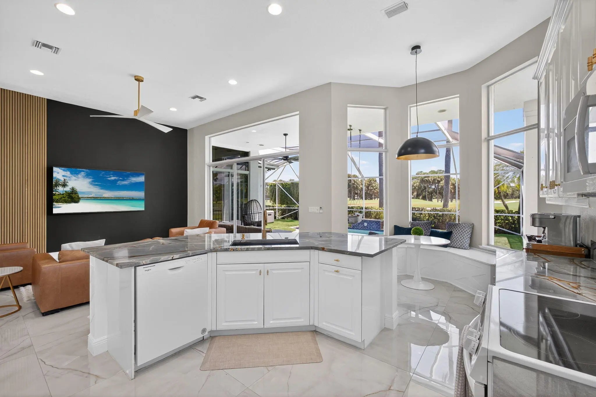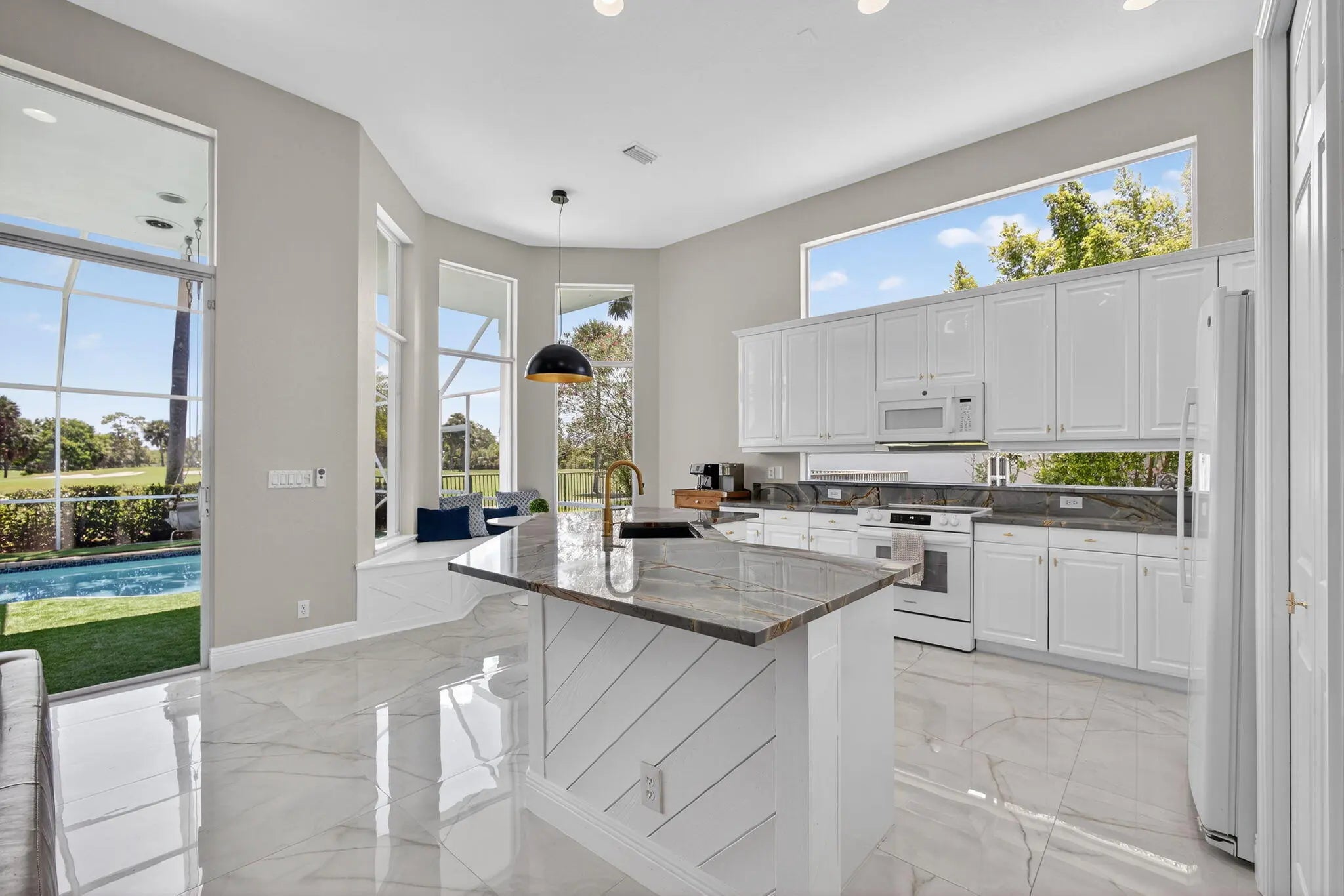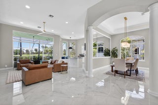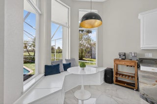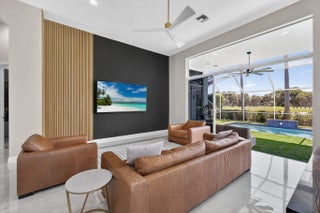 Set on a private cul-de-sac in the boutique Ironhorse community, this updated 4-bedroom, 4-bath ranch styled home offers panoramic views of the preserve, & the renowned Arthur Hills Championship golf course, with no mandatory membership. Be captivated by the 12-ft ceilings with abundant natural light, elegant new porcelain tile floors throughout, a brand-new roof (2024), new A/C, new pool heater, new pool skimmer, new pool pump, new water heater, new impact double front door, new patio turf extended driveway & fresh interior & exterior paint. The open-concept kitchen with new quartzite countertops, a built-in breakfast nook, & a shiplap-accented island, flowing into spacious living areas framed by custom wood panel media wall & sweeping golf views, while the primary suite boasts custom