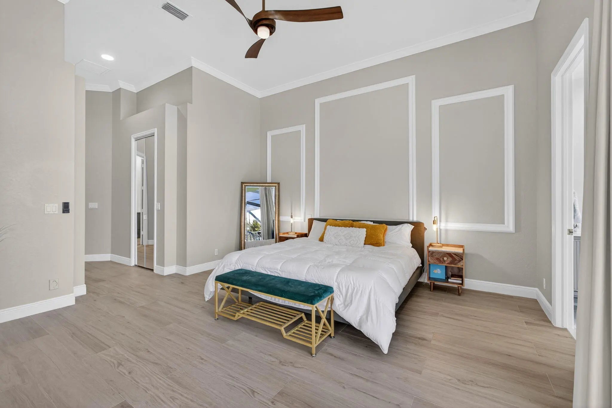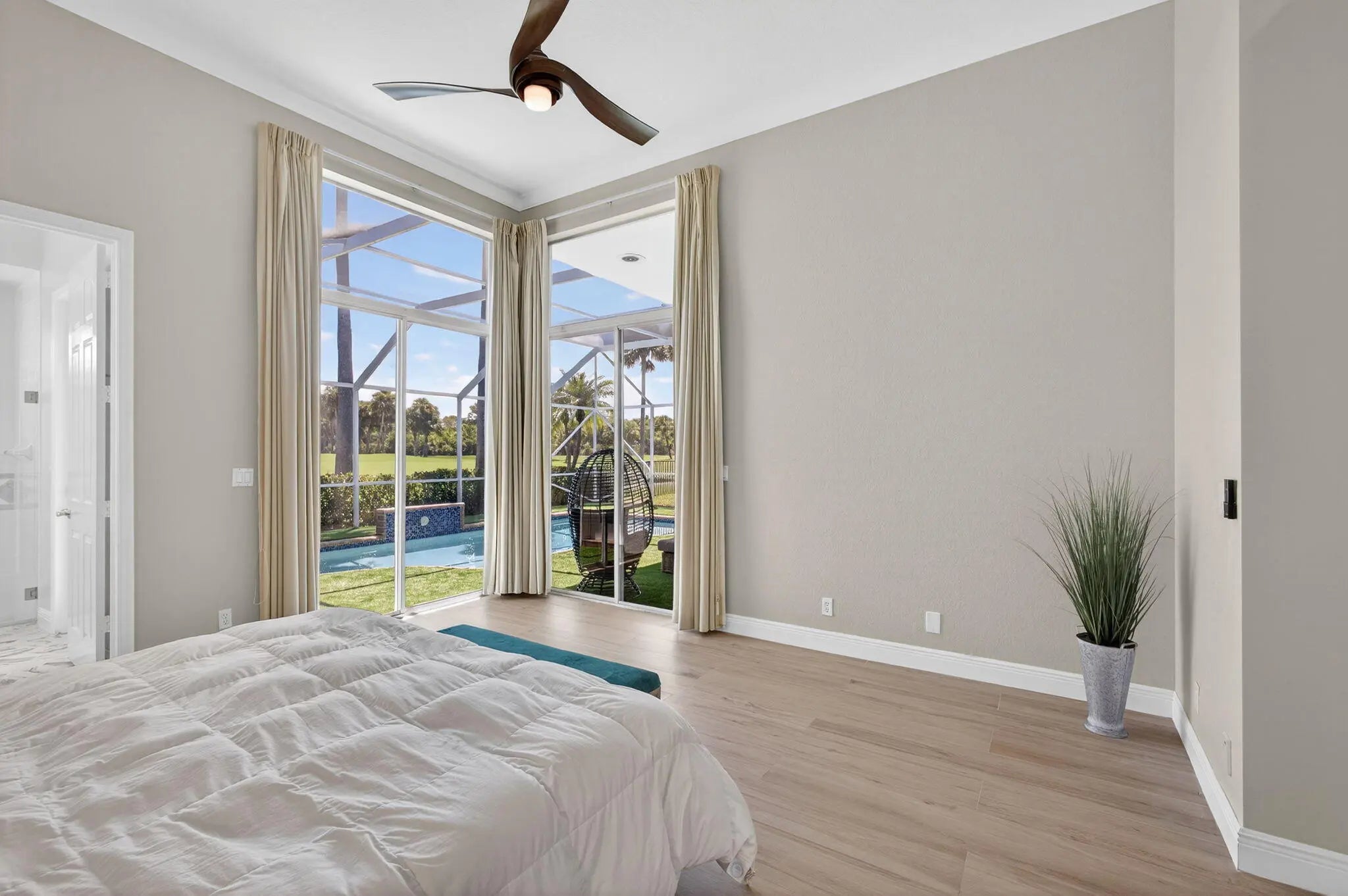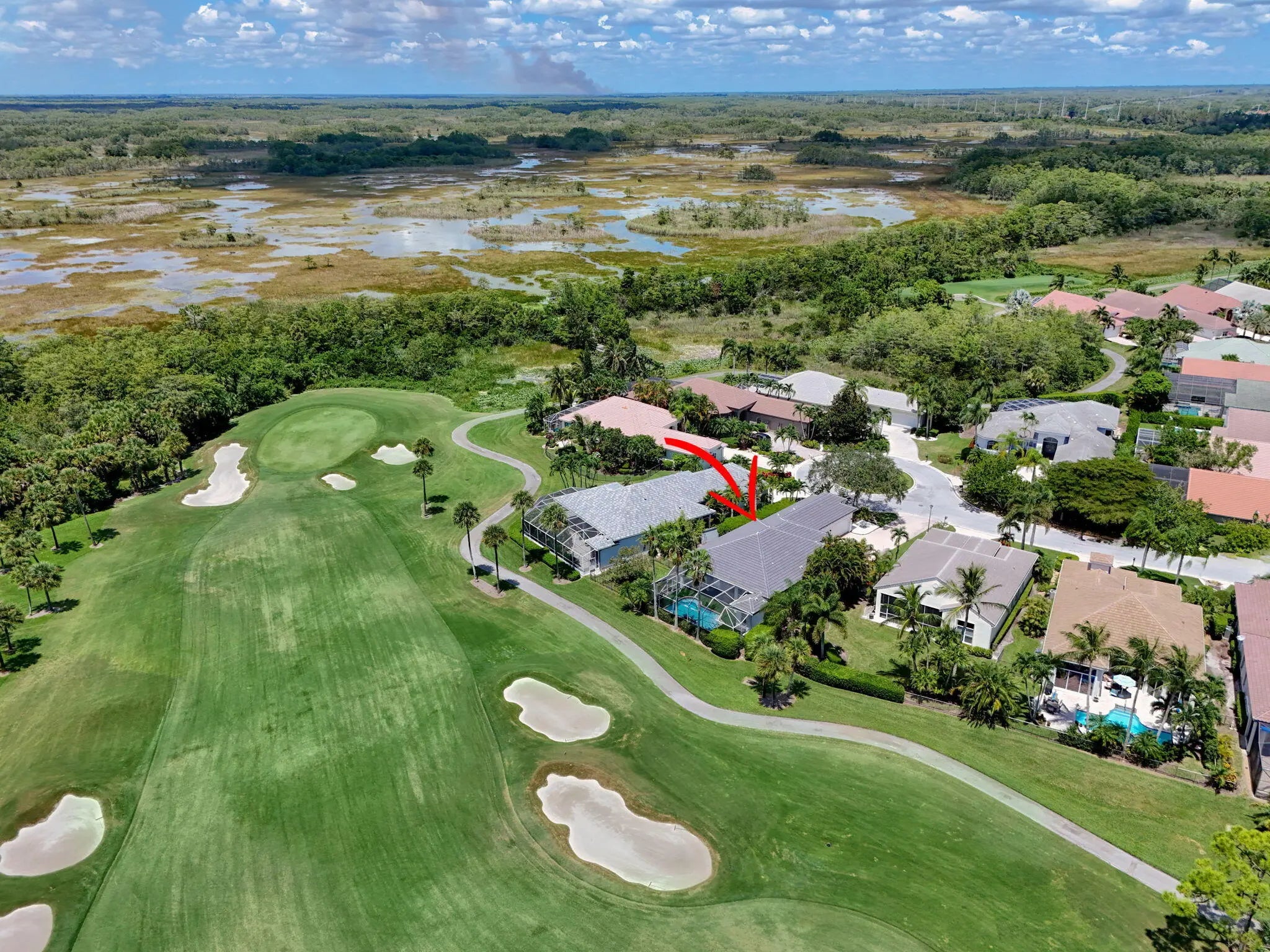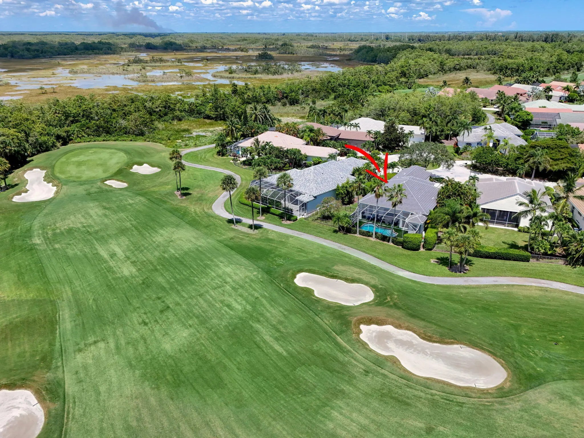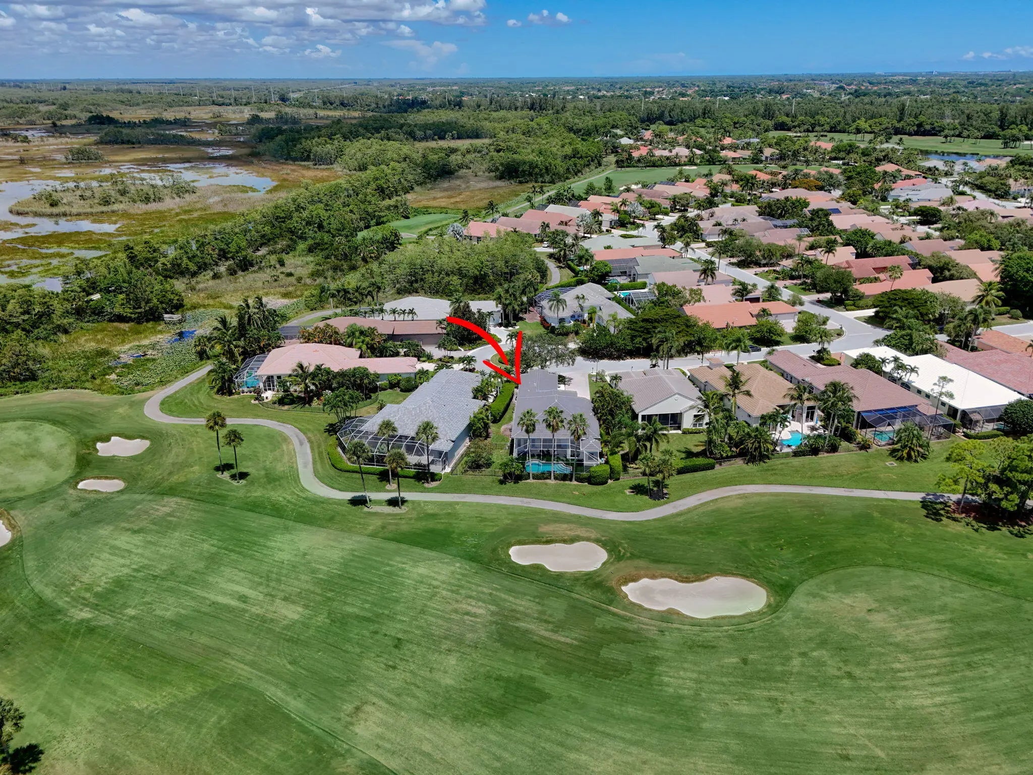 Set on a private cul-de-sac in the boutique Ironhorse community, this updated 4-bedroom, 4-bath ranch styled home offers panoramic views of the preserve, & the renowned Arthur Hills Championship golf course, with no mandatory membership. Be captivated by the 12-ft ceilings with abundant natural light, elegant new porcelain tile floors throughout, a brand-new roof (2024), new A/C, new pool heater, new pool skimmer, new pool pump, new water heater, new impact double front door, new patio turf extended driveway & fresh interior & exterior paint. The open-concept kitchen with new quartzite countertops, a built-in breakfast nook, & a shiplap-accented island, flowing into spacious living areas framed by custom wood panel media wall & sweeping golf views, while the primary suite boasts custom