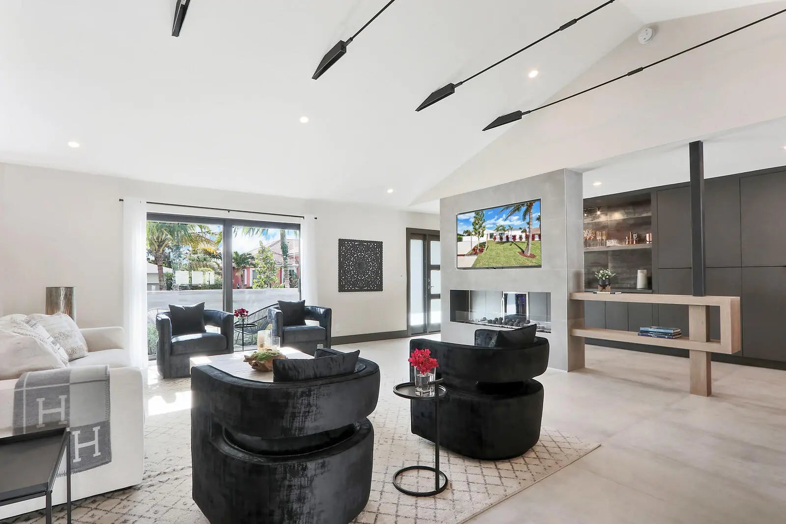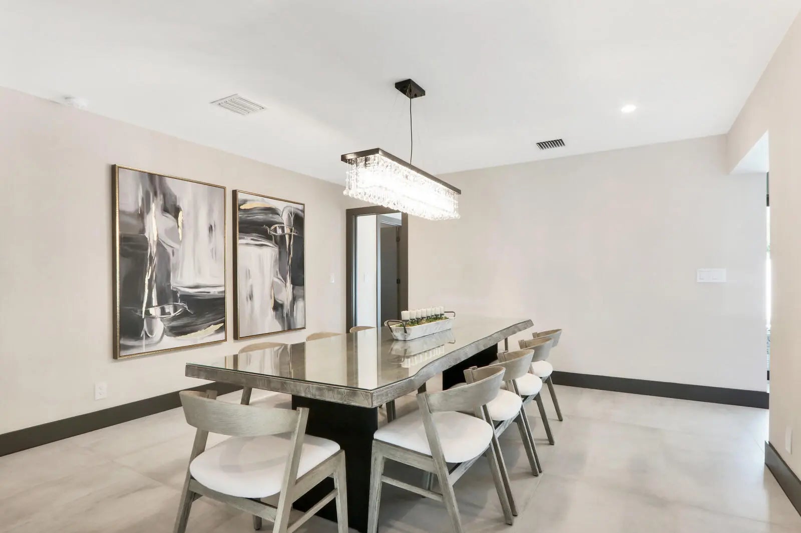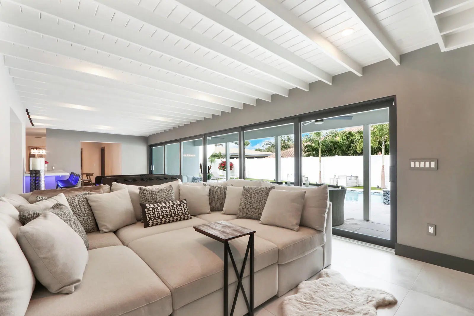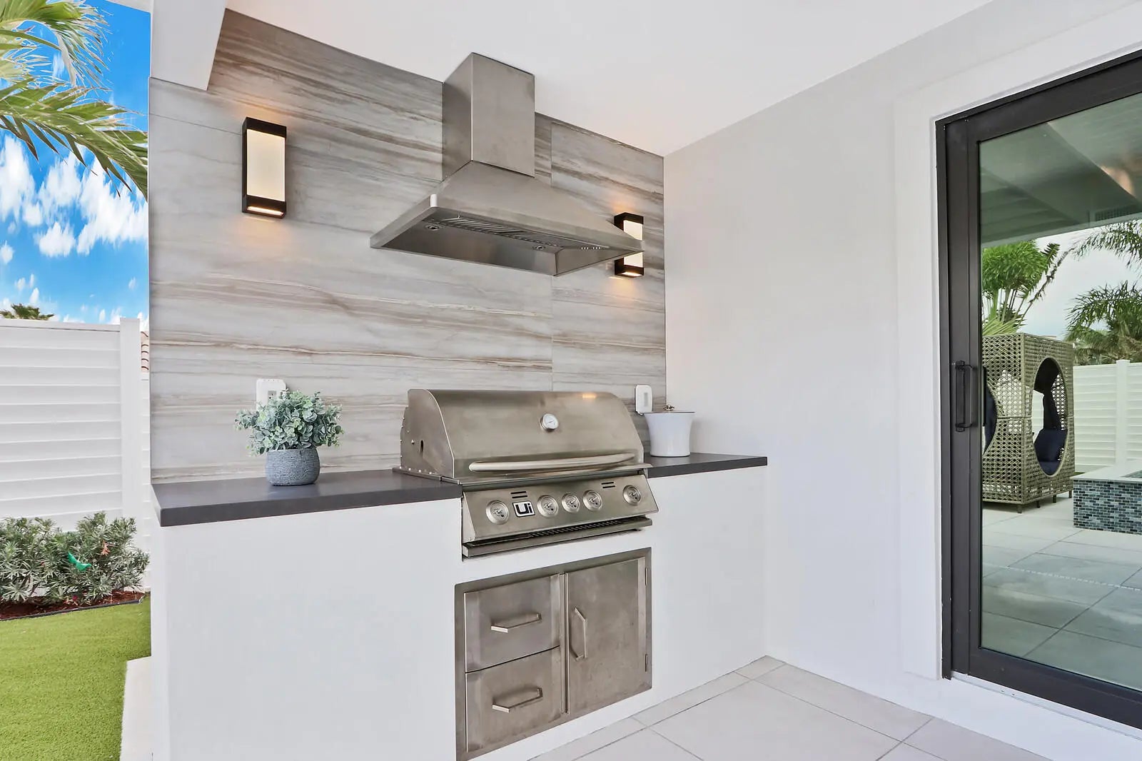 Welcome to your seaside retreat. Enjoy this professionally designed and decorated beachside paradise bringing the Northwest feel to the Juno seaside,.There is not a detail missed in this luxurious home.Sleeps 14, dining for 20. Restoration Hardware inspired decor throughout including furnishings, Italian imported porcelain concrete look flooring, and kitchen and bath appointments.The spacious and bright double living area is conducive to large gatherings featuring a double sided fireplace, entry wet bar and two separate bar top dining areas.. Entertainment room with 86'' tv and foosball table opens out into the fabulous covered outdoor living space. Kitchen features Thermadore Integrated appliances, quartz counter tops, ample custom cabinetry,printer/charger bar work station,built-in oven