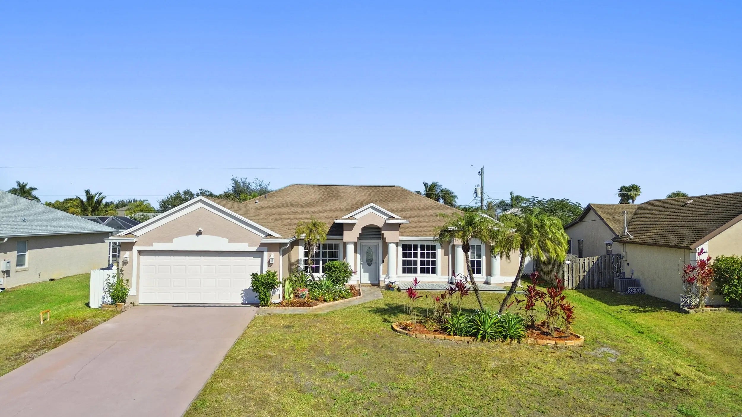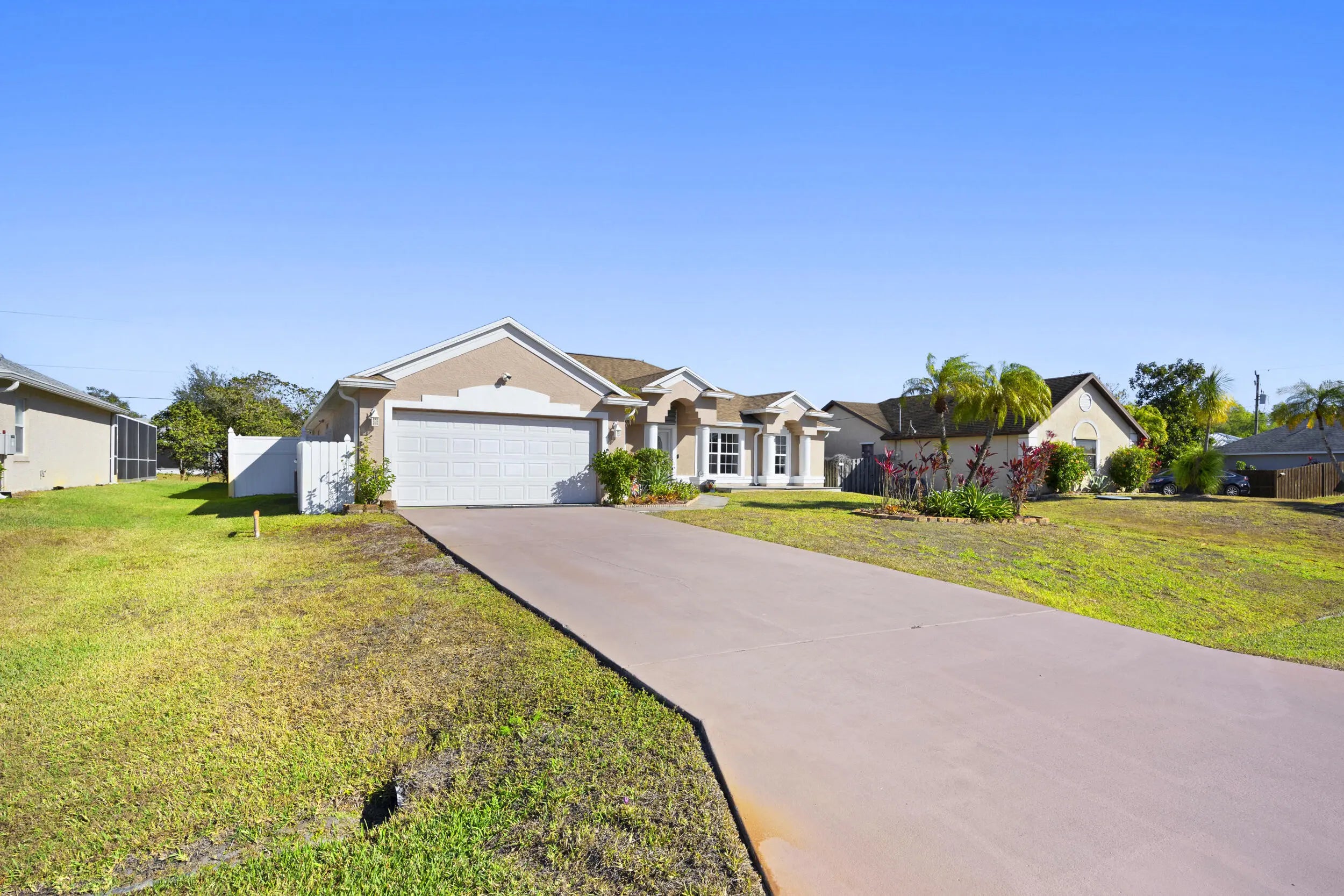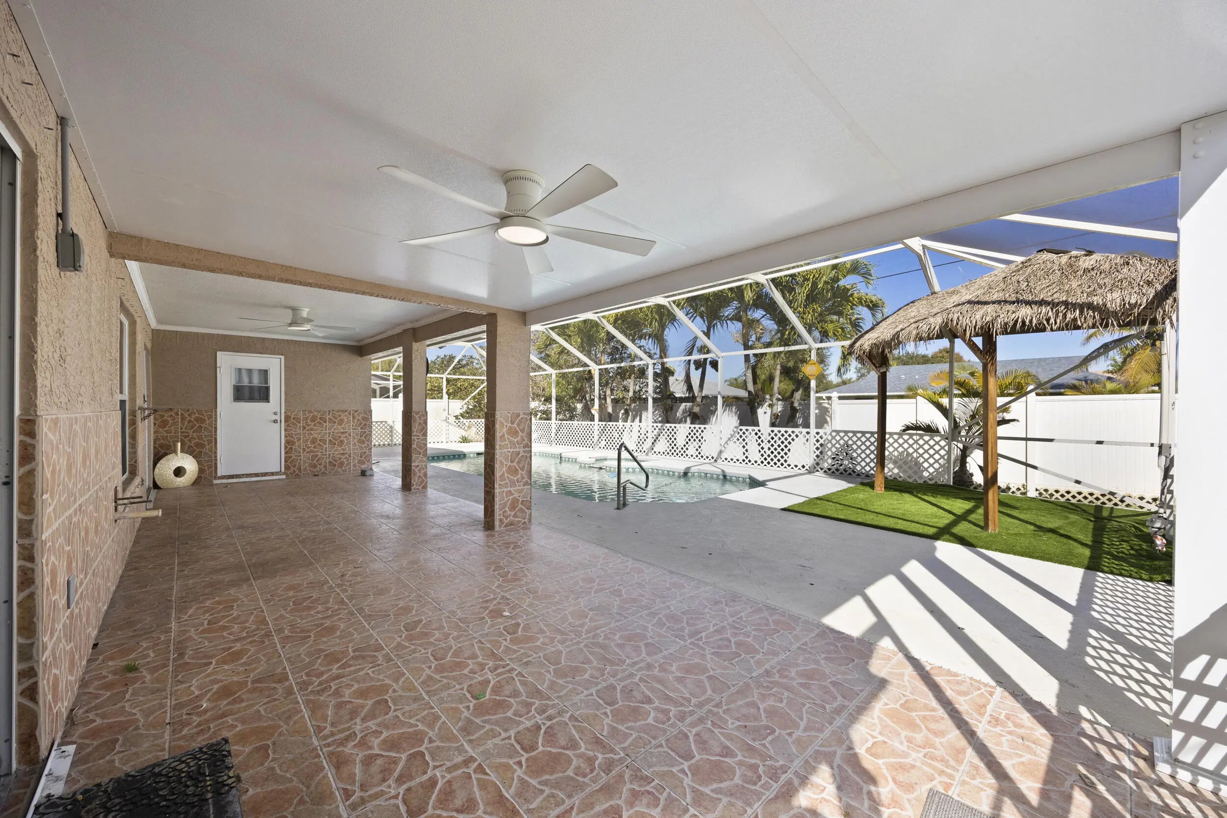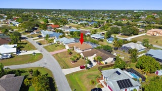 Located in the desirable South Bend neighborhood of Port St. Lucie, just minutes from the C24 canal boat ramp with ocean access, this spacious 4-bedroom, 3-bath pool home offers an open layout, vaulted ceilings, skylights, and a functional split-bedroom design. Enjoy a private screened pool and patio with cabana bath, perfect for entertaining, plus a tiki bar and outdoor TV setup. The primary suite features a soaking tub, separate shower, and walk-in closet. Updates include a 2021 roof, 2021 A/C, and smart home features. Zoned sprinkler system on well. No HOA allows room for boat or RV parking. Close to shopping, dining, parks, and major roadways.