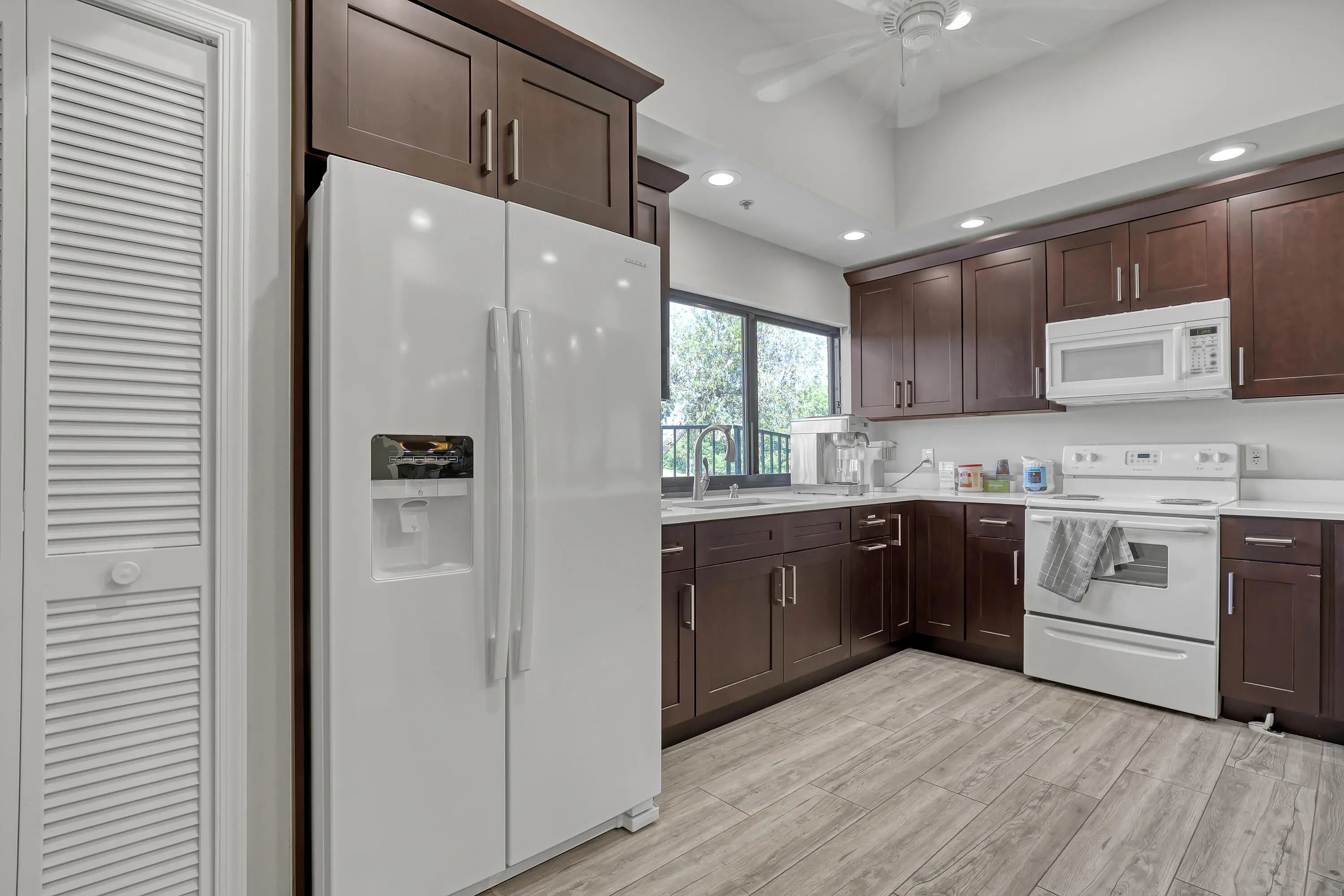 Spacious 2-bedroom, 2-bath first-floor condo located in the desirable Aberdeen Coves of Boynton Beach, NO Equity Membership, centrally located near shopping, restaurants, worship, golf, parks, and beaches. Convenient parking spot directly in front of the unit is included. 18'' tile flooring throughout with a welcoming, spacious entryway. The layout includes a den, room for a kitchen table and a formal dining area. Custom wood plantation shutters highlight the dining room with serene lake views through the large sliding glass doors. The master bedroom features unique faux suede walls, a large walk-in closet, double sink vanity, walk-in shower and separate ''water closet'' for privacy. The kitchen has two pass-throughs, the larger of which has access to the dining area.