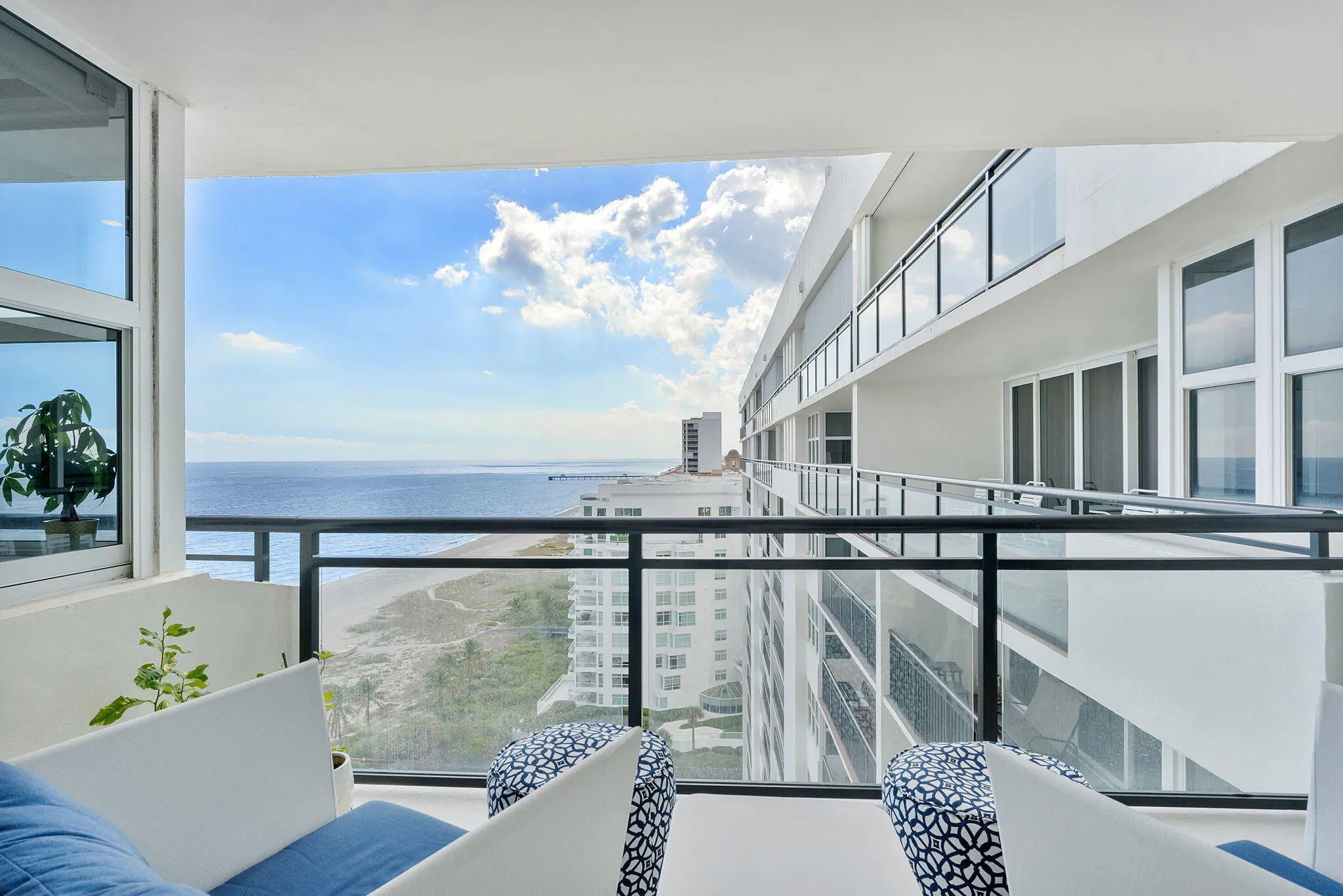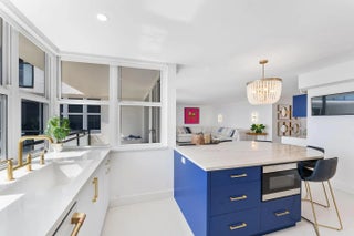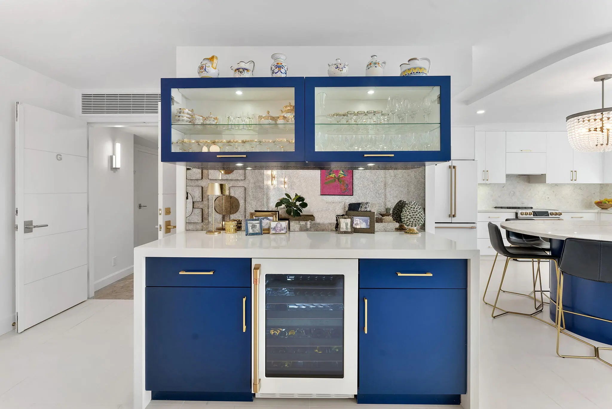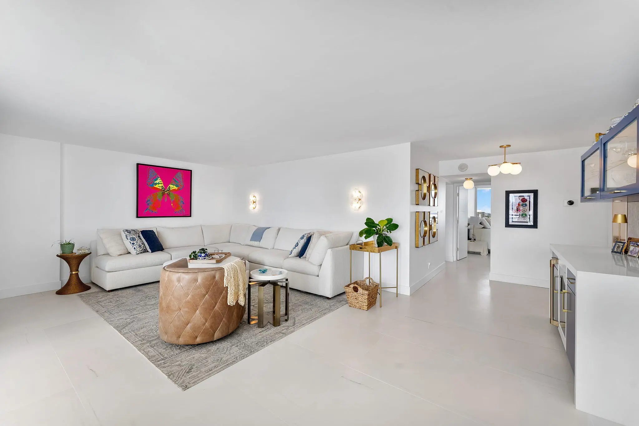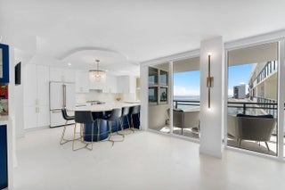 Experience elevated coastal living in this stunning Lower Penthouse residence, beautifully renovated in 2023 with unique high-end finishes and thoughtful design throughout.Located in Whitehall, a luxury oceanfront high-rise in Boca Raton, this exceptional home offers the perfect blend of modern sophistication and resort-style amenities.Step into a large, bright open-concept living and dining area featuring large format dolomite porcelain floor tile and designer lighting that create a warm yet contemporary ambiance. The white matte and gold tone kitchen is the centerpiece of the home, showcasing a striking quartzite island, custom cabinetry, and elegant water-cut marble accents. Entertain effortlessly at the custom-built bar, complete with a wine fridge, cabinetry, and open shelving