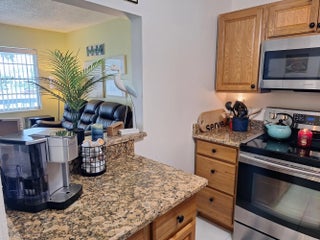 A rare opportunity to own a turnkey, pet-friendly unit that has a water view facing the eastern sunrise. Fully furnished, with everything you want or need. From the moment you enter, you will notice the comfort and pride of ownership, which has been geltly used as a winter get away. Beautiful ceramic tile floors throughout the entire living space, a kitchen that has been upgraded with top-of-the-line Samsung appliances and granite countertops, and everything that one would need, pots, pans, dishes, glasses, a Keurig coffee maker, a toaster oven, a microwave, etc. A spacious bedroom with a king-size bed flows to the screened-in patio that faces east, which has water views, to relax with a coffee or tea. This unit is a pleasure to visit and will make one lucky family very happy.