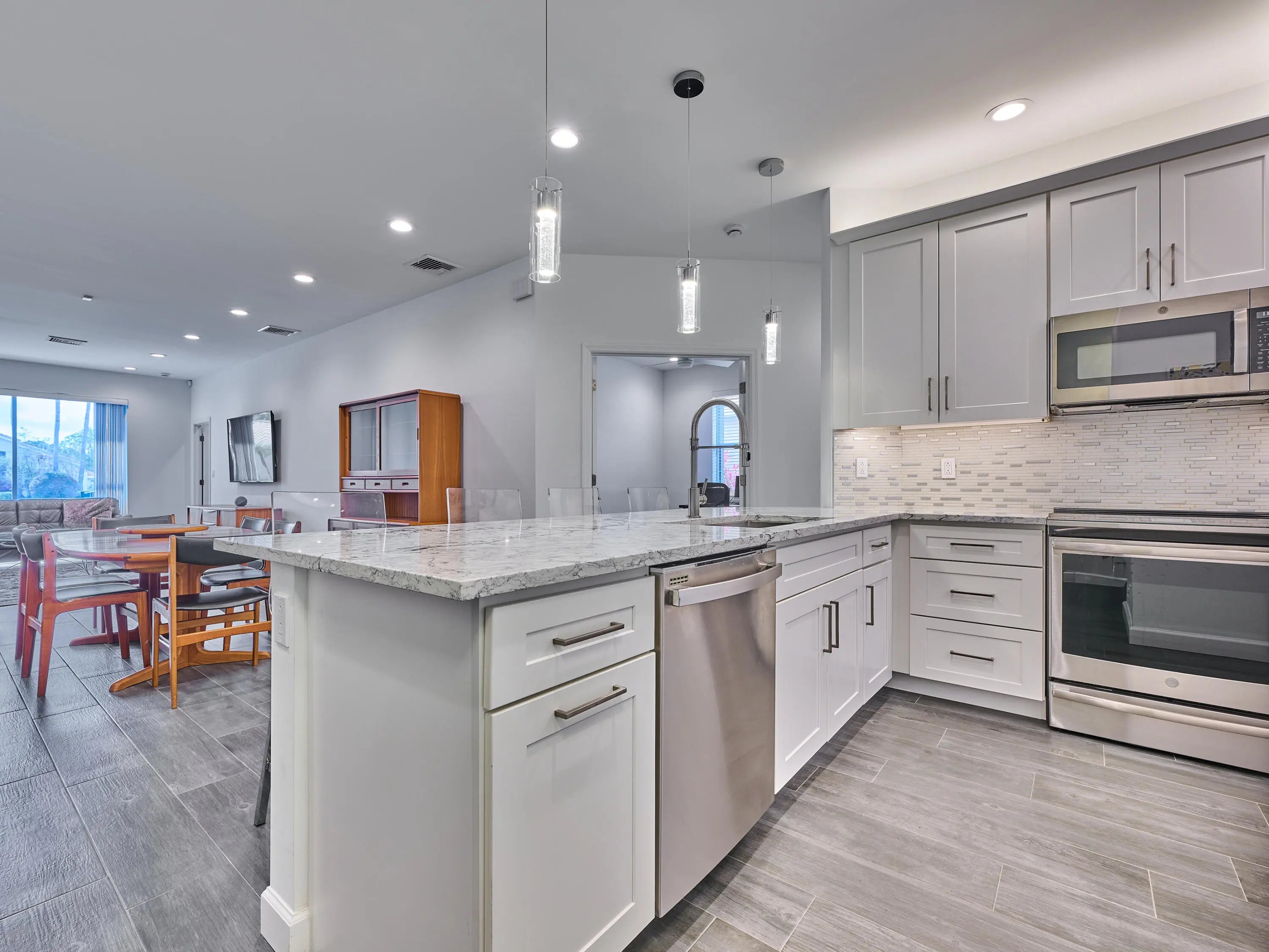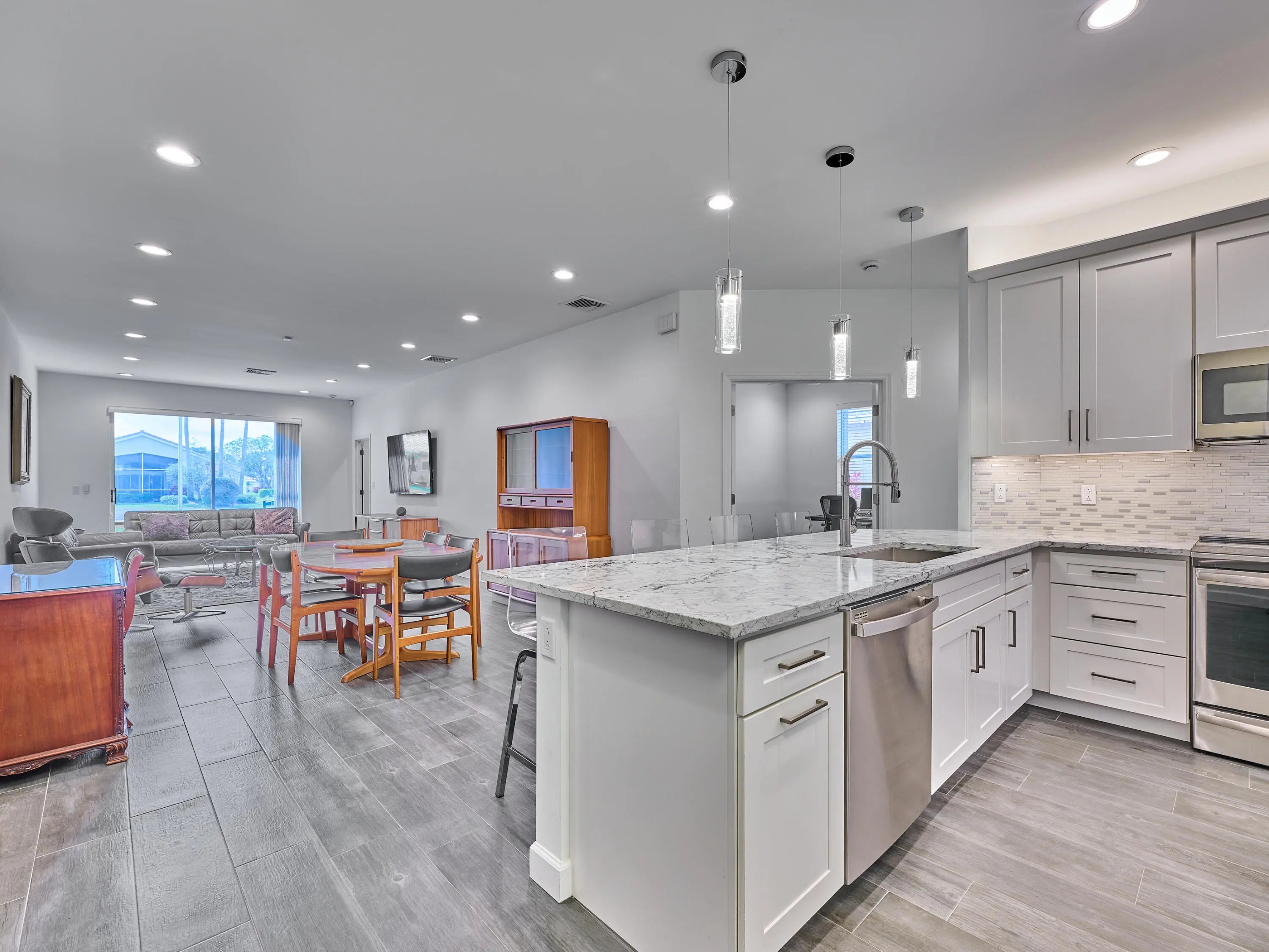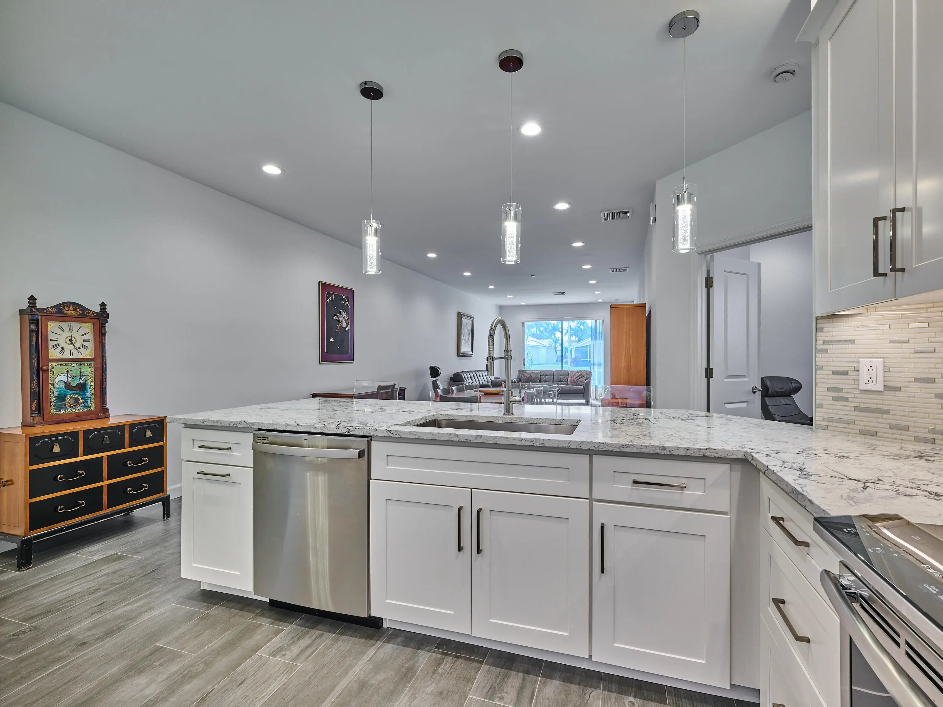Set within the gates of the highly sought-after active adult community of Majestic Isles, 5786 Island Reach Lane presents a rare opportunity to own a fully reimagined waterfront villa where design, quality, and lifestyle converge.Meticulously updated and impeccably maintained, this residence showcases a refined, open-concept floor plan designed for effortless living and elegant entertaining. The heart of the home is a stunning chef's kitchen appointed with timeless shaker cabinetry, quartz countertops, a striking glass tile backsplash, and newer GE stainless steel appliances. Abundant recessed lighting enhances the home's clean architectural lines and creates a warm, sophisticated ambiance throughout.