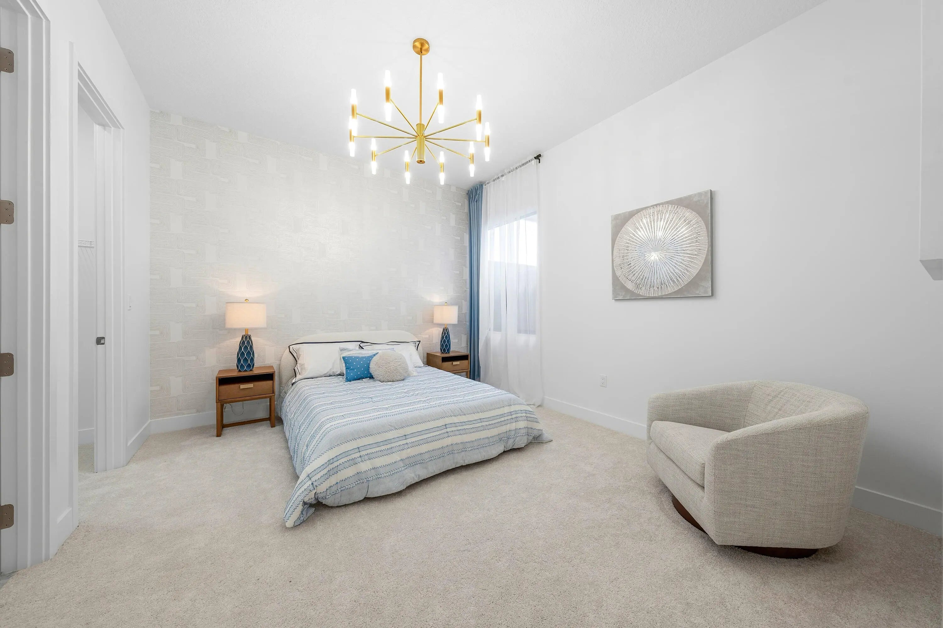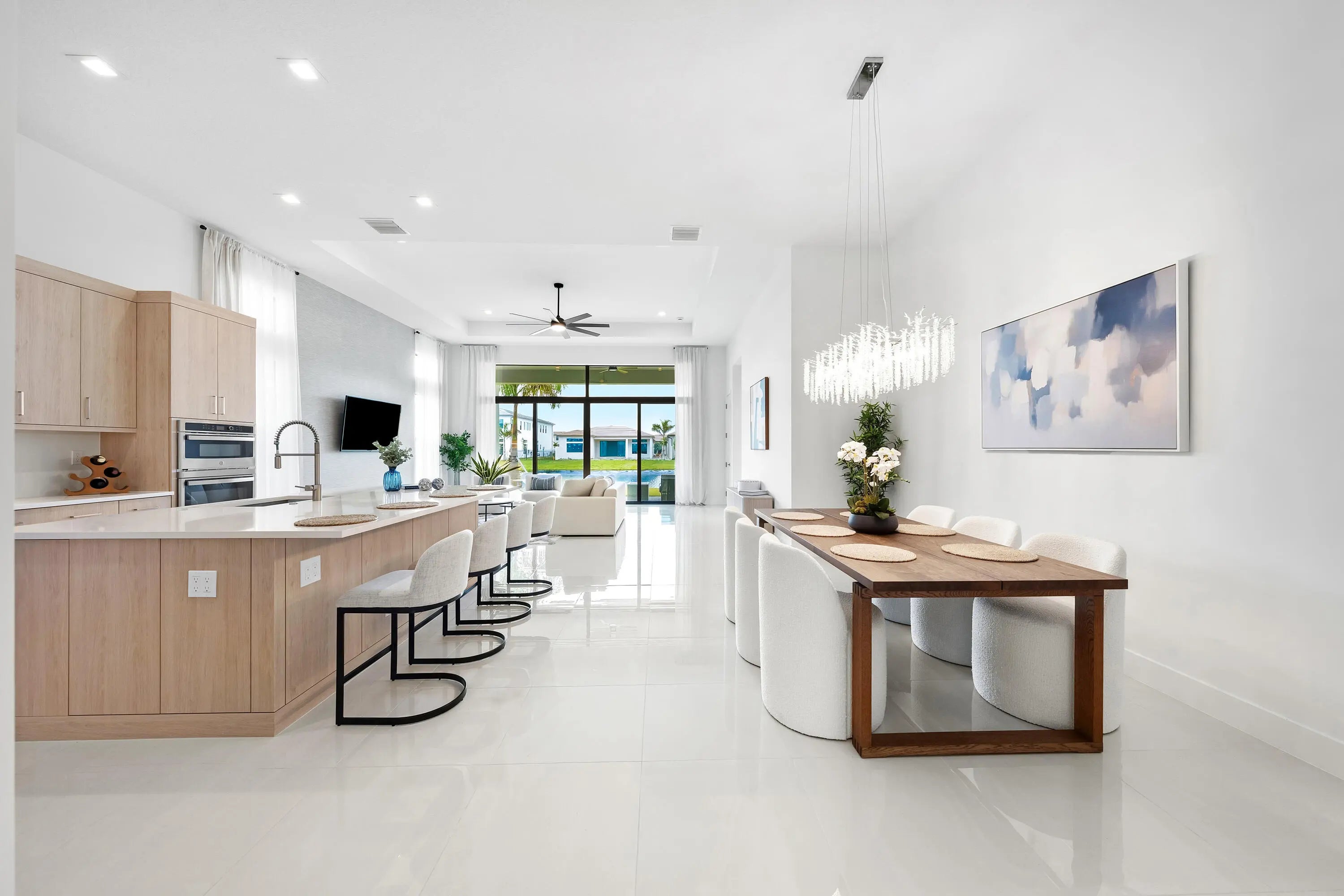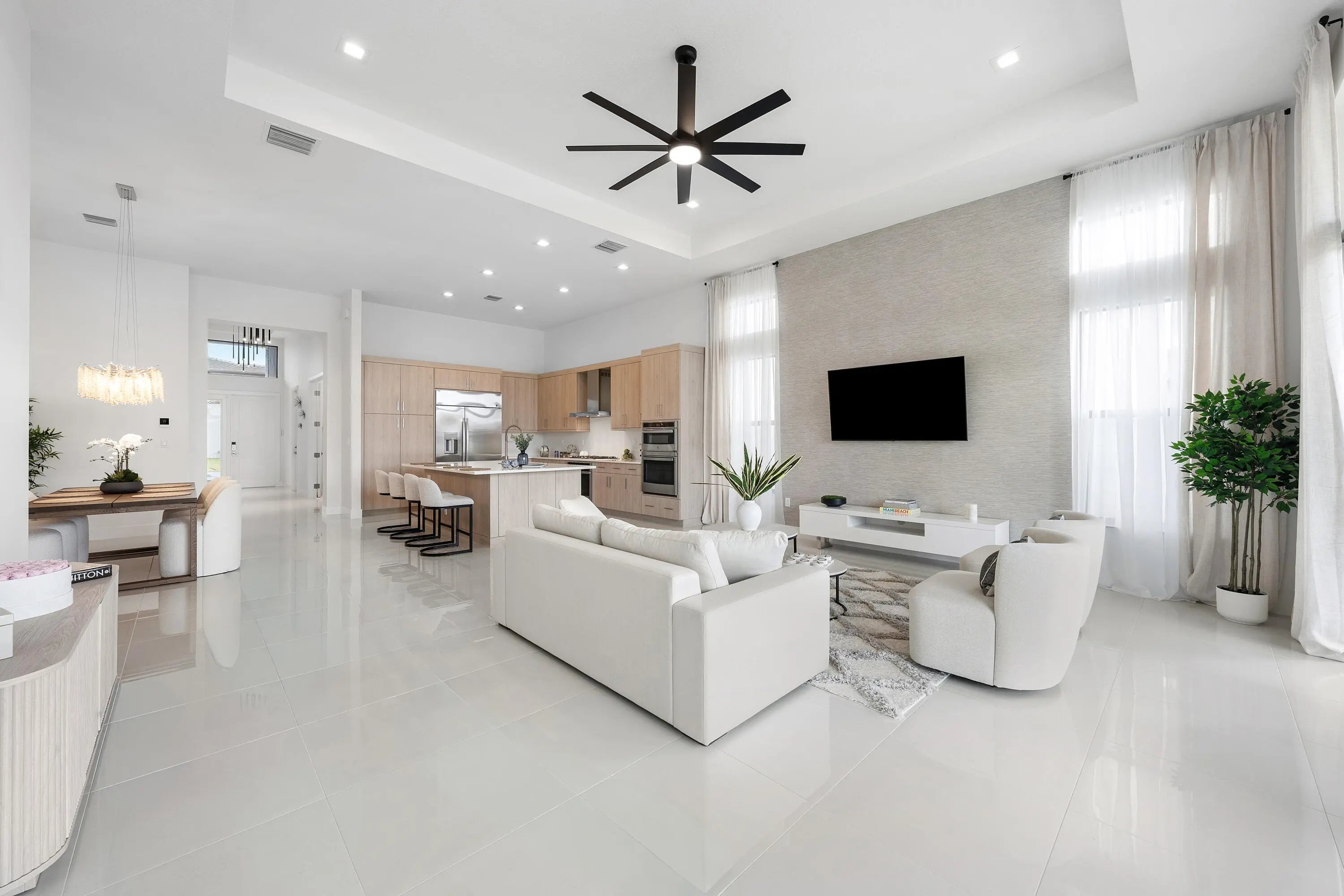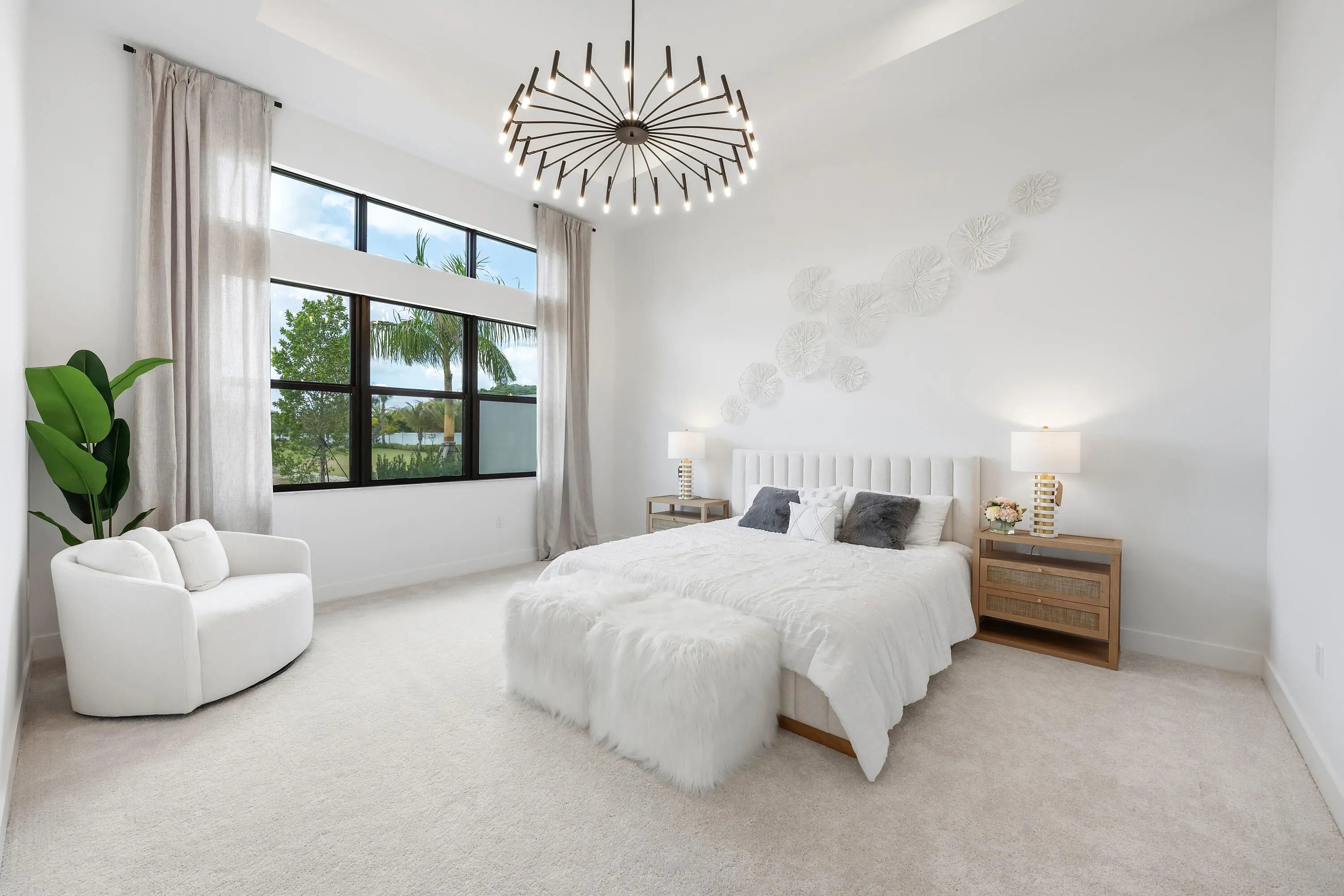 Welcome to refined modern luxury, resort-style living in the prestigious, guard-gated community of Lotus Edge in Boca Raton, where the grass and vegetation makes you feel like your in a tropical resort. This exceptional Bermuda model 3-bedroom, 3.5-bathroom residence, never before lived in, blends clean architectural lines, soaring ceilings, and seamless indoor-outdoor flow with serene water views. From the moment you enter, you're greeted by expansive open living spaces filled with natural light and enhanced by oversized windows, designer lighting, and polished tile flooring throughout the main areas. The thoughtfully designed floor plan offers both functionality and elegance, ideal for everyday living and effortless entertaining.