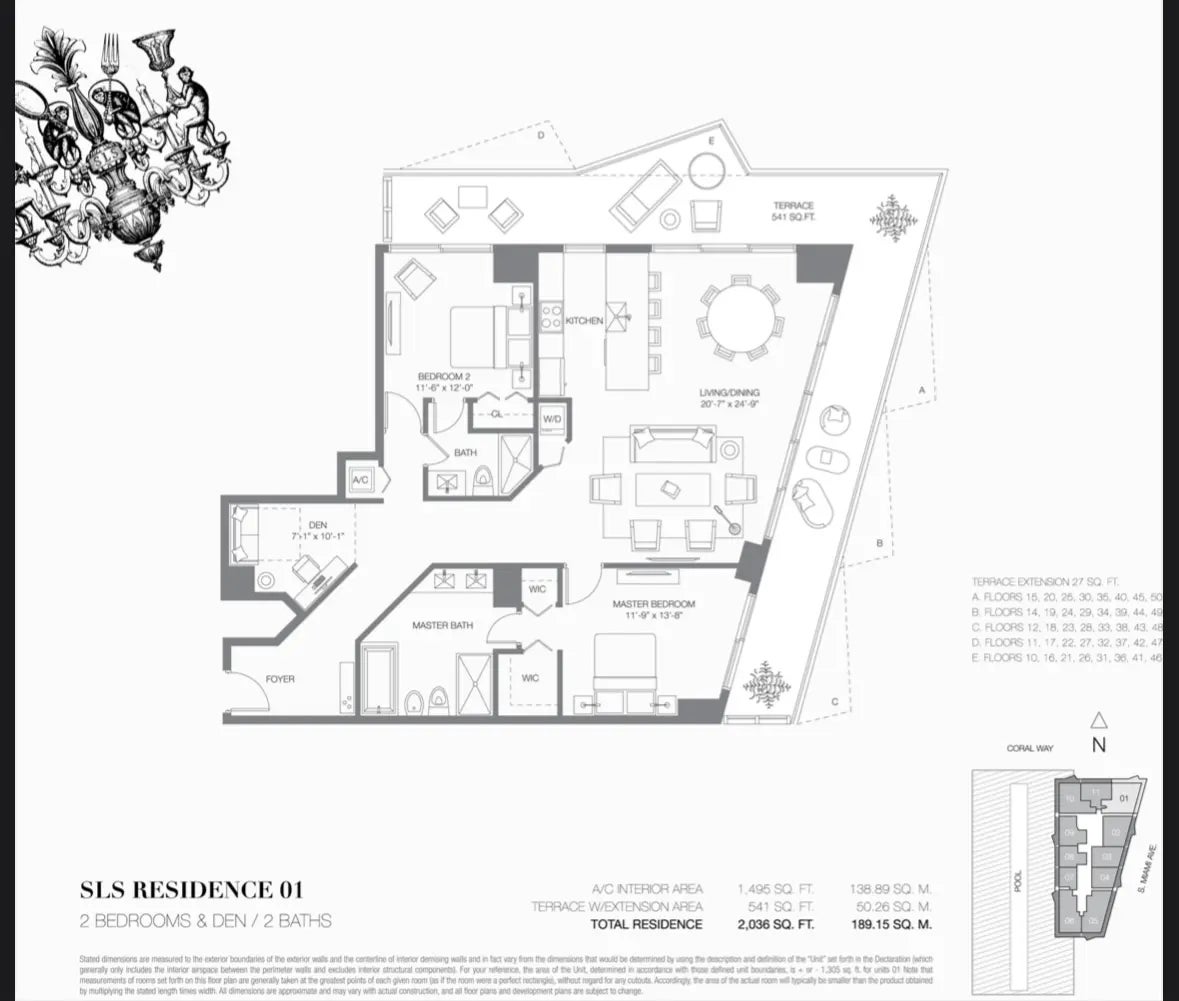 Desirable corner 2-bedroom + den on the 24th floor of SLS Brickell with abundant natural light and stunning skyline and water views throughout the expansive floor-to-ceiling windows. Flexible den ideal for office or guest space. Modern finishes include a contemporary kitchen with Sub-Zero appliances, sleek cabinetry, and well-appointed baths. Open layout perfect for living and entertaining. Residents enjoy resort-style, hotel amenities including rooftop and heated pools with private cabanas, full-service spa, state-of-the-art fitness center, concierge, valet, 24-hour security, restaurant Bazaar Mar by Jose Andres, Fi'lia by Michael Schwartz-bar/lounge and club rooms, business center, and one assigned parking space. Located in the heart of Brickell, steps to Brickell City Centre.