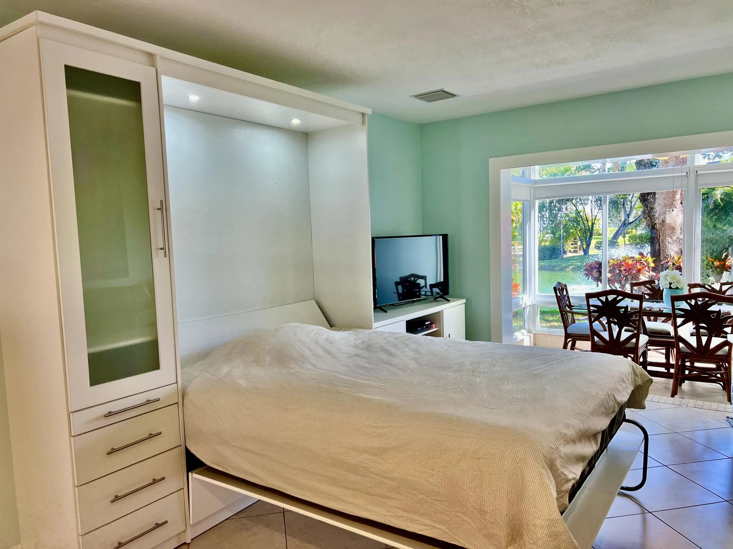 Price to sell! Rare and gorgeous garden condo with breathtaking lake views in Hawaiian Gardens 55+ Community - Phase 2. Fully furnished and truly turnkey, this immaculate unit is completely remodeled with a fully equipped open kitchen. Murphy bed and custom wall unit ($6,000 value) included. All special assessments paid ($10,000). New roof (2025), 50-year inspection completed, building freshly repainted, staircases redone and all other repairs. unit can be rented with restrictions. Move-in ready!
